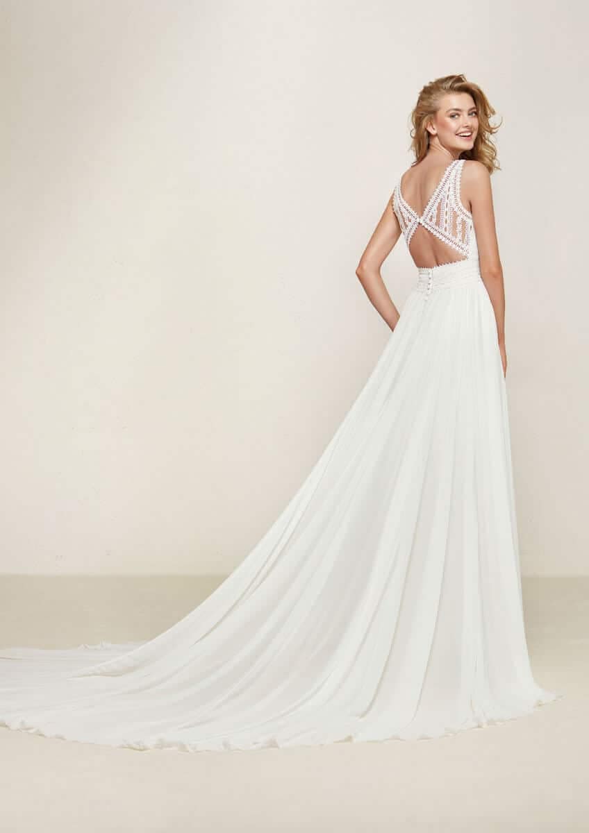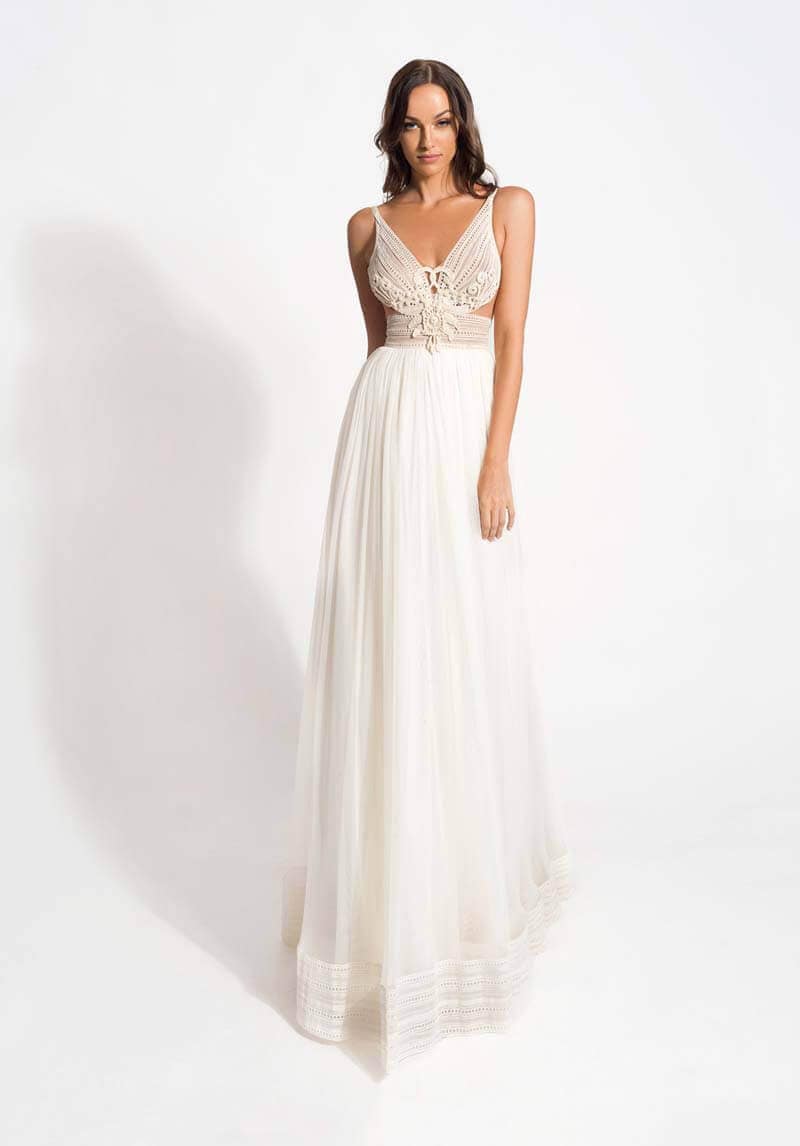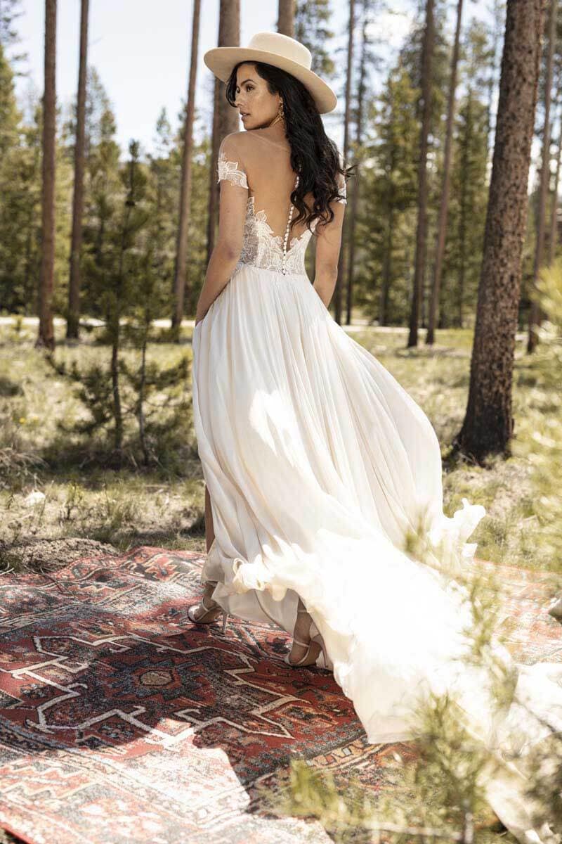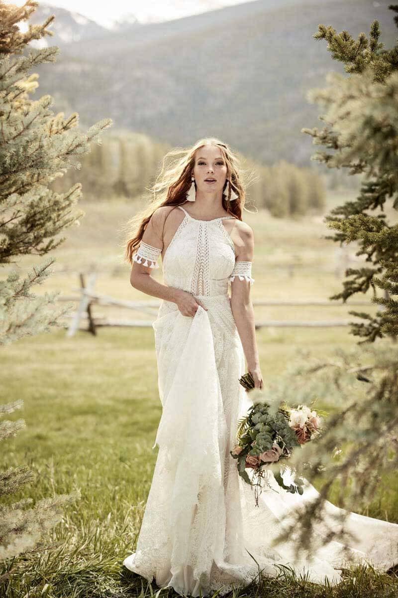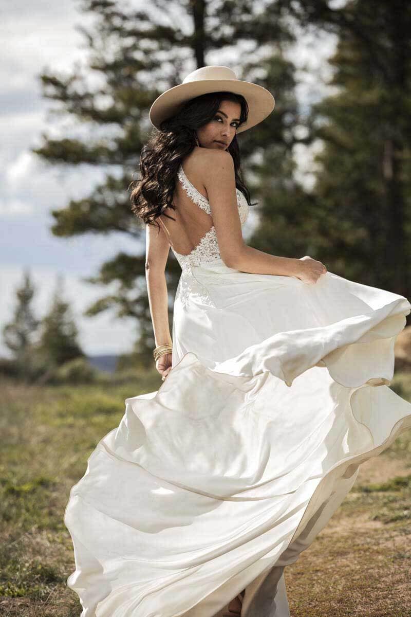 Tiefe Rückenausschnitte mischen sich mit Bohoelementen und schaffen so lufitge Brautkleider, die perfekt für eine Hochzeit am Meer sind.