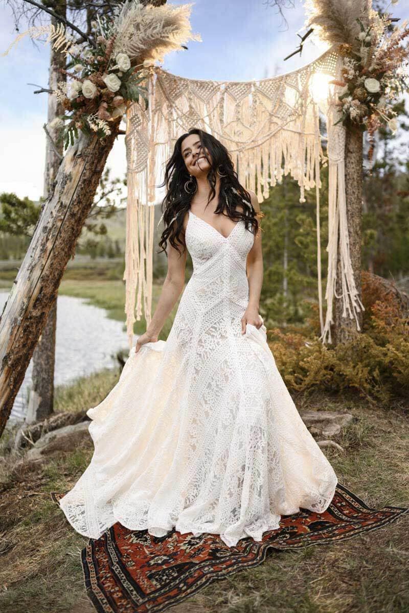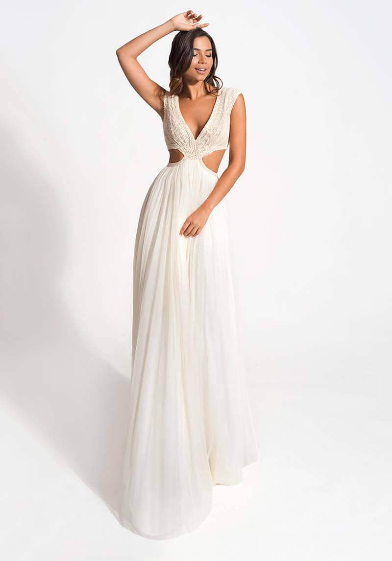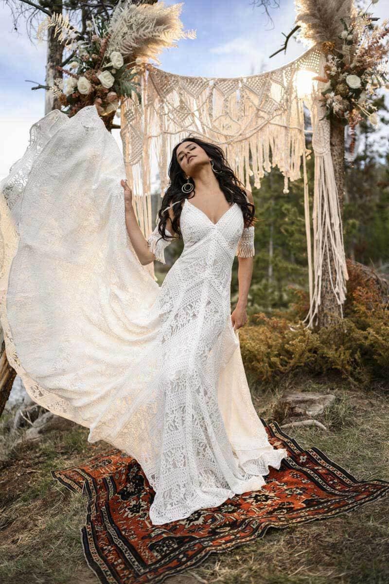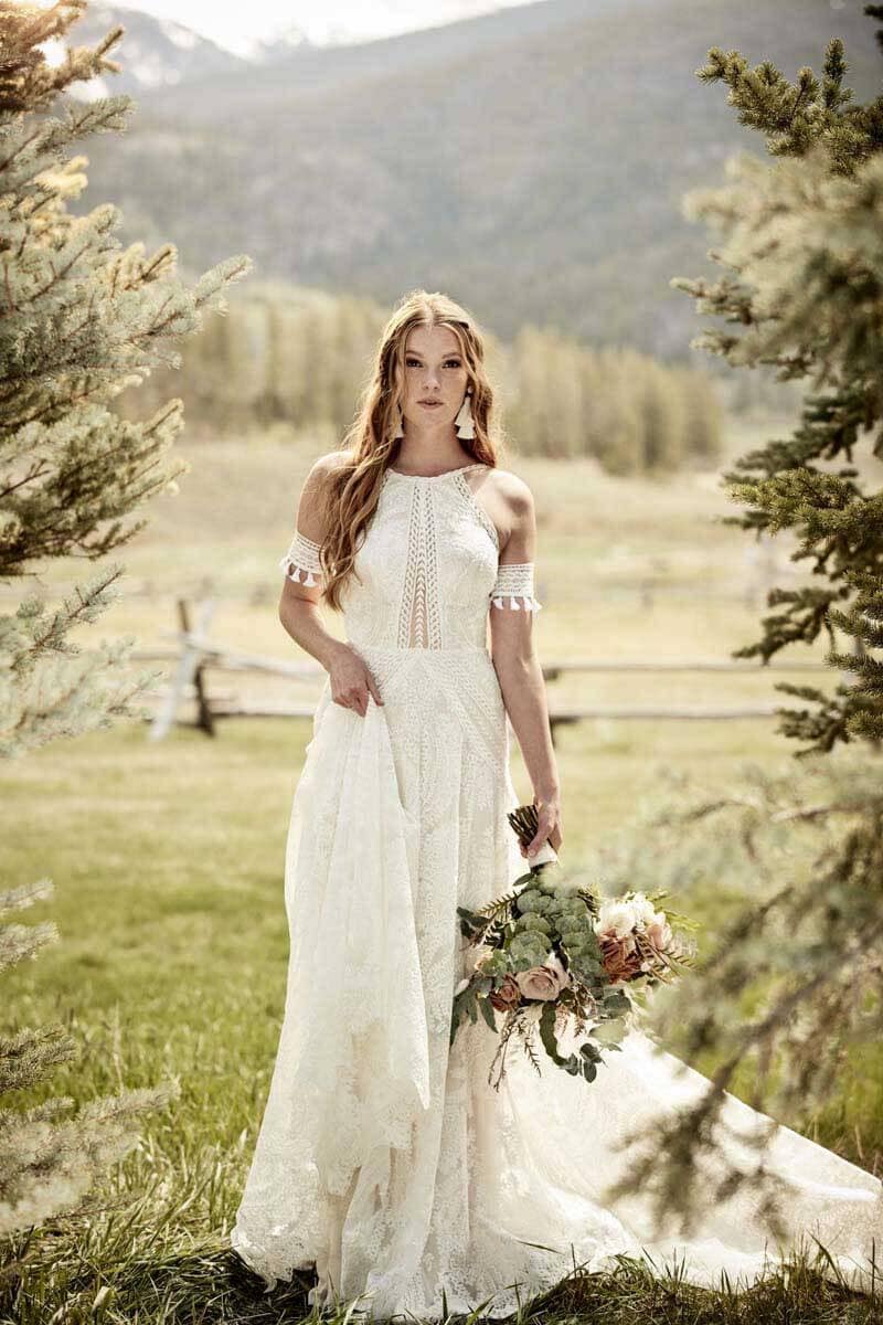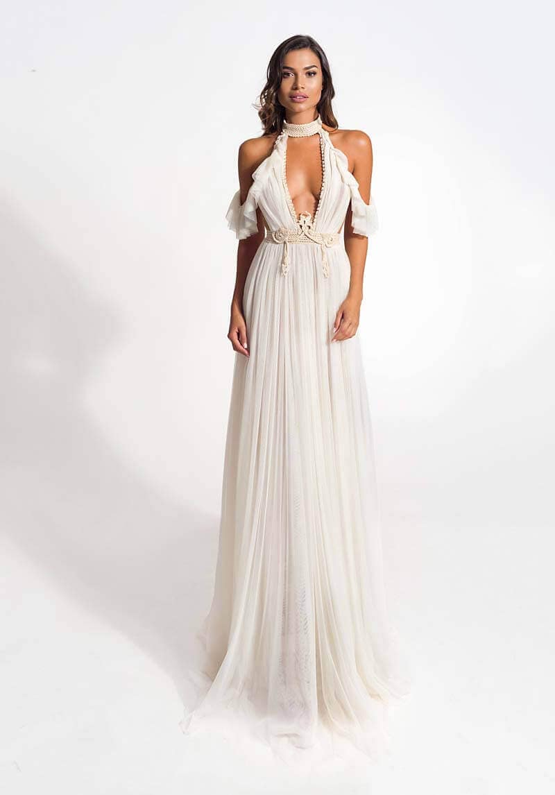 Tiefe Rückenausschnitte mischen sich mit Bohoelementen und schaffen so lufitge Brautkleider, die perfekt für eine Hochzeit am Meer sind.