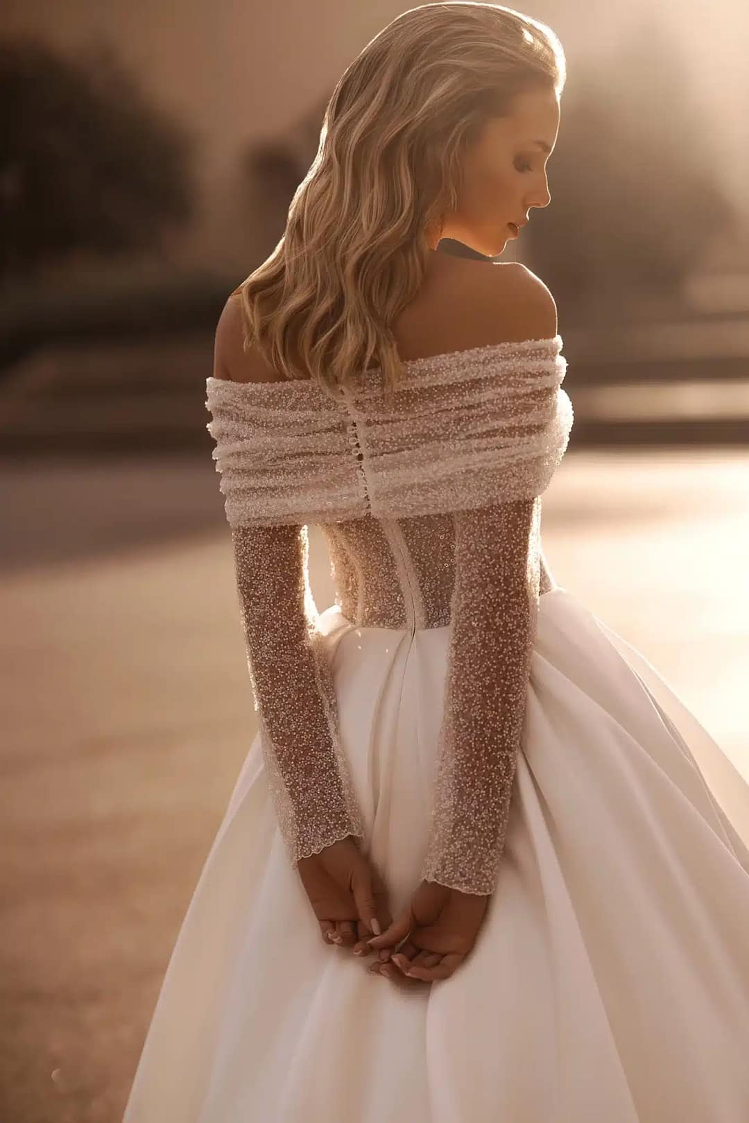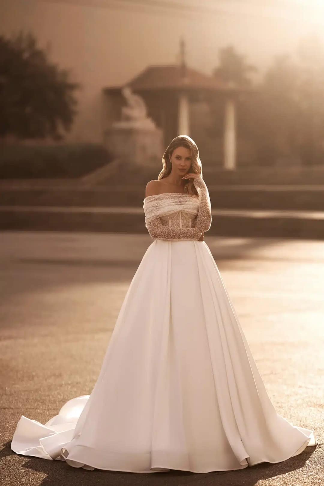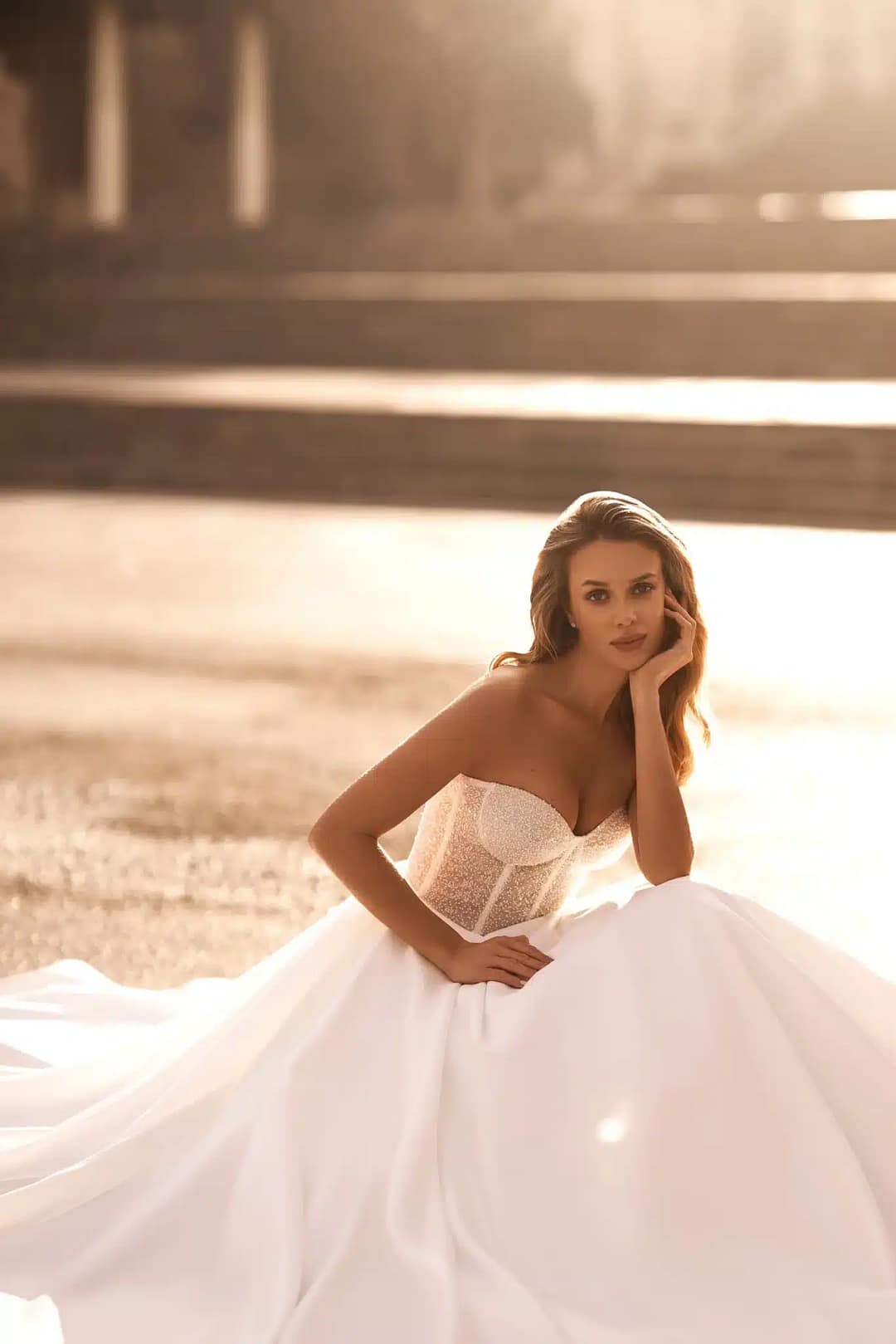 Das Ballkleid Selia mit abnehmbarem Oberteil im Bolero-Stil ist eine vielseitige und praktische Wahl für Bräute. Das Oberteil aus perlen- und paillettenbesetzter Spitze lässt sich leicht abnehmen und gibt den Blick auf ein Korsett mit Knochen frei. Das Korsett hat definierte Brustkörbchen, die die natürlichen Kurven der Braut betonen und eine schmeichelhafte Silhouette schaffen. Der Rock ist aus Mikado gefertigt, der eine volle und voluminöse Silhouette erzeugt. Die Kapellenschleppe verleiht dem Kleid Dramatik und Raffinesse, während der untere Saum mit Rosshaar-Tressen dem Rock Struktur und Bewegung verleiht. Dieses Kleid ist perfekt für Bräute, die sich einen zeitlosen und romantischen Look für ihren Hochzeitstag wünschen.