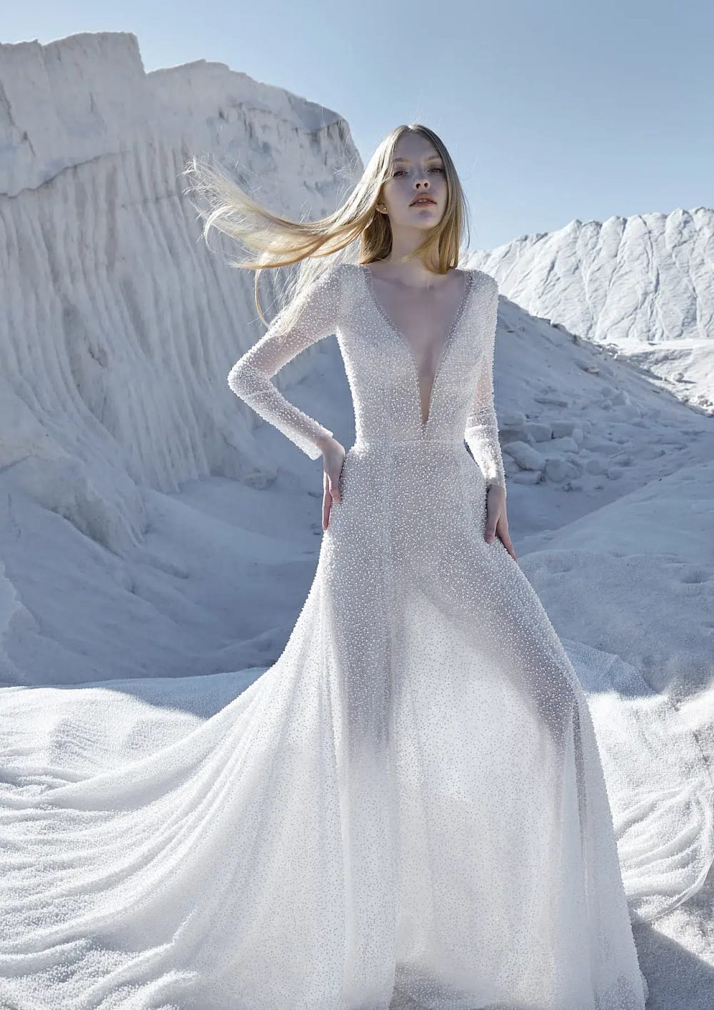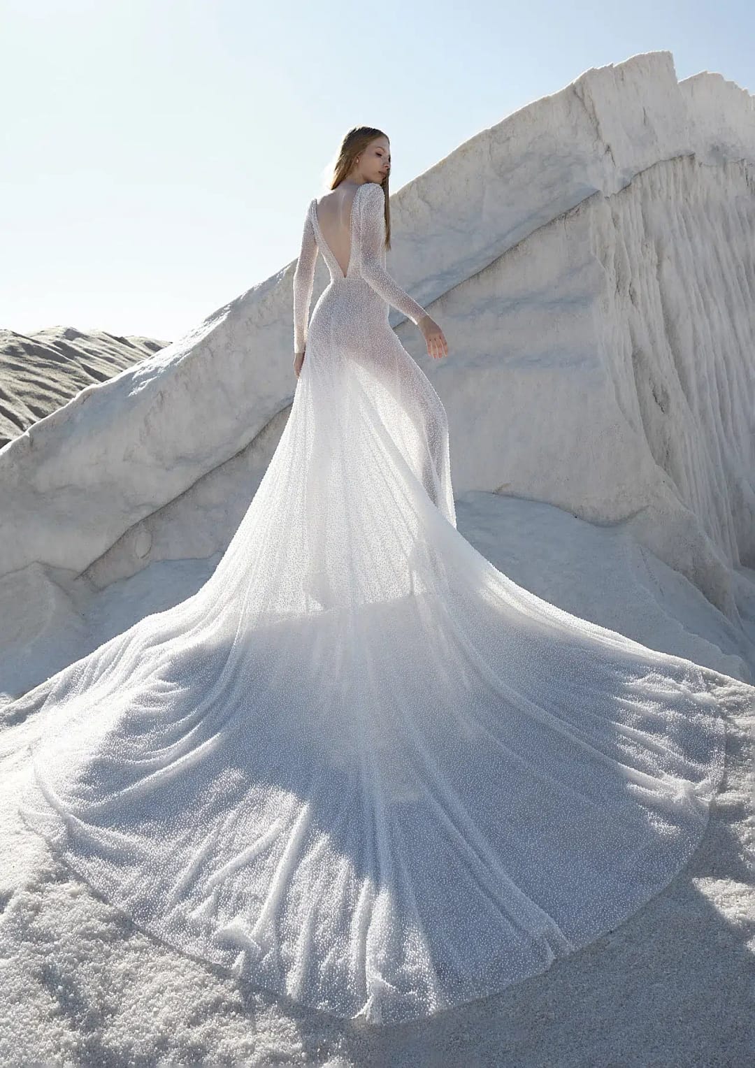 Dieses Atelier Pronovias Haute Couture Brautkleid ist atemberaubend luxuriös! Seine sinnliche Silhouette besteht aus einem langärmeligen, durchsichtigen Oberteil mit tiefem V-Ausschnitt und tiefem Rückenausschnitt sowie einem A-Linien-Muster aus schillerndem Glitzer-Tüll. Sexy, dramatisch und perfekt für deinen großen Tag! Mit diesem schimmernden Kleidungsstück hast du einen großen Auftritt und zeigst deine Persönlichkeit – es ist die perfekte Art, für Aufsehen zu sorgen und ein Statement an deinem besonderen Tag abzugeben!