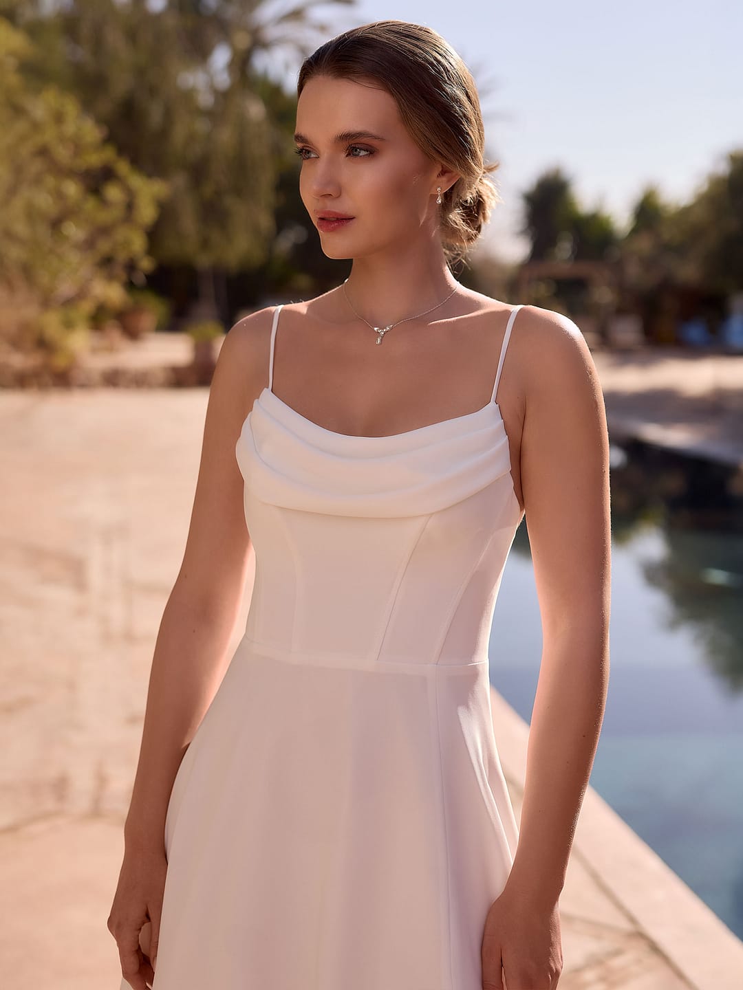 In der Nahaufnahme der Front kommt der Wasserfall-Ausschnitt zur Geltung, drapiert in dem glatten Woll-Crêpe, der die natürliche Taille unterstreicht und eine aura von Raffinesse erzeugt. Und auf dem weiteren Rückbild, das die Braut nah von hinten zeigt, wird der tiefe Ausschnitt am Rücken sichtbar, ergänzt durch die schmalen Träger, die den minimalistischen Charme betonen.