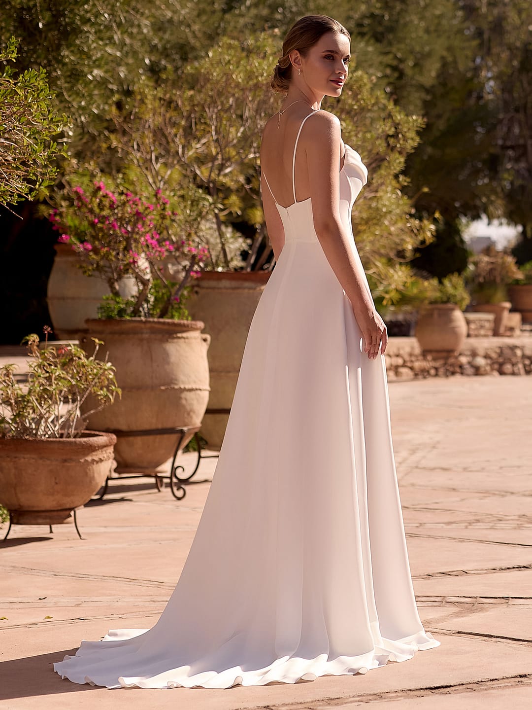 Das Oberteil besticht durch einen drapierten Wasserfall-Ausschnitt, der weich fallend dein Dekolleté umspielt und eine feminine Sanftheit erzeugt. Feine Spaghettiträger sorgen für eine leichte, schulterbetonte Optik, während der offene Rücken eine subtile Offenbarung bietet, die den cleanen Look aufwertet. Ein zuverlässiger Reißverschluss gewährleistet einen einfachen Einstieg und perfekten Halt. Auf dem Bild mit der Rückansicht in voller Länge, wo die Braut am Pool posiert, siehst du den offenen Rücken mit den Trägern und die ausladende Schleppe, die sich harmonisch in die mediterrane Landschaft einfügt.