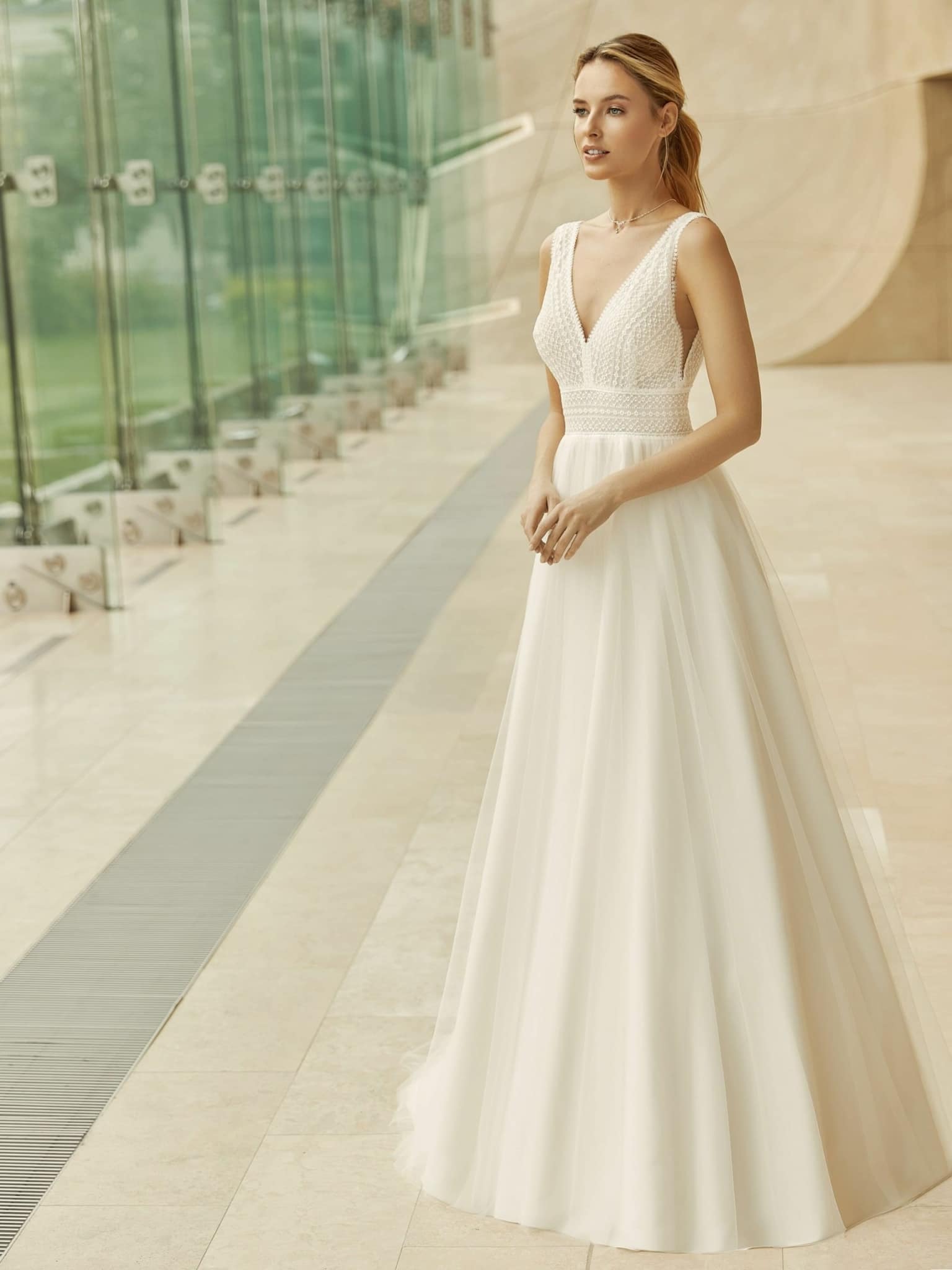 Wohlfühlen in A-Linie: Das Kleid Bianco Evento Gloria hinterlässt einen bleibenden Eindruck für den schönsten Festtag eures Lebens.
