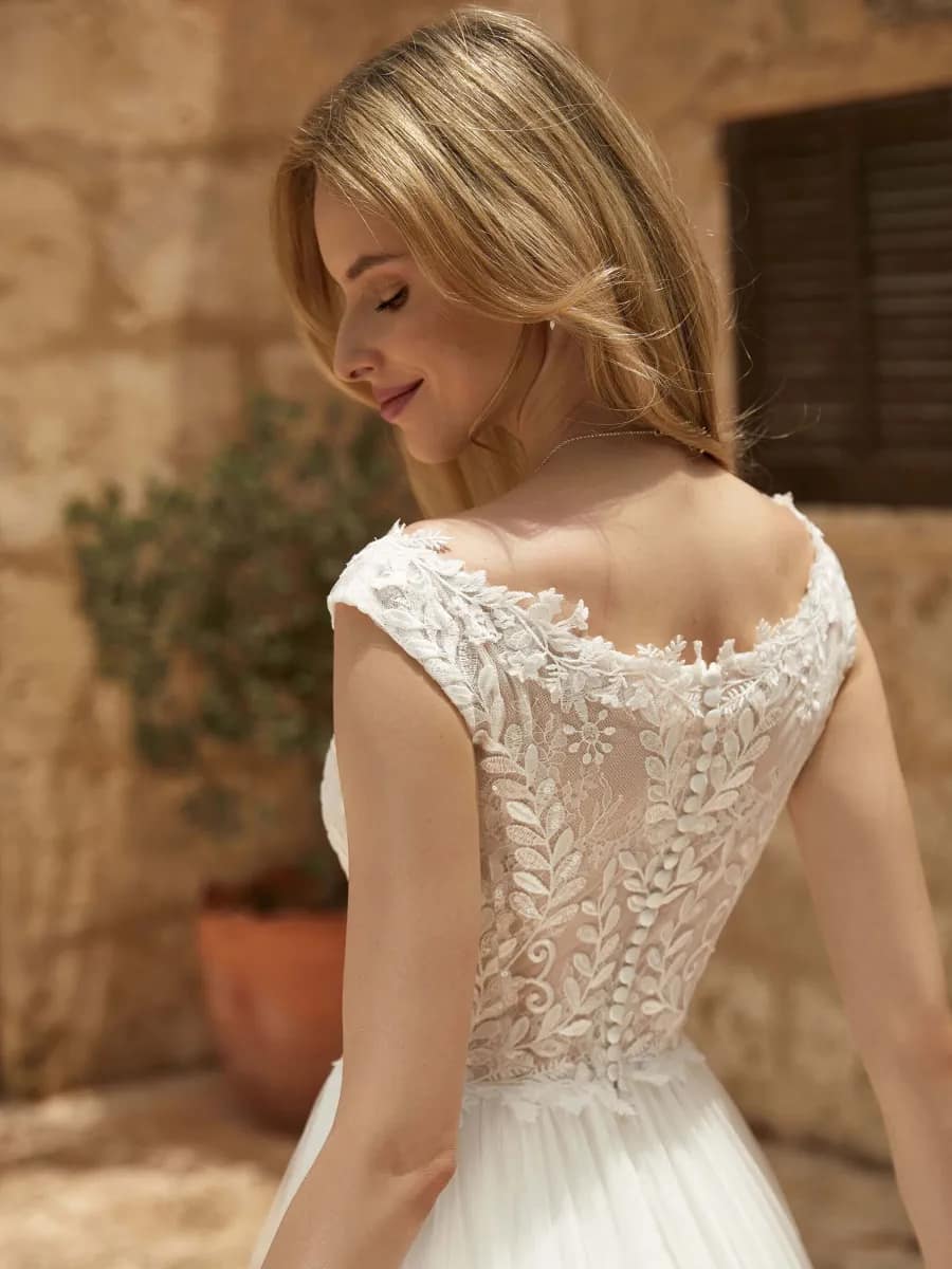 Trotz der kurzen Schleppe ist das Modell grazil und malerisch – besonders beim Weg zum Hochzeitsaltar oder wenn du beim Tanzen in den Armen deines Liebsten bist.