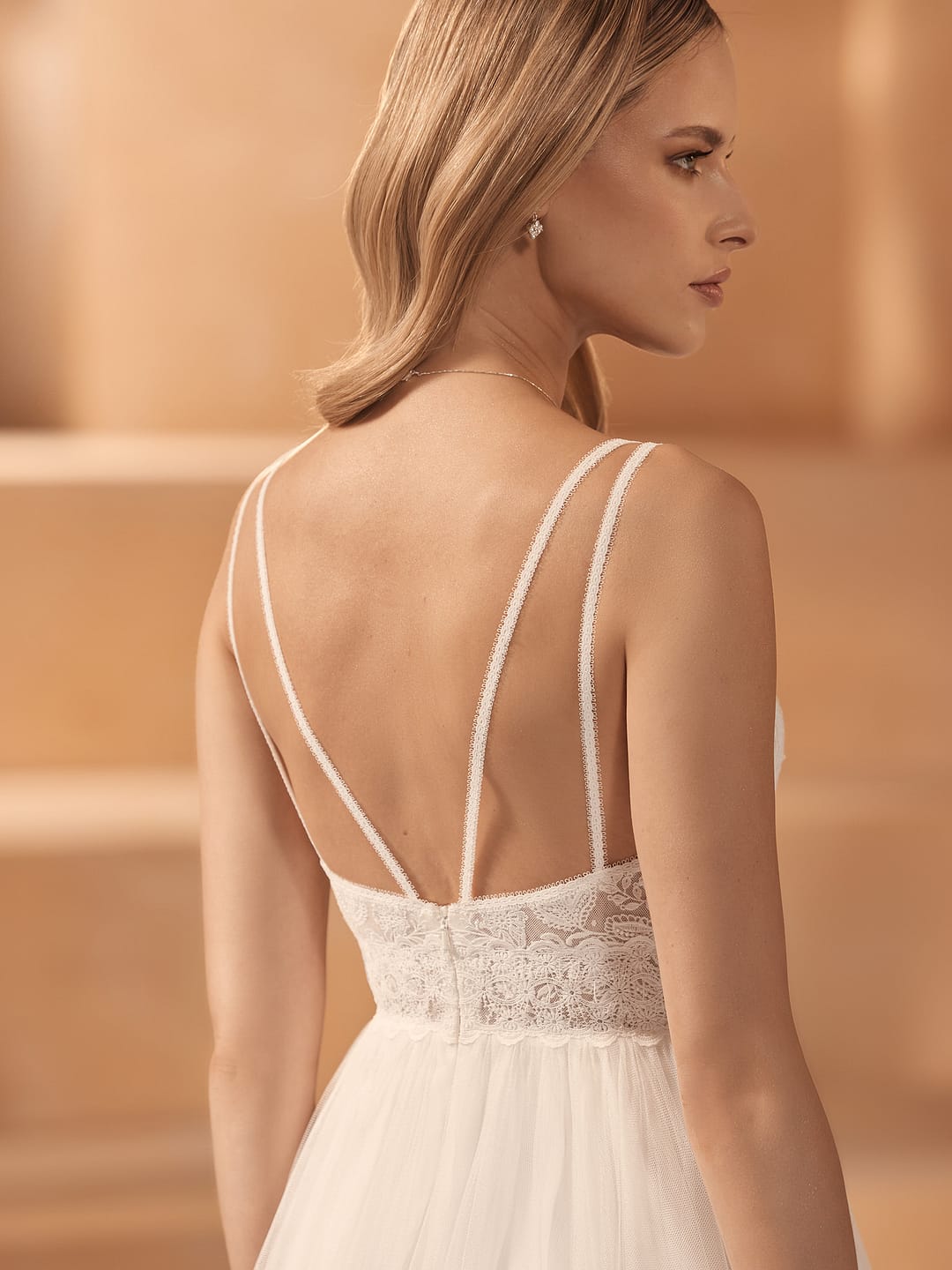 Erlebe die pure Eleganz des Bianco Evento Martha Hochzeitskleides – ein wunderschönes A-Linien-Brautkleid, das perfekt für die Braut ist, die an ihrem großen Tag zeitlose Schönheit und Anmut ausstrahlen möchte.