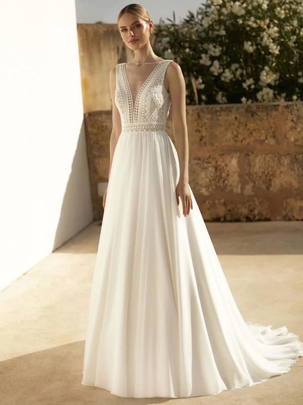 Das Brautkleid besticht durch seine A-Linie Form, die deine Figur perfekt in Szene setzt. Der V-Ausschnitt vorne verleiht dem Kleid eine feminine Note, während der tiefe V-Rücken einen Hauch von Verführung hinzufügt. Das Material aus Spitze und Chiffon sorgt nicht nur für einen angenehmen Tragekomfort, sondern unterstreicht auch den Boho Vintage Stil des Kleides.