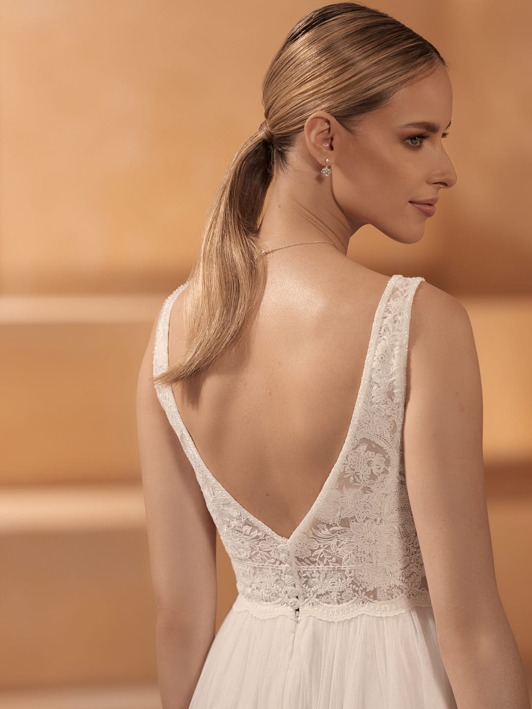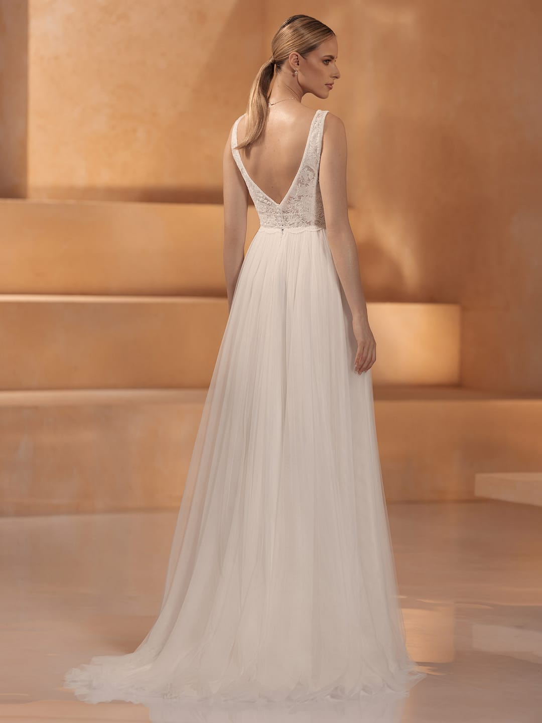 Ein besonderes Merkmal ist die halbkathedralische Schleppe, die dem Kleid eine dramatische Länge verleiht, ohne überwältigend zu wirken – sie fließt elegant hinter dir her und schafft einen bleibenden Eindruck. Auf dem zweiten Bild, der vollständigen Rückansicht, erkennst du, wie die Schleppe aus Tüll sich weich ausbreitet und die Spitze am Oberteil eine kunstvolle Kontrastierung bietet, alles vor dem warmen, goldenen Hintergrund, der die Transparenz des Materials hervorhebt.
