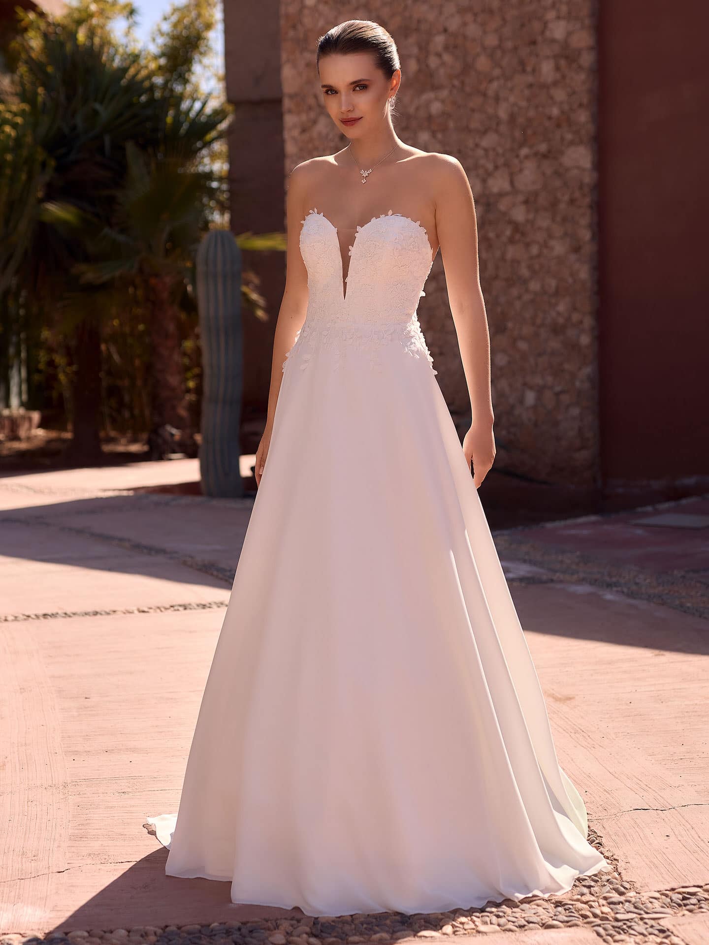 Auf dem zweiten Bild, das die Rückansicht in voller Länge zeigt, erkennst du die fließende Schleppe, die sich elegant über den Boden ausbreitet. Die Kombination aus dem schimmernden Chiffon und der detaillierten Spitze am Oberteil wirkt hier besonders beeindruckend gegen den sonnigen Hintergrund. Im dritten Bild, der Frontansicht, kommst du dem Sweetheart-Ausschnitt näher – die floralen Applikationen ziehen den Blick magisch an und verleihen dem Kleid eine zeitlose Schönheit.