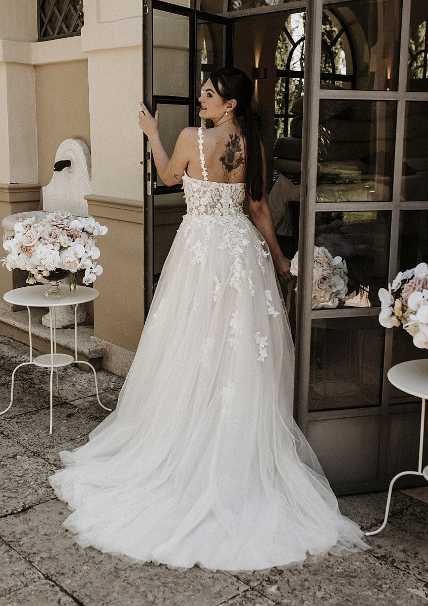Der grazil fließende Tüll-Rock sowie die feinen Blumen aus Spitze machen dieses Hochzeitskleid zu einem unvergesslichen Blickfang.
