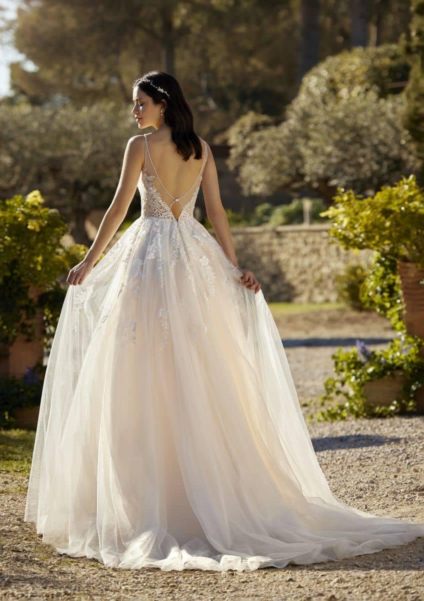 Trotz der kurzen Schleppe ist das Kleid mondän und malerisch – besonders beim Weg zum Altar oder wenn du beim Tanzen in den Armen deines Liebsten bist.