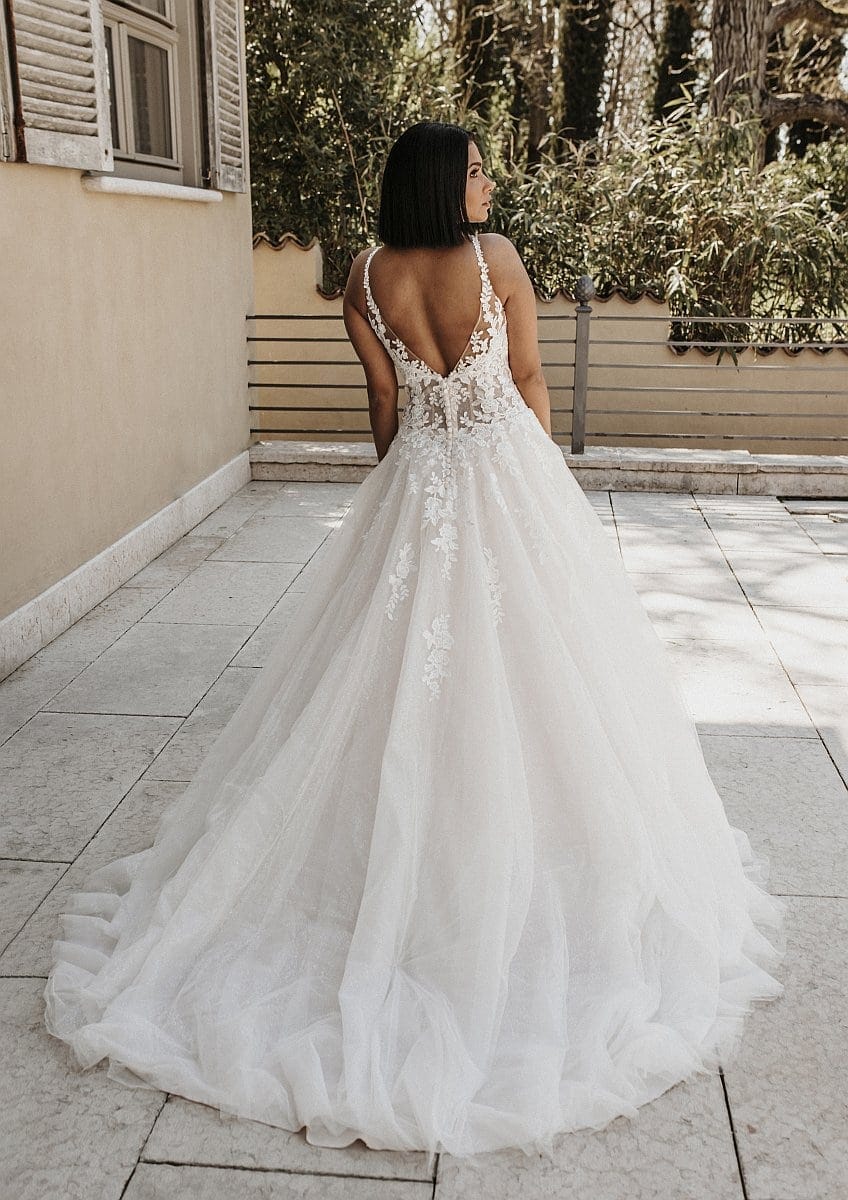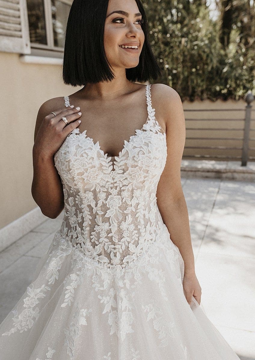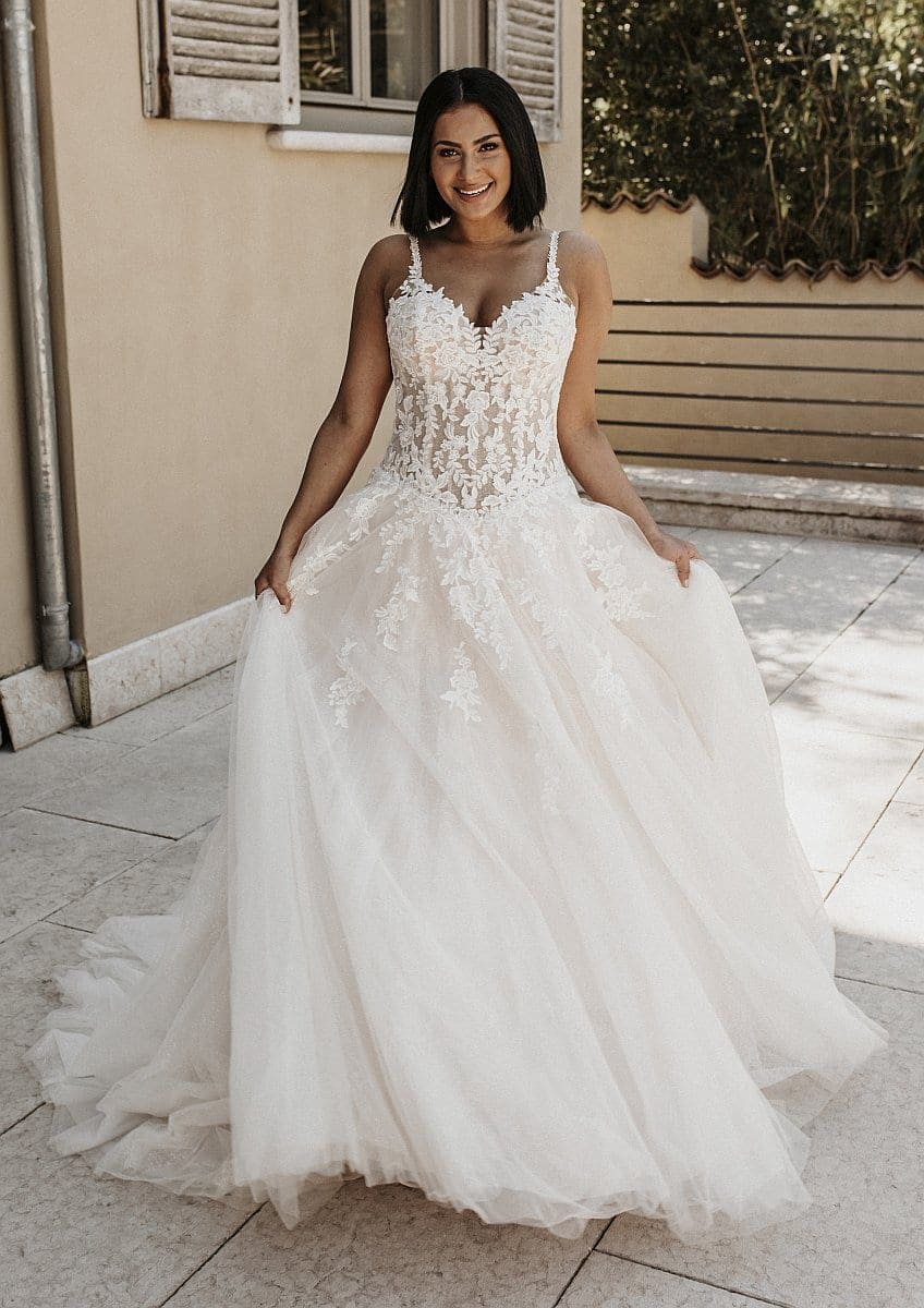 Der filigran fließende Tüll-Rock sowie die feinen Blumen aus Spitze machen dieses Hochzeitskleid zu einem unvergesslichen Blickfang.