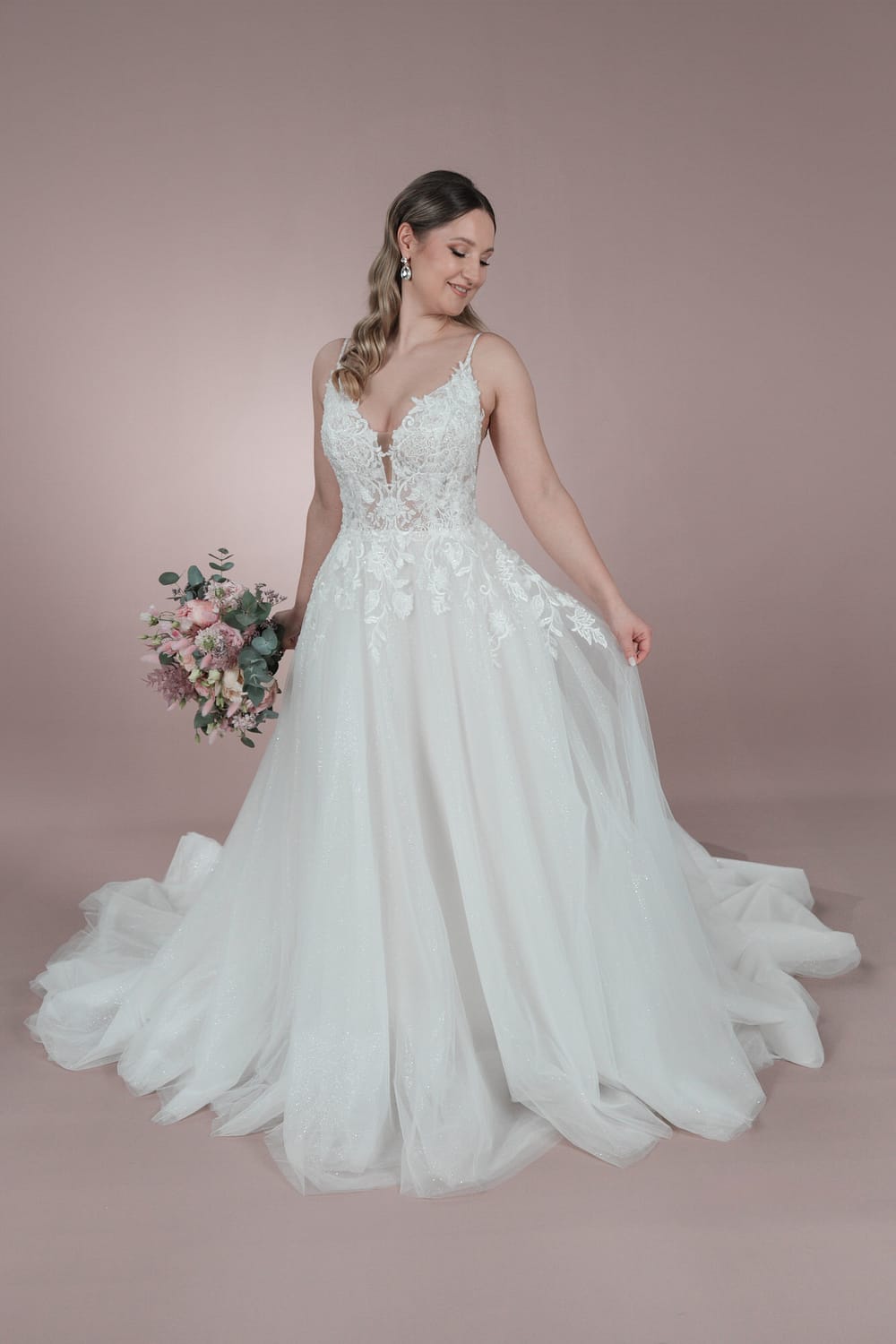 Moderner Hollywood Glamour trifft auf die Klassik der Brautmode – das Ergebnis ist Style Bridonista C23-03! Eine wunderschöne A-Linie, die zarte Spaghetti-Träger mit einem weiblichen V-Ausschnitt und seitlichen Cut-Outs verbindet. Auf den ersten und zweiten Blick überzeugt die Korsage mit einer schmeichelnden Transparenz, die die florale Spitze hervorhebt und die Schönheit der Braut betont. Bridonista ist eine detailverliebte Designerin. So sind die Spaghetti-Träger mit edlen Perlen handbestickt und die Kannten der V-Ausschnitte organisch mit Spitze überzogen. Für den perfekten Fit ist auch dieses Bridonista Design mit einer starken Korsage und Push-Up-Cups ausgestattet, so kannst du dich an deinem großen Tag sicher und wunderschön fühlen. Besonderes Highlight ist der tiefe Rückenausschnitt, der das Design in ein perfektes Gleichgewicht bringt und am Tag deiner Hochzeit für viele WOW-Momente sorgen wird. Der Tüll-Rock lenkt nicht von der aufwendigen Korsage ab, ist schlicht gehalten und sorgt mit einer mittellangen, aber dennoch leichten Schleppe für moderne Cinderella-Vibes.