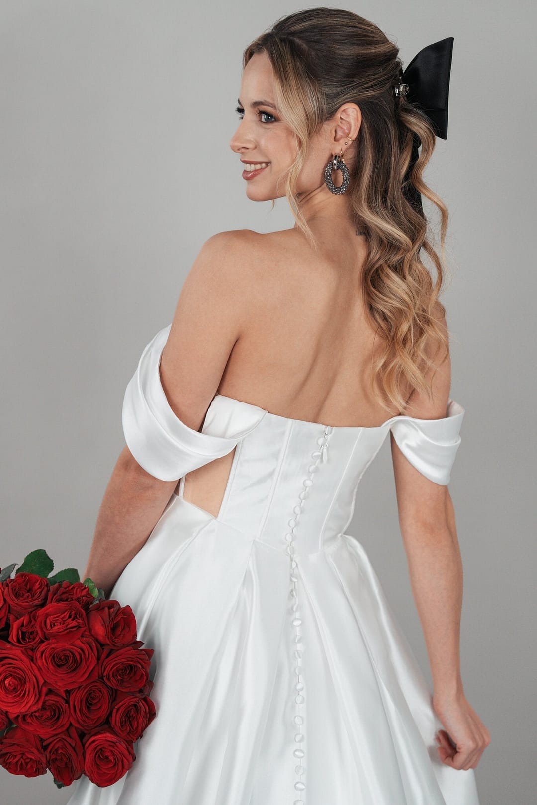 Das Bridonista BC25-A01 ist aus hochwertigem Mikado gefertigt, einem Stoff, der für seine edle Ausstrahlung und Stabilität bekannt ist. Der Illusion-Tüll sorgt für einen faszinierenden Effekt, der Transparenz und Tiefe verleiht. Der Corsagen-Look des Kleides formt eine zauberhafte Silhouette und betont die Taille auf feminine Weise. Der herzförmige Ausschnitt ergänzt dies ideal, indem er das Dekolleté auf elegante Weise in Szene setzt.
