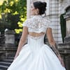 Der klassische Herz-Ausschnitt bringt deine feminine Ausstrahlung besonders schön zur Geltung. Der weite U-Ausschnitt am Rücken sorgt für einen eleganten Akzent und rückt deine Rückansicht stilvoll ins Zentrum. Als wandelbares Highlight begleitet dich ein abnehmbarer Highneck-Bolero aus feiner Chantilly-Spitze. Mit ihm kannst du im Handumdrehen zwischen modern-minimalistisch und royal-glamourös wechseln – perfekt für Trauung und Feier.