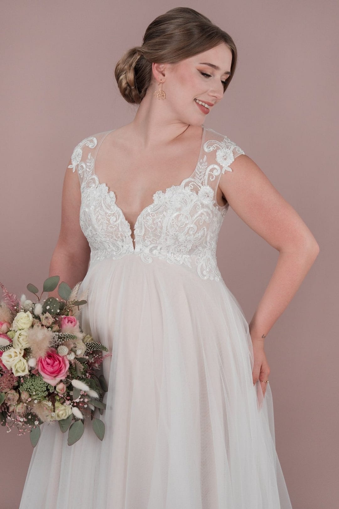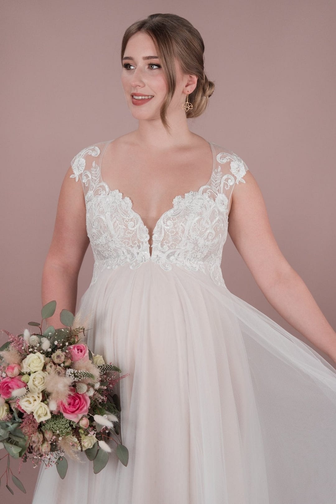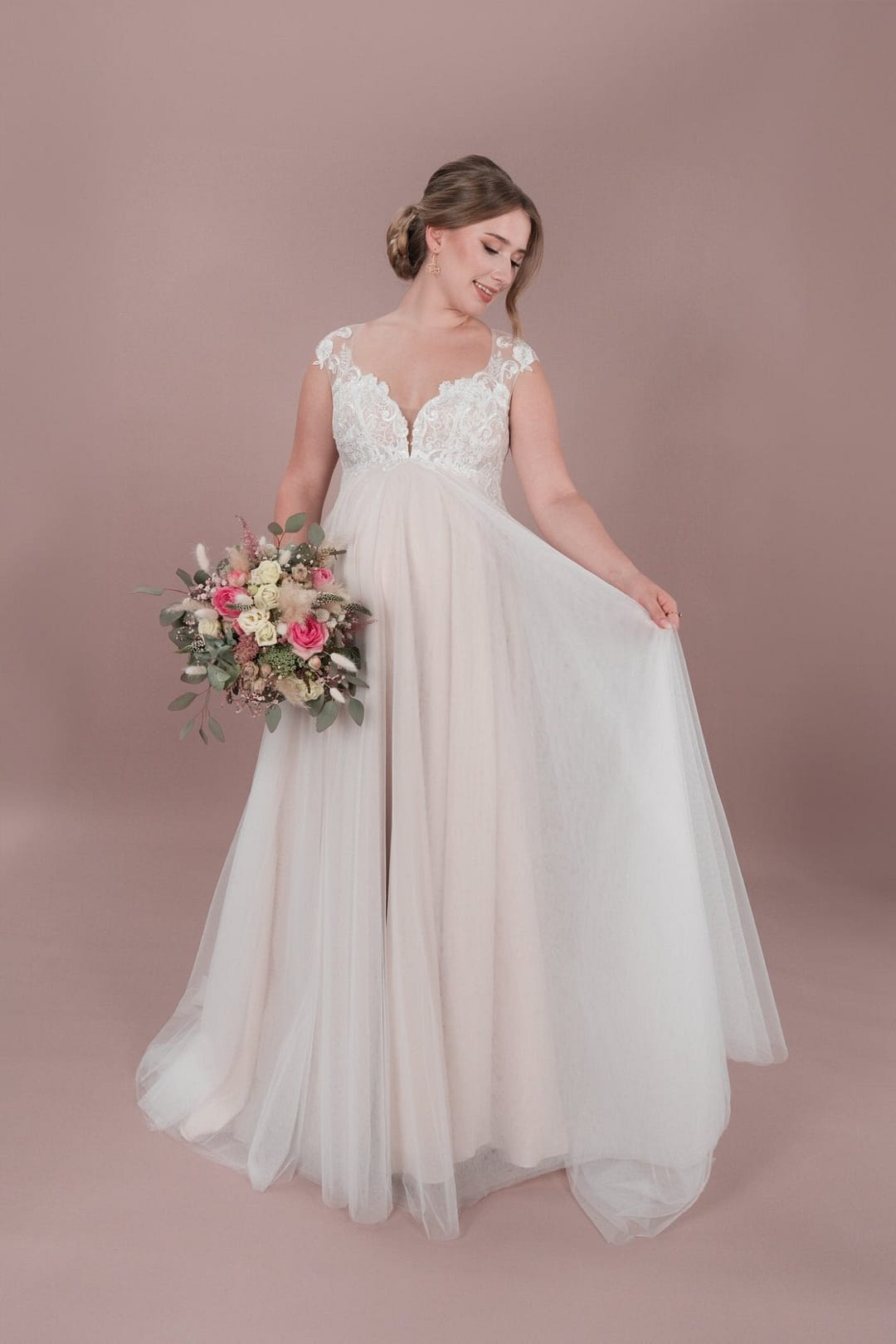 Das BM25-01 Brautkleid von Bridonista ist perfekt für romantische schwangere Bräute. Mit zarter Spitze, Tüll und Bestickungen, einem kurzen Schleier und einem schönen Ausschnitt V am Rücken wird jeder Gang zum Standesamt zum Highlight. Die Corsage und Rücken Schürung sorgen für eine schöne Empire-Silhouette. Unser BM25-01 Brautkleid von Bridonista ist die perfekte Wahl für romantische schwangere Bräute. Ausgestattet mit zarter Spitze, elegantem Tüll und filigranen Bestickungen, erweckt es die Vorstellung einer wunderschönen Braut, die den Gang zum Standesamt mit Stil und Grazie vollzieht. Der kurze Schleier und der schöne Ausschnitt am Rücken verleihen dem Kleid eine besondere Note, während die Corsage und Rücken-Schürung eine wunderschöne Empire-Silhouette zaubern. Mit unserem Brautkleid wirst du dich an deinem Hochzeitstag einfach nur strahlend und schön fühlen!