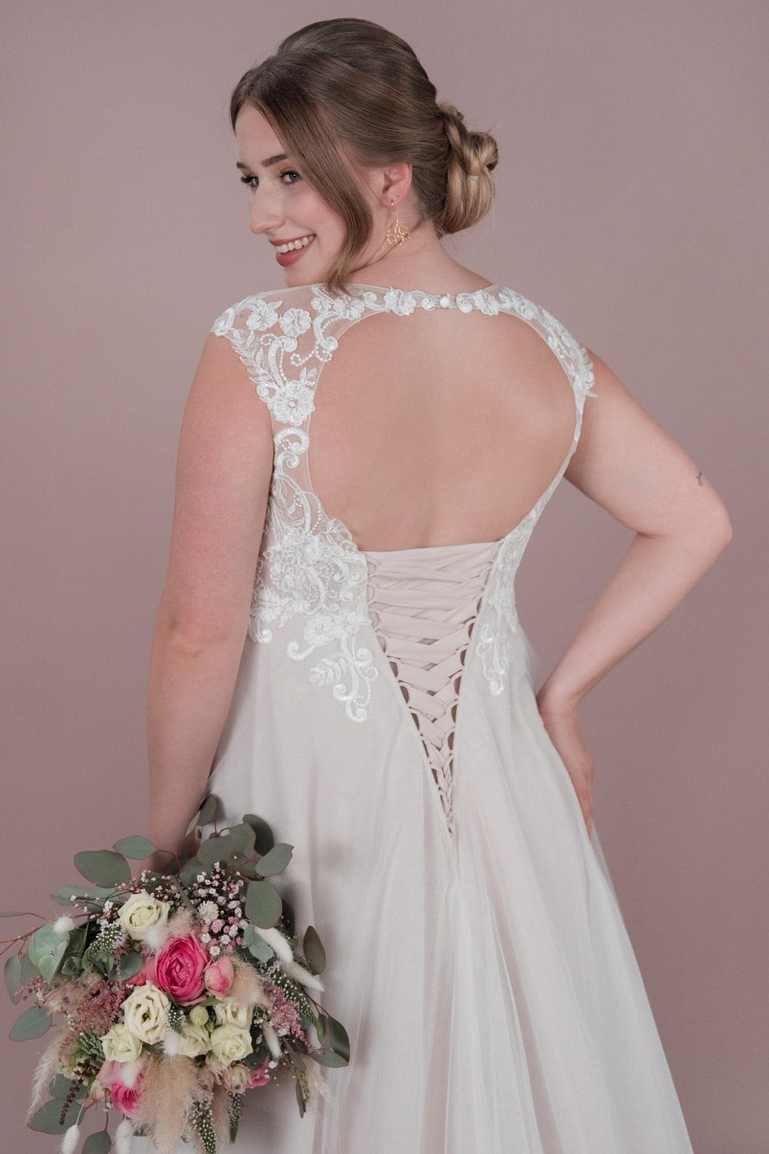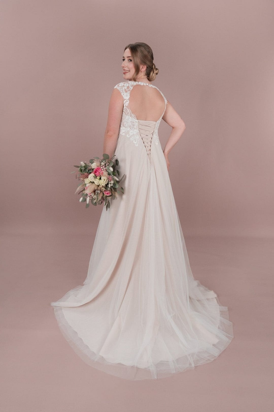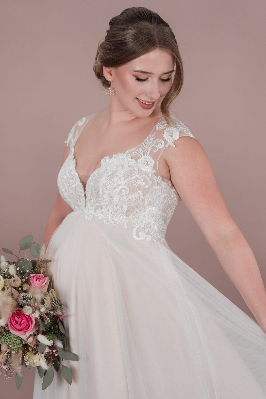 Das BM25-01 Brautkleid von Bridonista ist perfekt für romantische schwangere Bräute. Mit zarter Spitze, Tüll und Bestickungen, einem kurzen Schleier und einem schönen Ausschnitt V am Rücken wird jeder Gang zum Standesamt zum Highlight. Die Corsage und Rücken Schürung sorgen für eine schöne Empire-Silhouette. Unser BM25-01 Brautkleid von Bridonista ist die perfekte Wahl für romantische schwangere Bräute. Ausgestattet mit zarter Spitze, elegantem Tüll und filigranen Bestickungen, erweckt es die Vorstellung einer wunderschönen Braut, die den Gang zum Standesamt mit Stil und Grazie vollzieht. Der kurze Schleier und der schöne Ausschnitt am Rücken verleihen dem Kleid eine besondere Note, während die Corsage und Rücken-Schürung eine wunderschöne Empire-Silhouette zaubern. Mit unserem Brautkleid wirst du dich an deinem Hochzeitstag einfach nur strahlend und schön fühlen!