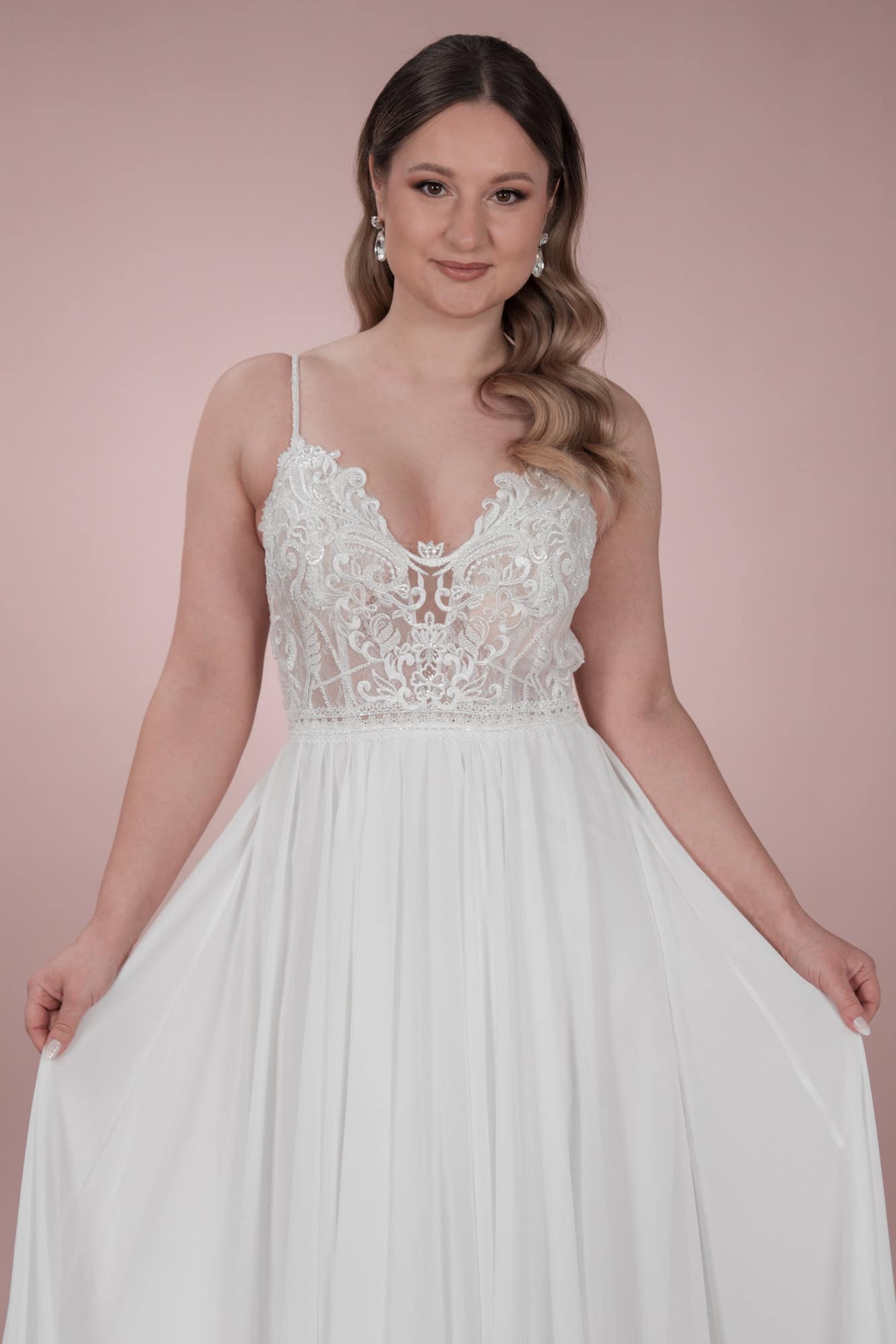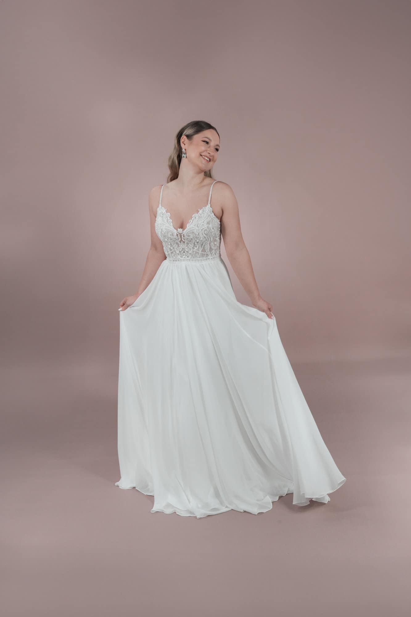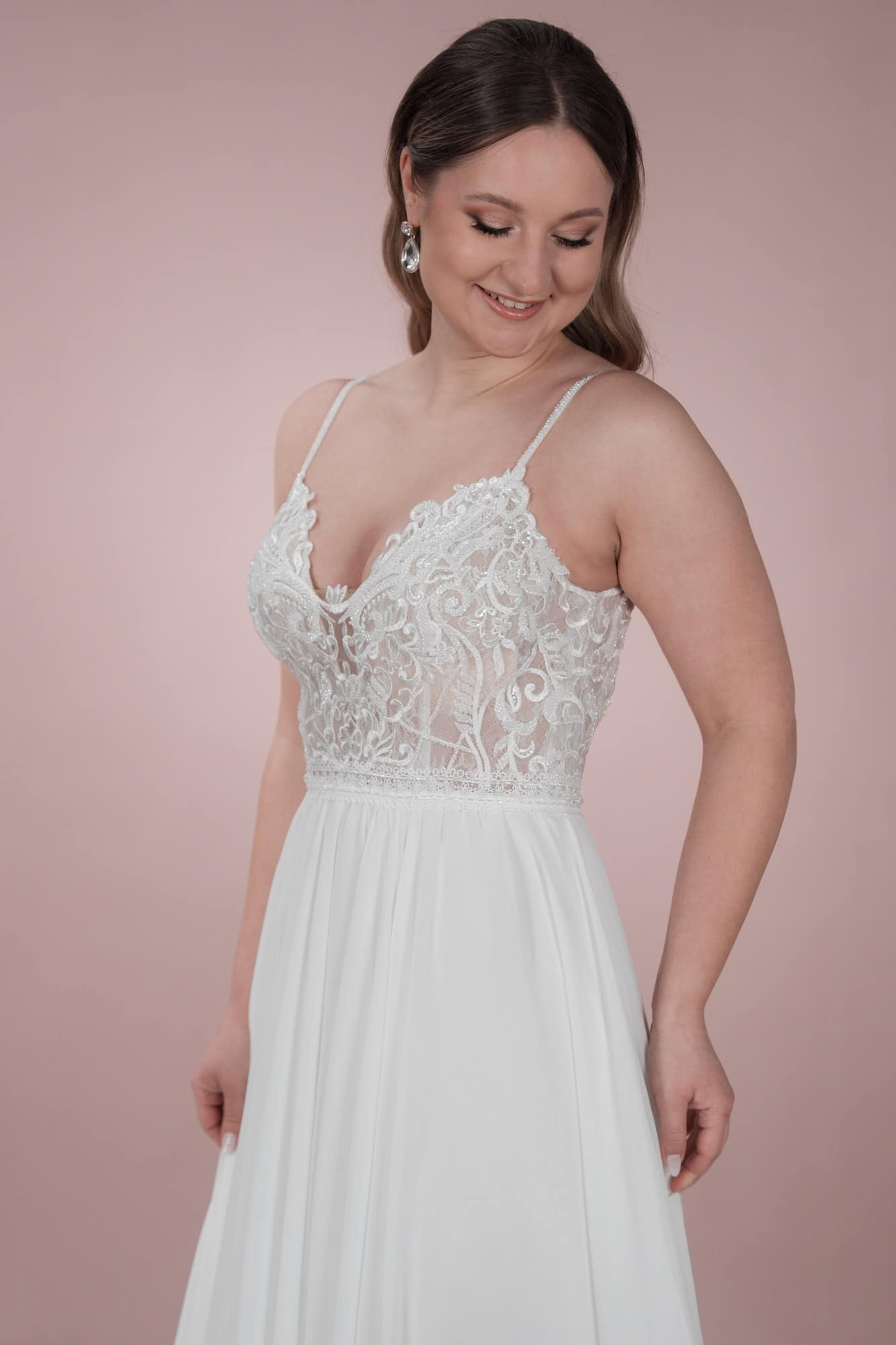 Du suchst nach einem schlichten Brautkleid mit detailverliebter Korsage? Bridonista C23-20 aus der Bridonista Classic Collection wird dich verzaubern, buche jetzt einen Beratungstermin bei einem Partnerhändler. Diese zarte A-Linie hat eine aufregend gestaltete Korsage, die durch fein bestickte Spaghetti-Träger akzentuiert ist. Die geschwungene Spitze ist mit Pailletten, Kristallen, und Perlen handbestickt; und verleiht dem Design ein modernes Funkeln. Das in der Taille aufgearbeitete und ebenfalls bestickte Spitzen-Band sorgt für eine weibliche Körperbetonung. Markenzeichen dieser Kollektion sind die modernen Einflüsse der Lingerie-Optik, so ist die Korsage semitransparent geschneidert und betont die Schönheit der Haut, die durch die Spitze und den hautfarbenen Tüll hindurchschimmert. Für den perfekten Fit ist auch dieses Bridonista Design mit einer starken Korsage und Push-Up-Cups ausgestattet, so kannst du dich an deinem großen Tag sicher und wunderschön fühlen. Ein außerordentlich tiefer V-förmiger Rücken sorgt für ein weiteres Highlight und wird dir einen unvergesslichen WOW-Moment auf deiner Hochzeit bescheren. Der leichte Chiffonrock verleiht diesem Brautkleid eine verspielte und dennoch edle Note. Die kurze Schleppe ist unkompliziert und pflegeleicht, gibt dir aber dennoch Braut-Vibes.