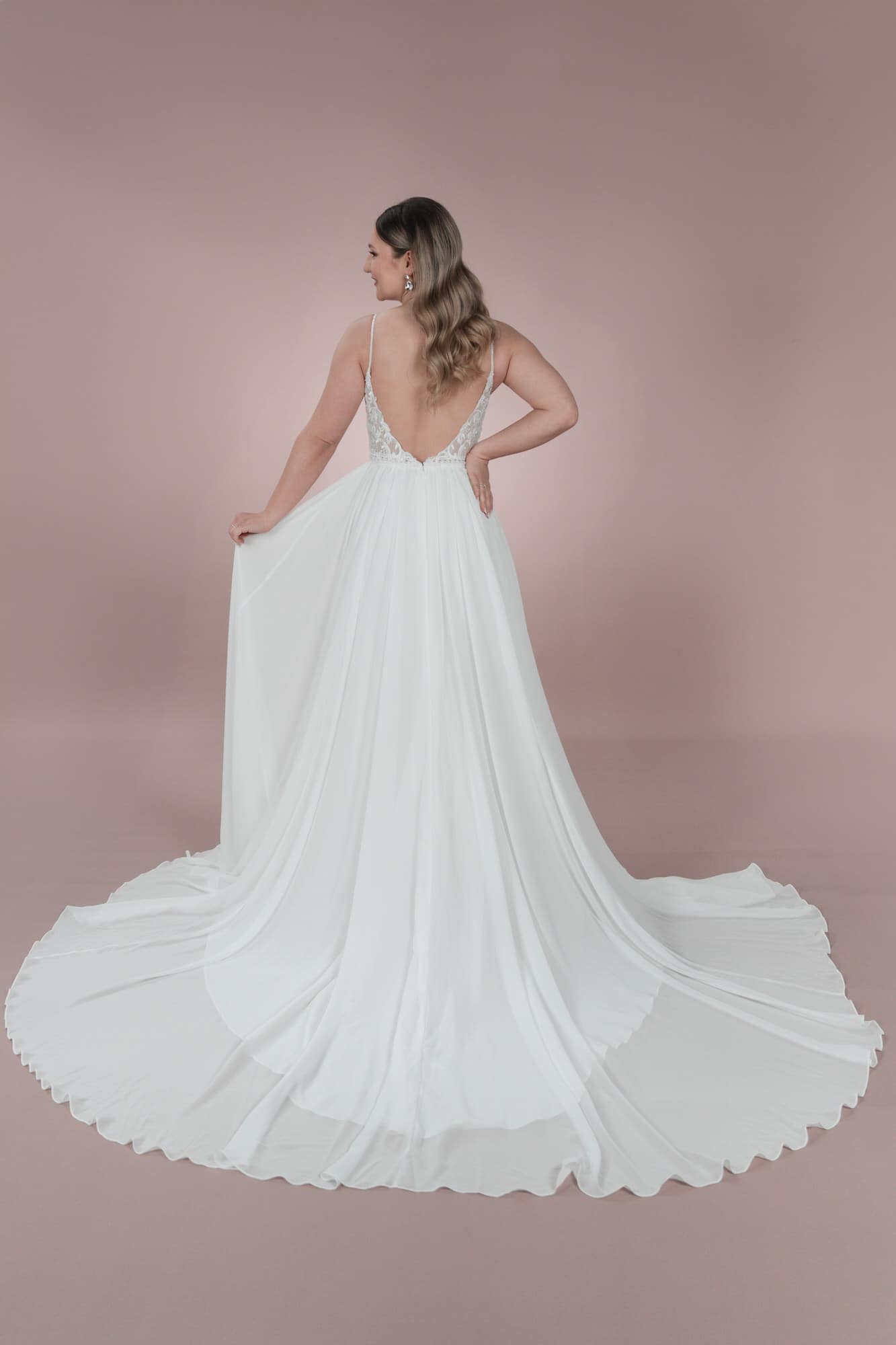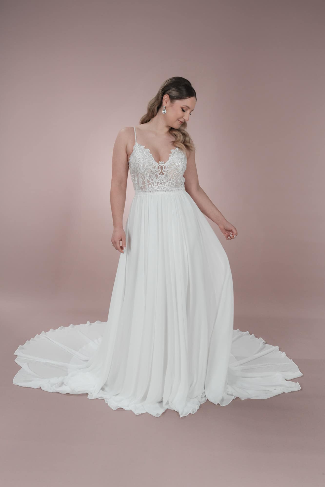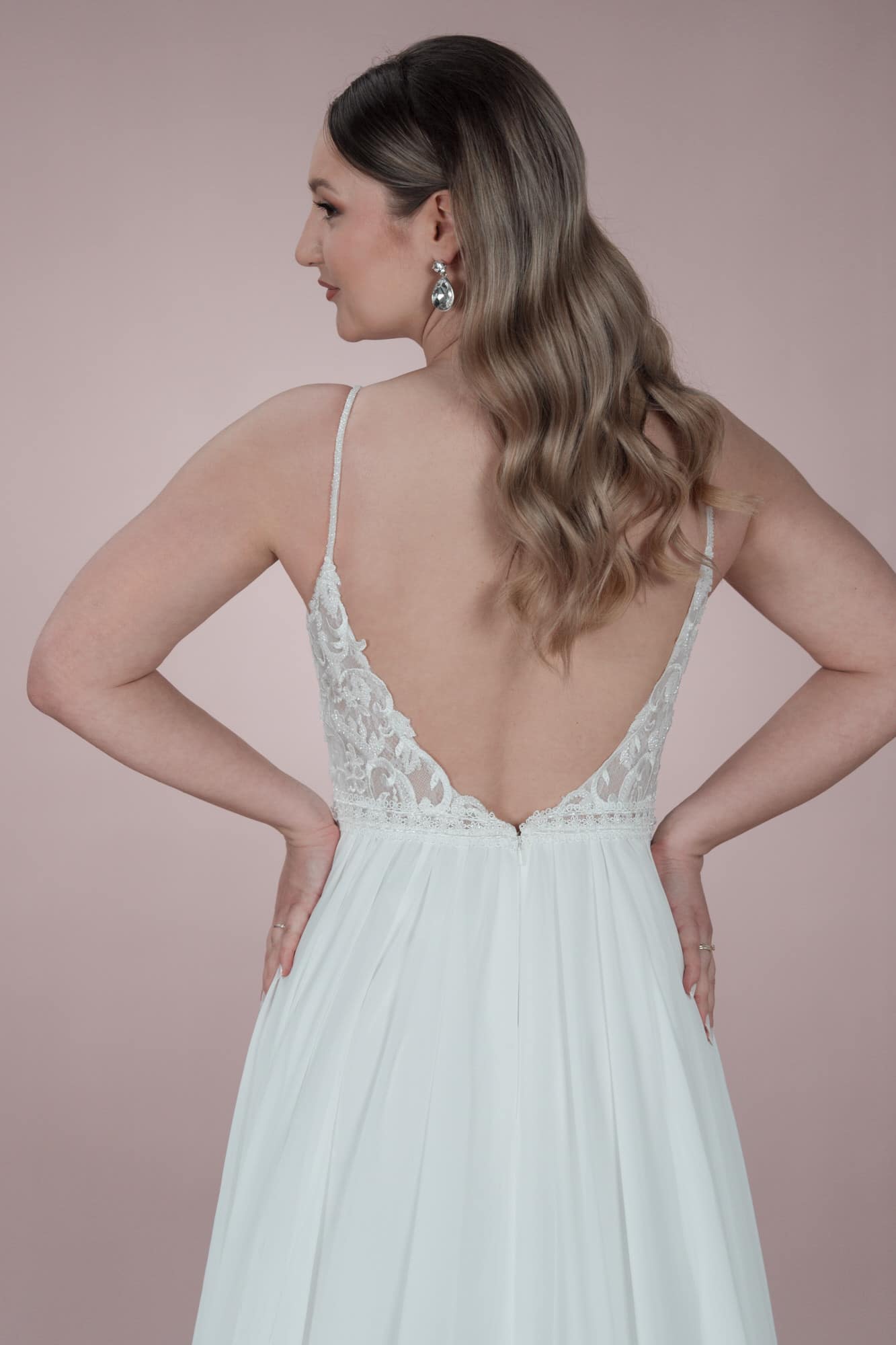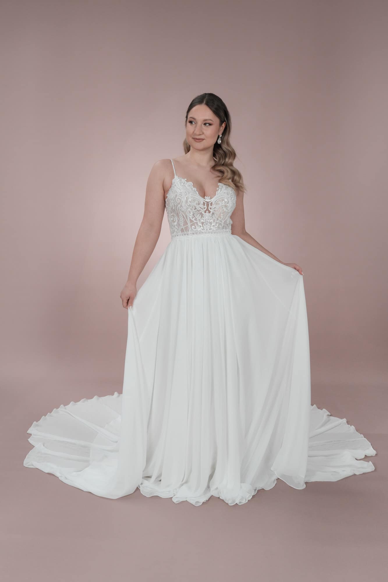 Du suchst nach einem schlichten Brautkleid mit detailverliebter Korsage? Bridonista C23-20 aus der Bridonista Classic Collection wird dich verzaubern, buche jetzt einen Beratungstermin bei einem Partnerhändler. Diese zarte A-Linie hat eine aufregend gestaltete Korsage, die durch fein bestickte Spaghetti-Träger akzentuiert ist. Die geschwungene Spitze ist mit Pailletten, Kristallen, und Perlen handbestickt; und verleiht dem Design ein modernes Funkeln. Das in der Taille aufgearbeitete und ebenfalls bestickte Spitzen-Band sorgt für eine weibliche Körperbetonung. Markenzeichen dieser Kollektion sind die modernen Einflüsse der Lingerie-Optik, so ist die Korsage semitransparent geschneidert und betont die Schönheit der Haut, die durch die Spitze und den hautfarbenen Tüll hindurchschimmert. Für den perfekten Fit ist auch dieses Bridonista Design mit einer starken Korsage und Push-Up-Cups ausgestattet, so kannst du dich an deinem großen Tag sicher und wunderschön fühlen. Ein außerordentlich tiefer V-förmiger Rücken sorgt für ein weiteres Highlight und wird dir einen unvergesslichen WOW-Moment auf deiner Hochzeit bescheren. Der leichte Chiffonrock verleiht diesem Brautkleid eine verspielte und dennoch edle Note. Die kurze Schleppe ist unkompliziert und pflegeleicht, gibt dir aber dennoch Braut-Vibes.