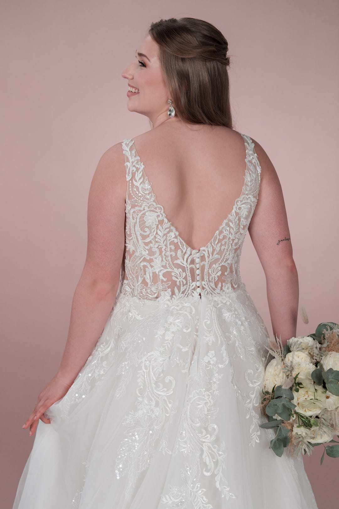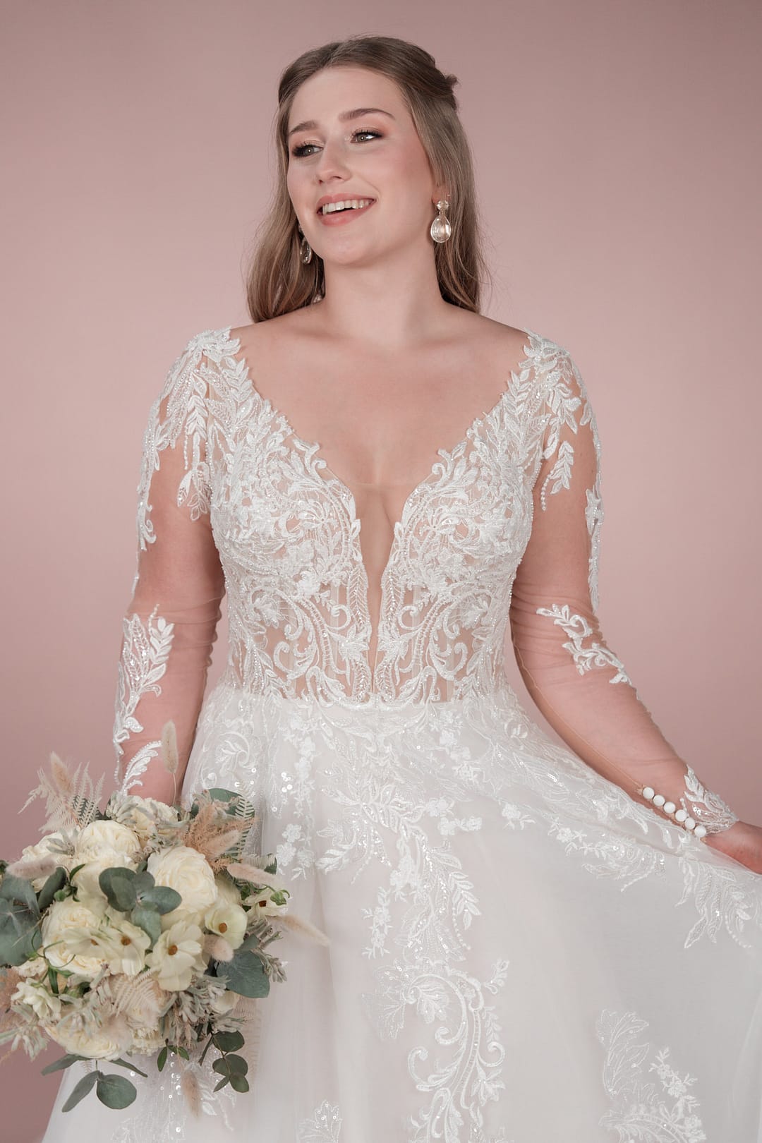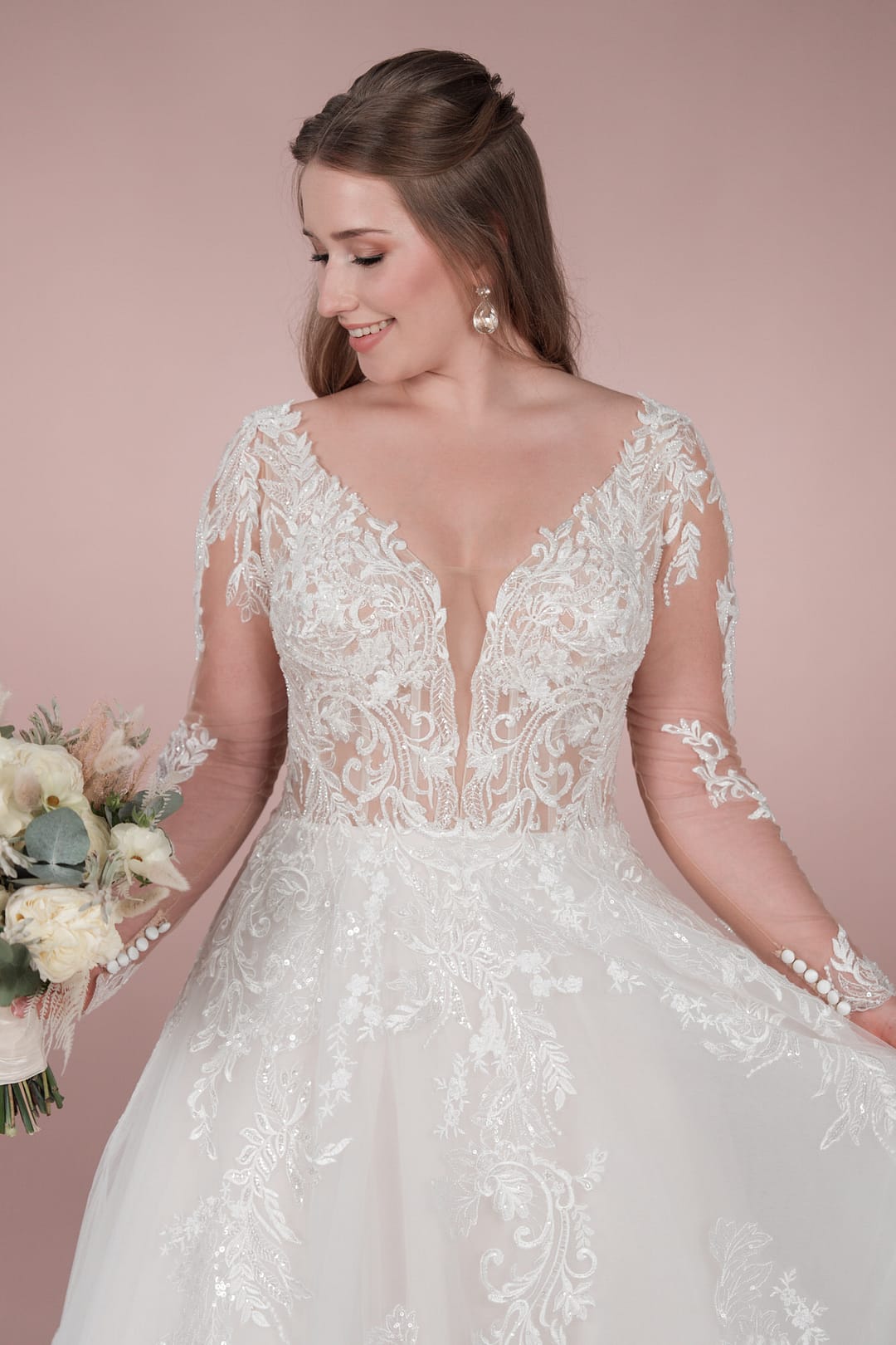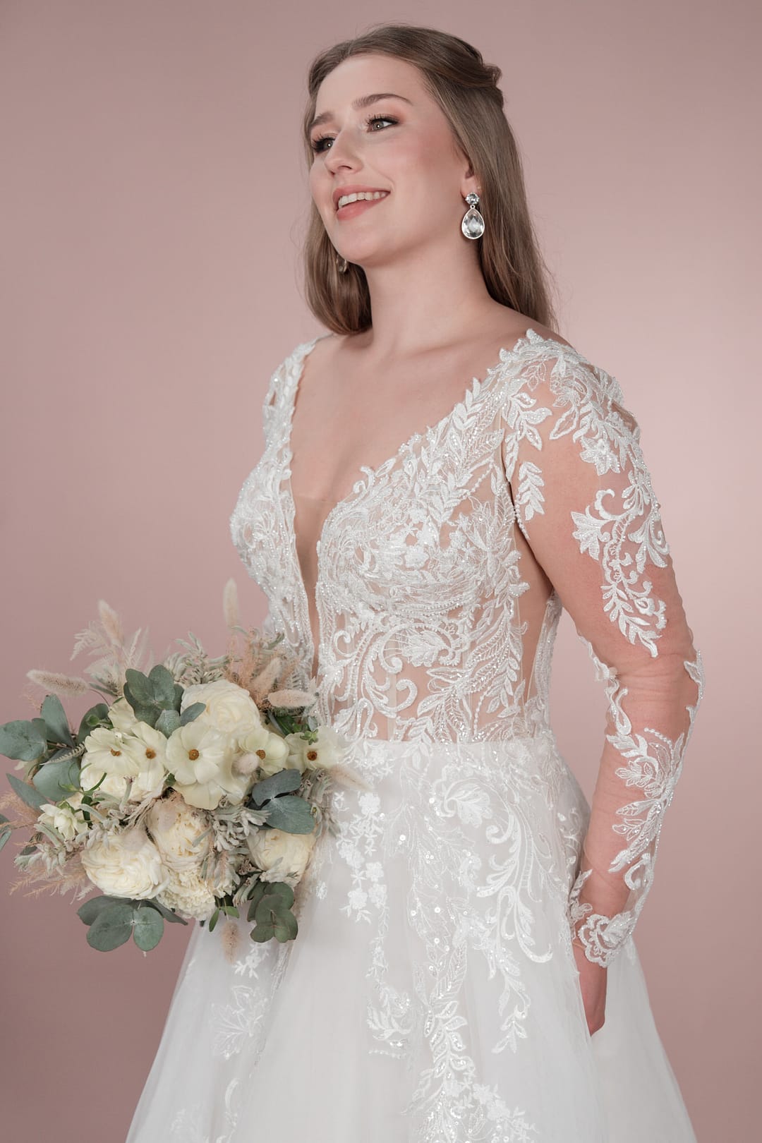Liebe Braut, du suchst nach Romantik und Glamour? Dabei legst du Wert auf ein ausgereiftes Design und möchtest mit besonderen Details überrascht werden? Gerne möchtest du deine Arme bedecken und wünschst dir eine A-Linie, die zugleich modern und klassisch ist? Perfekt, Bridonista würde dir gerne Style Bridonista C23-06 vorstellen: Eine atemberaubende A-Linie mit tiefen V-Ausschnitten im Dekolleté und Rücken, sowie seitlichen Cut-Outs. Die Schnittführung ist schmeichelhaft für alle Konfektionsgrößen und zaubert einen raffiniert weiblichen Look. Für den perfekten Fit ist auch dieses Bridonista Design mit einer starken Korsage und Push-Up-Cups ausgestattet, so kannst du dich an deinem großen Tag sicher und wunderschön fühlen. Designtechnisch ist die Korsage durch eine hochwertige Bestickung akzentuiert; so sind verschiedene florale und geschwungene Applikationen mit Pailletten handbestickt. Zudem wird die Korsage von einer semitransparenten Lingerie-Optik beeinflusst, die das Design mit Sexiness und Leichtigkeit veredelt. Die zarten Ärmel sind aus hauchdünnem Tüll geschneidert und passend zur Korsage mit Spitzenelementen versehen. Die kurze Knopfleiste im Abschluss der Ärmel behaftet dieses Brautkleid mit Funktionalität und einem klassischen Hauch Nostalgie. Die Designerin liebt Überraschungen und legt großen Wert auf Wandelbarkeit und Individualität. Daher sind die Ärmel abknöpfbar. Im Handumdrehen kann ein neuer Look kreiert werden, der der Braut erlaubt, Gäste und Bräutigam erneut zu verzaubern. Florale und barocke Spitzenornamente fließen über die Korsage in die Taille, den Rock und die mittellange Märchenschleppe.
