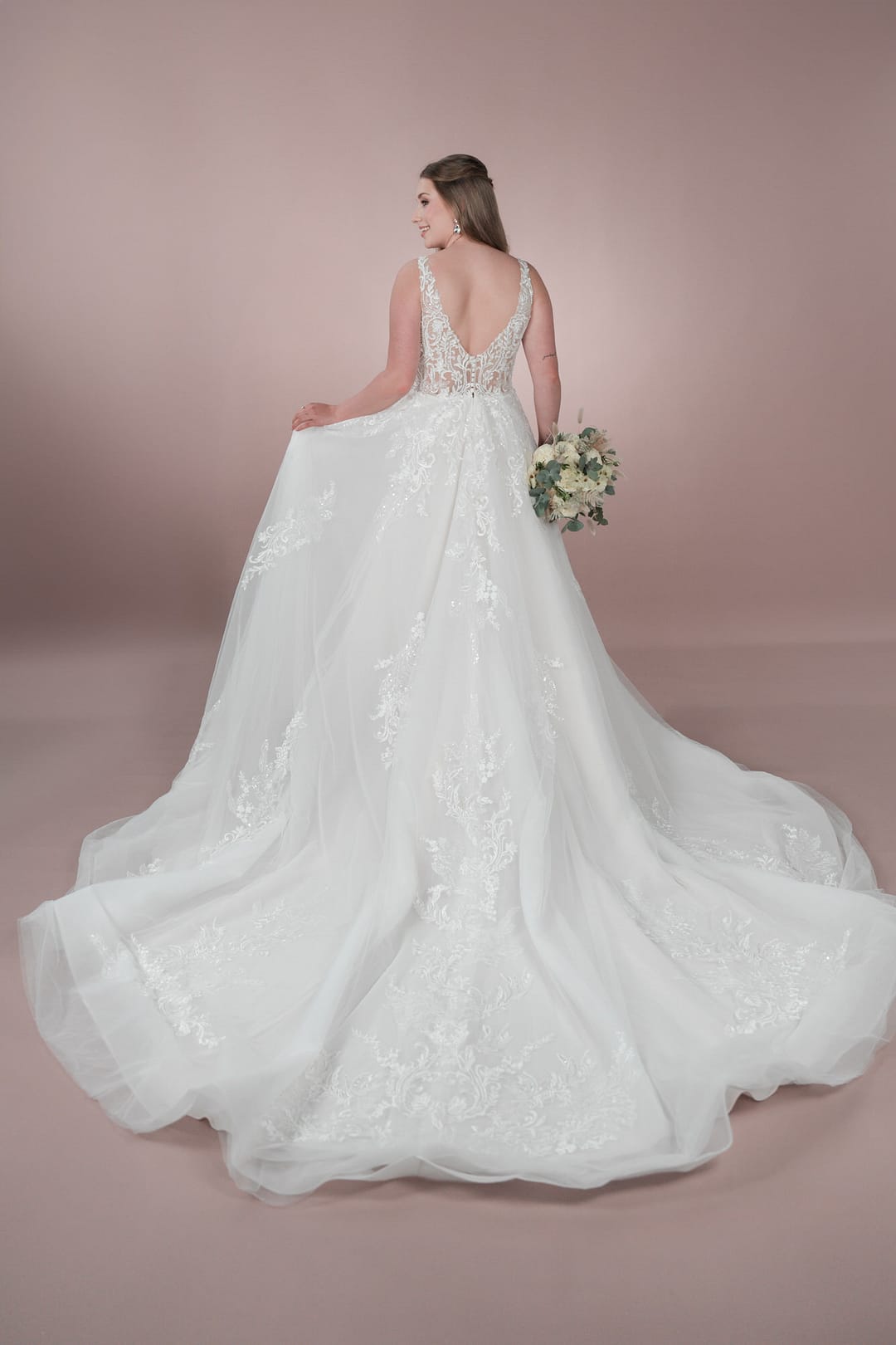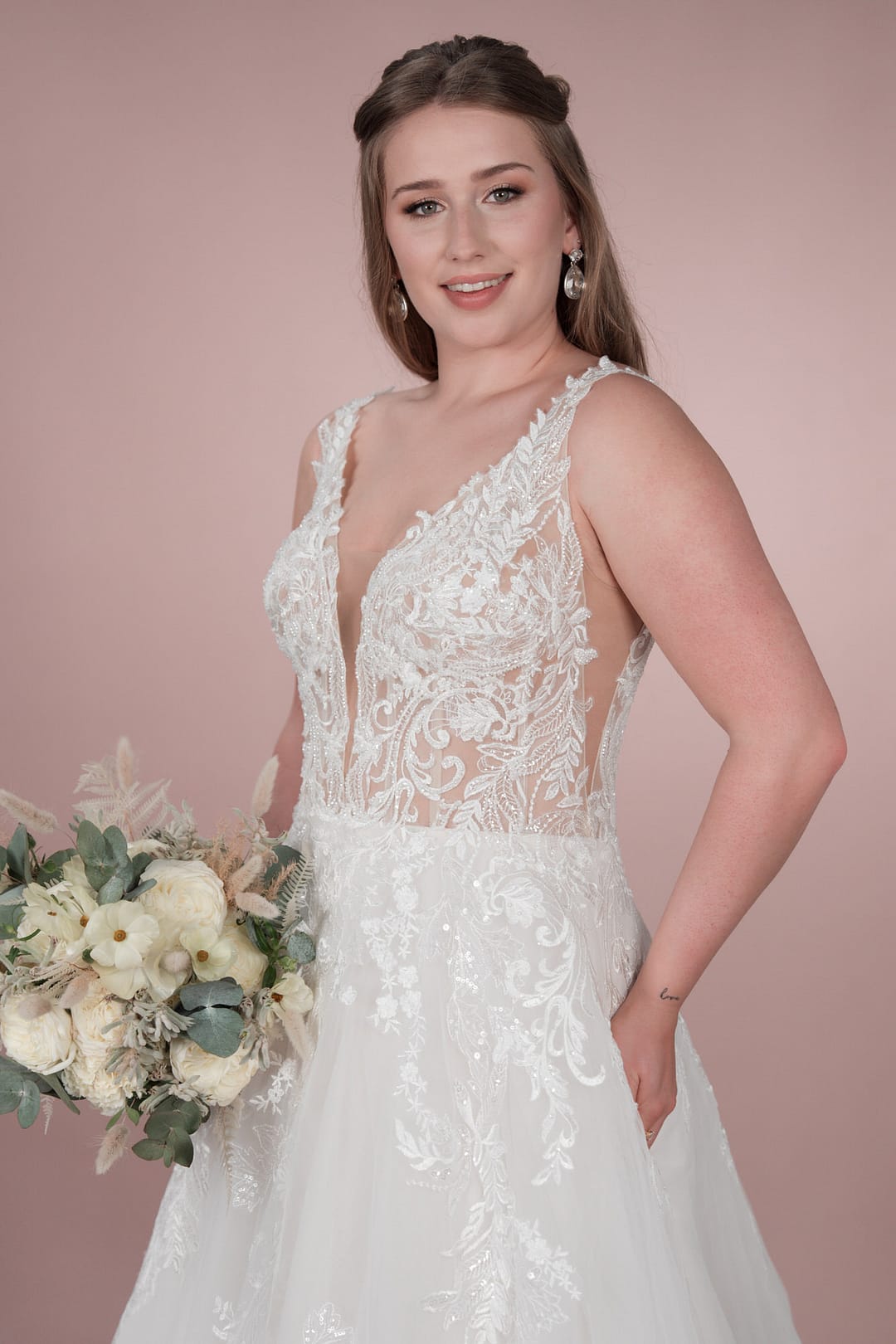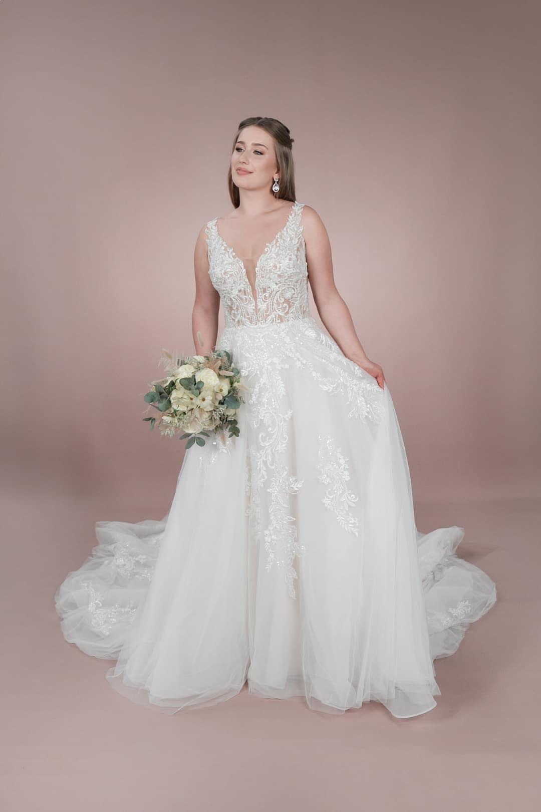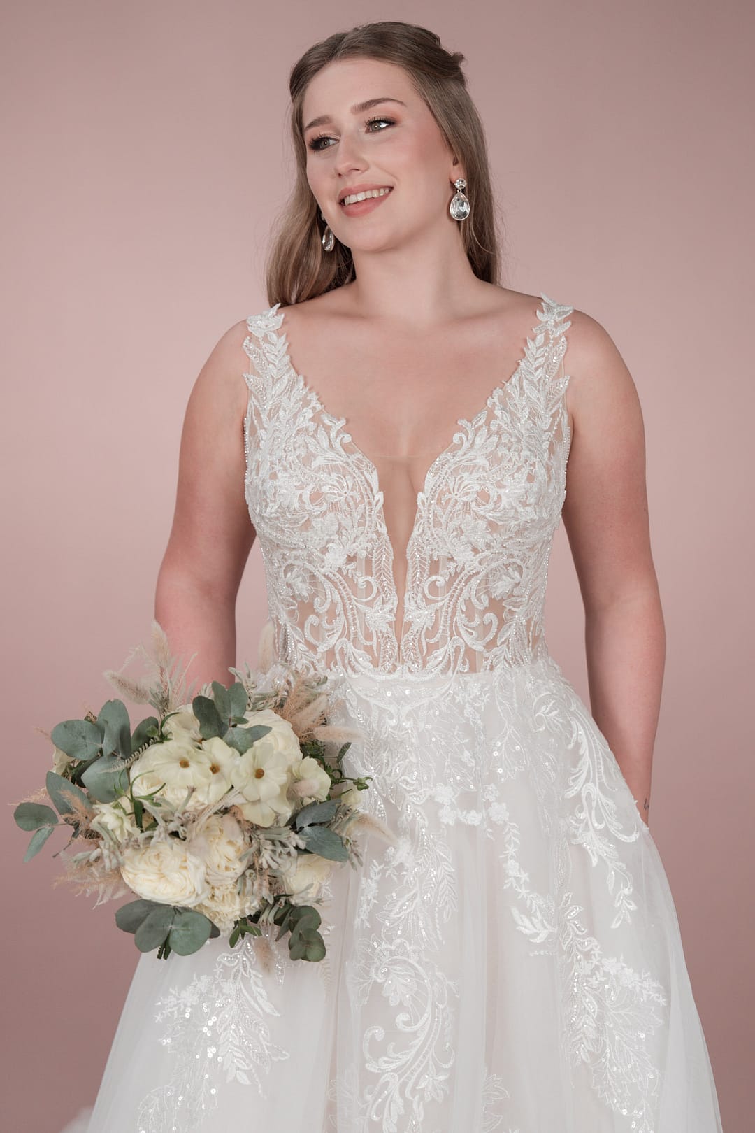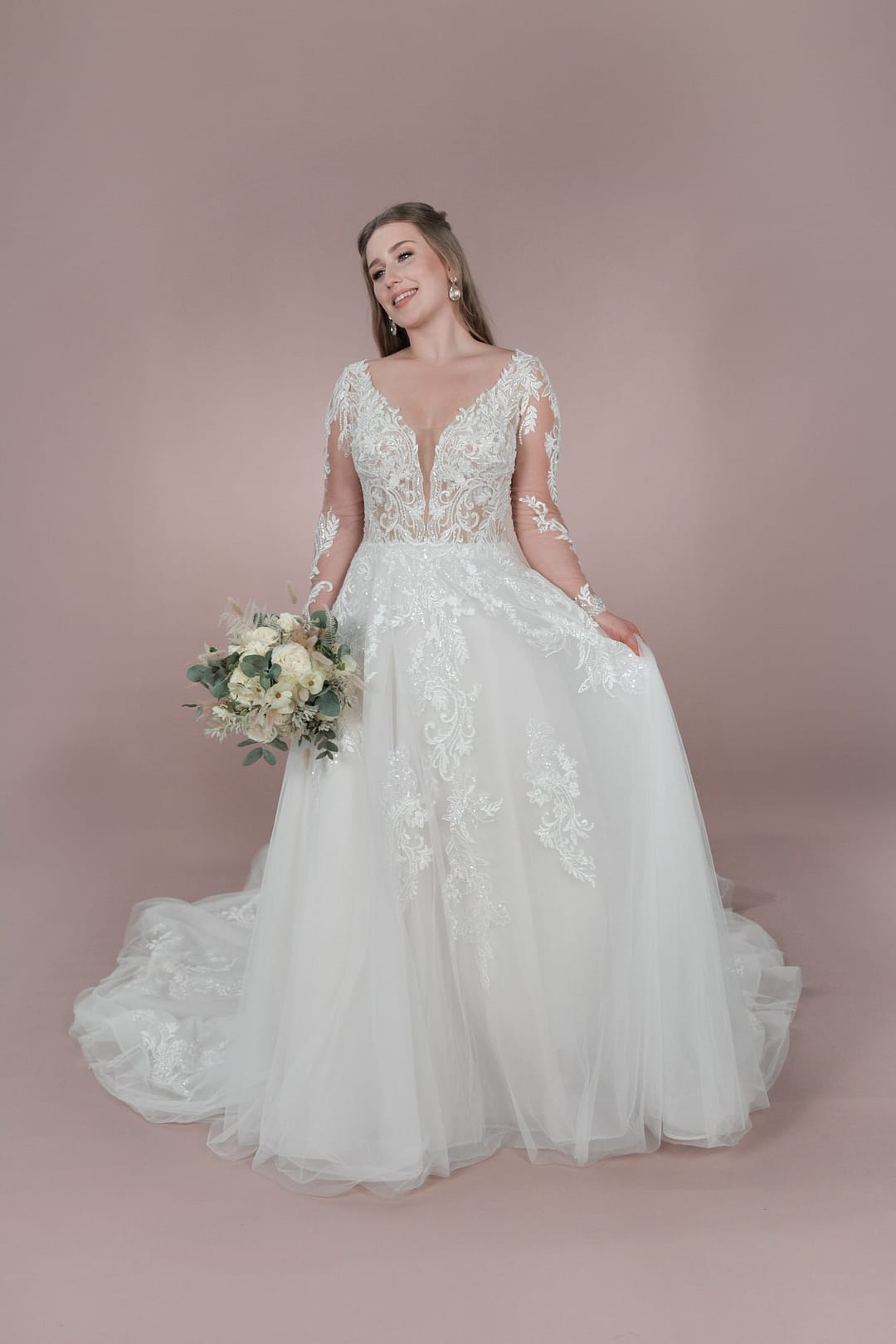 Liebe Braut, du suchst nach Romantik und Glamour? Dabei legst du Wert auf ein ausgereiftes Design und möchtest mit besonderen Details überrascht werden? Gerne möchtest du deine Arme bedecken und wünschst dir eine A-Linie, die zugleich modern und klassisch ist? Perfekt, Bridonista würde dir gerne Style Bridonista C23-06 vorstellen: Eine atemberaubende A-Linie mit tiefen V-Ausschnitten im Dekolleté und Rücken, sowie seitlichen Cut-Outs. Die Schnittführung ist schmeichelhaft für alle Konfektionsgrößen und zaubert einen raffiniert weiblichen Look. Für den perfekten Fit ist auch dieses Bridonista Design mit einer starken Korsage und Push-Up-Cups ausgestattet, so kannst du dich an deinem großen Tag sicher und wunderschön fühlen. Designtechnisch ist die Korsage durch eine hochwertige Bestickung akzentuiert; so sind verschiedene florale und geschwungene Applikationen mit Pailletten handbestickt. Zudem wird die Korsage von einer semitransparenten Lingerie-Optik beeinflusst, die das Design mit Sexiness und Leichtigkeit veredelt. Die zarten Ärmel sind aus hauchdünnem Tüll geschneidert und passend zur Korsage mit Spitzenelementen versehen. Die kurze Knopfleiste im Abschluss der Ärmel behaftet dieses Brautkleid mit Funktionalität und einem klassischen Hauch Nostalgie. Die Designerin liebt Überraschungen und legt großen Wert auf Wandelbarkeit und Individualität. Daher sind die Ärmel abknöpfbar. Im Handumdrehen kann ein neuer Look kreiert werden, der der Braut erlaubt, Gäste und Bräutigam erneut zu verzaubern. Florale und barocke Spitzenornamente fließen über die Korsage in die Taille, den Rock und die mittellange Märchenschleppe.