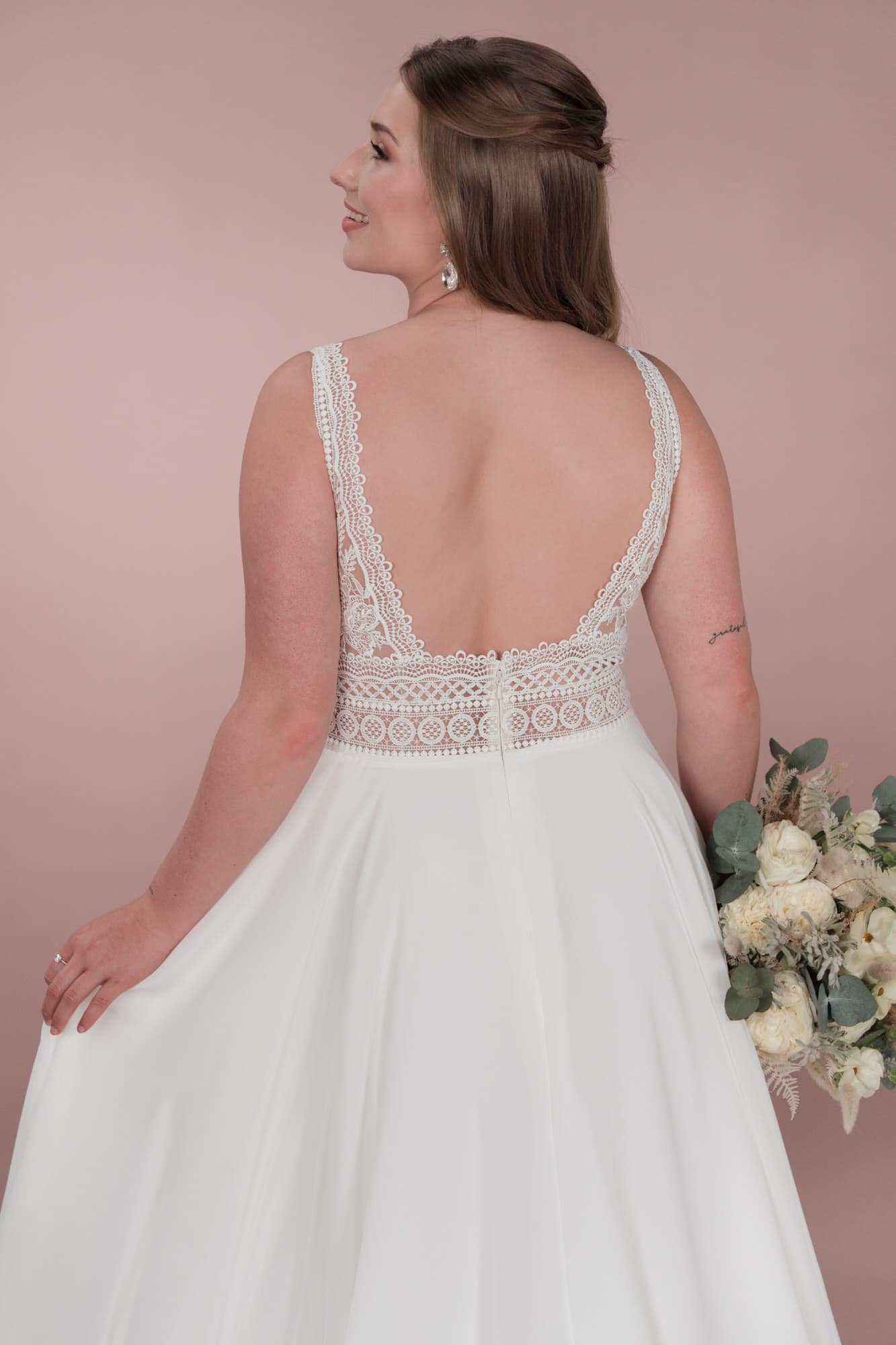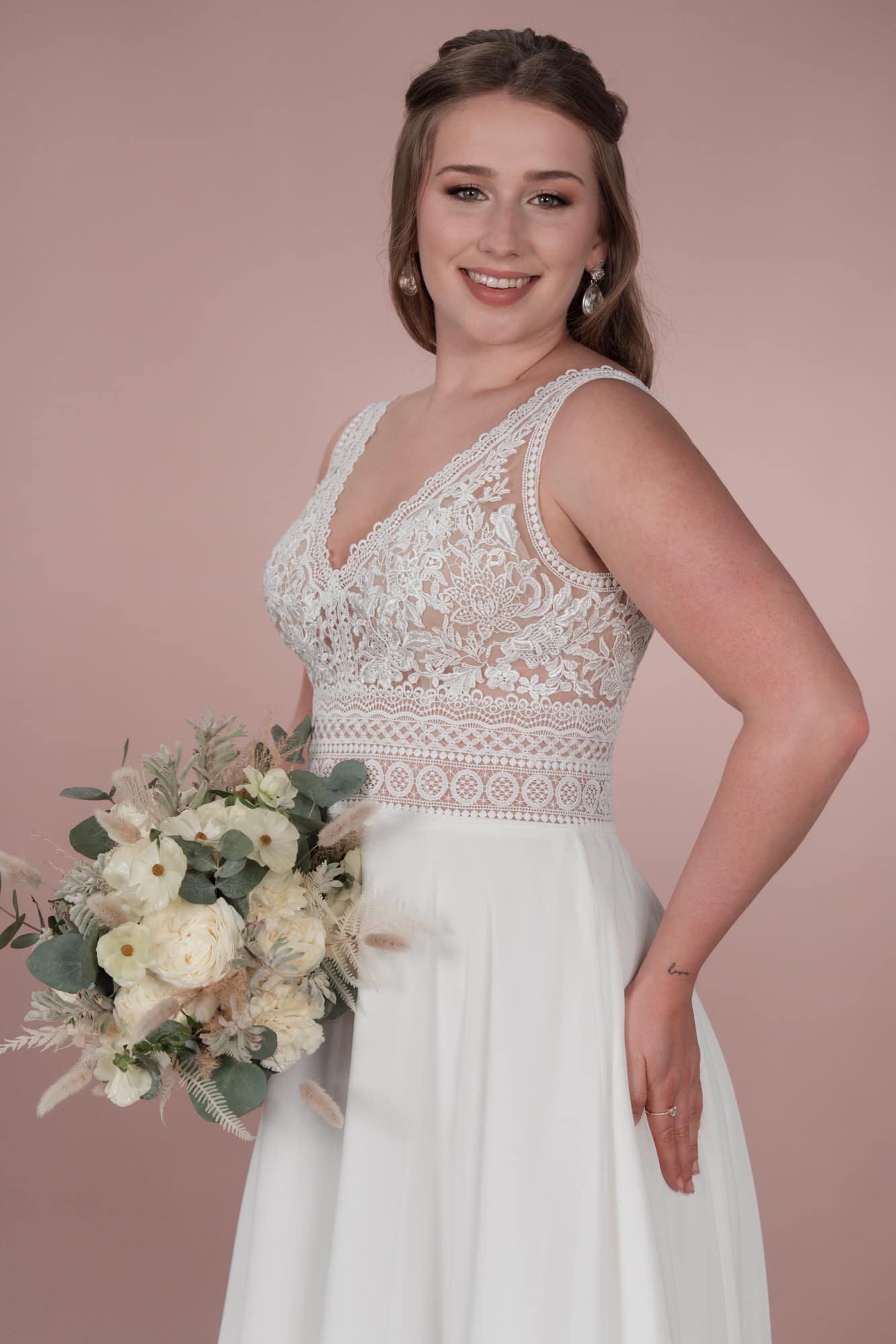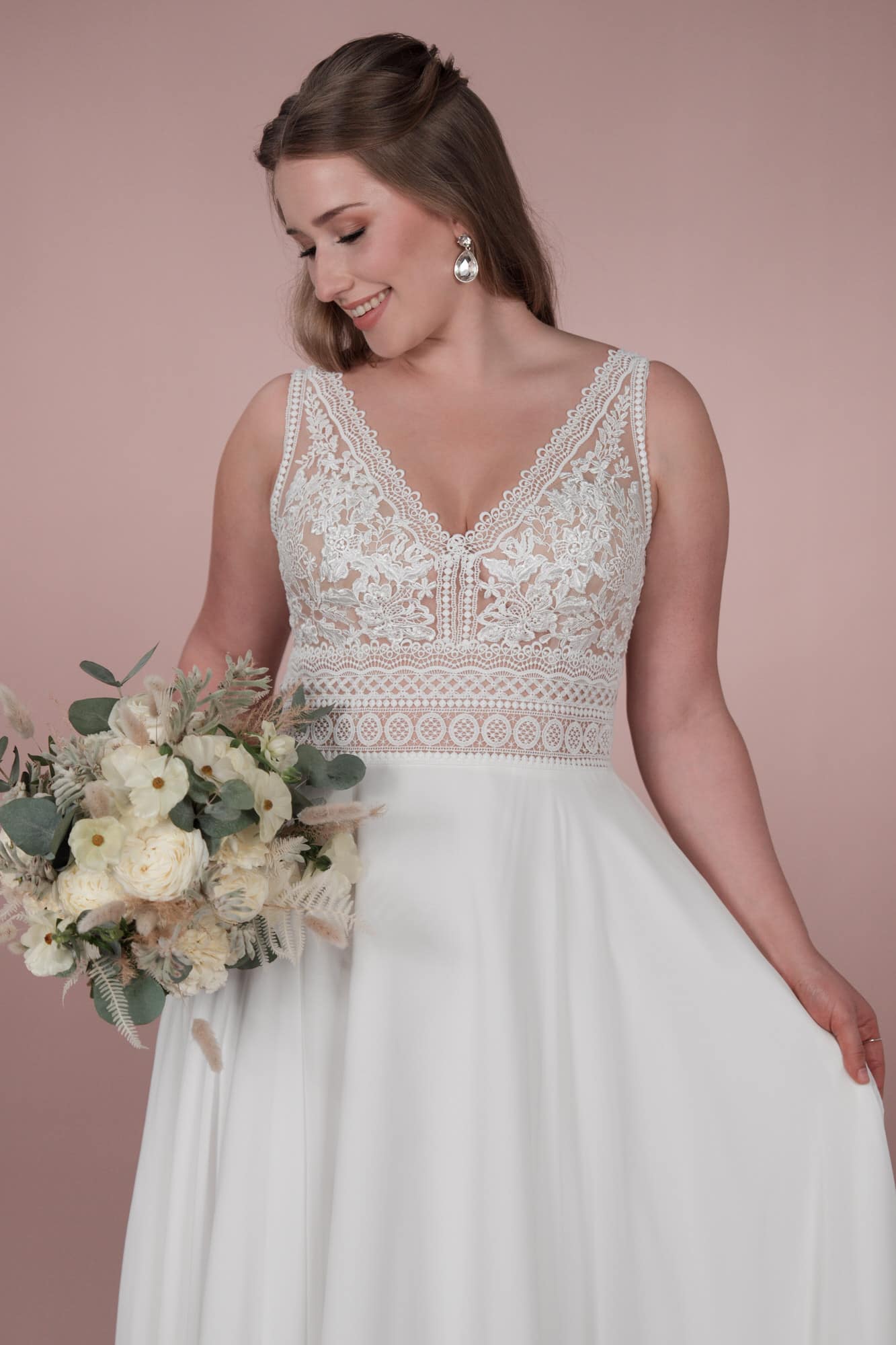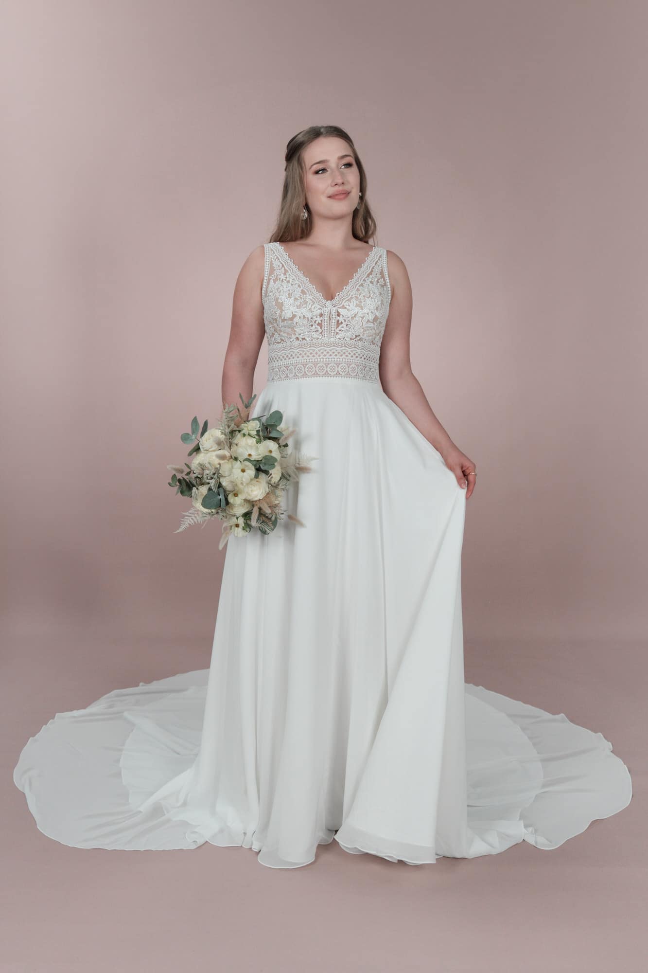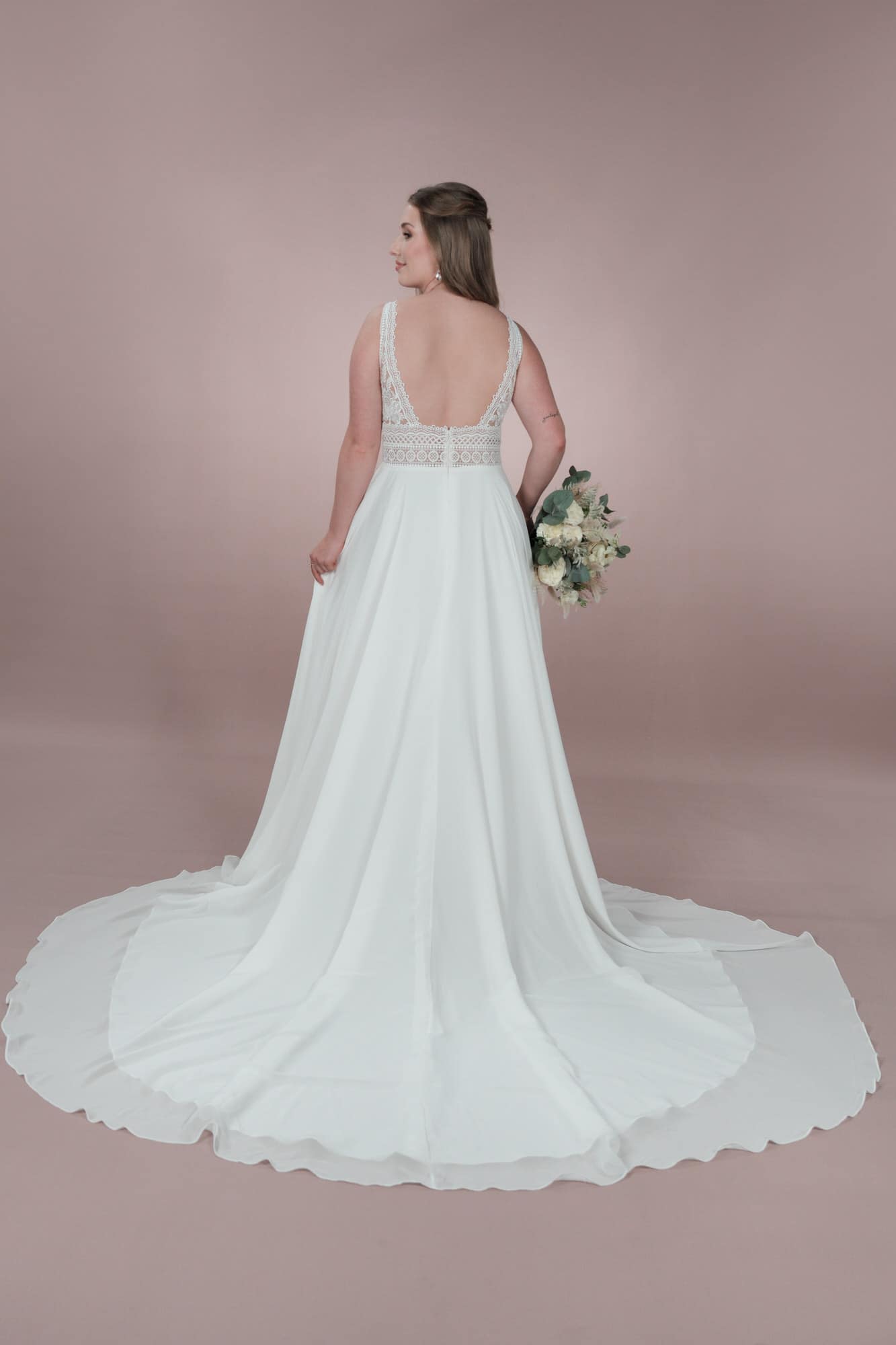Das Brionista C23-22 Brautkleid aus der Klassik Kollektion ist das perfekte Kleid für die Bridonista mit einem verspielten Sinn für Romantik. Die elegante Spitze, der tiefe V-Ausschnitt und der fließende Chiffon sorgen für einen klassischen Boho/Vintage-Look. Die A-Linie schmeichelt jeder Figur und lässt die Braut strahlen.