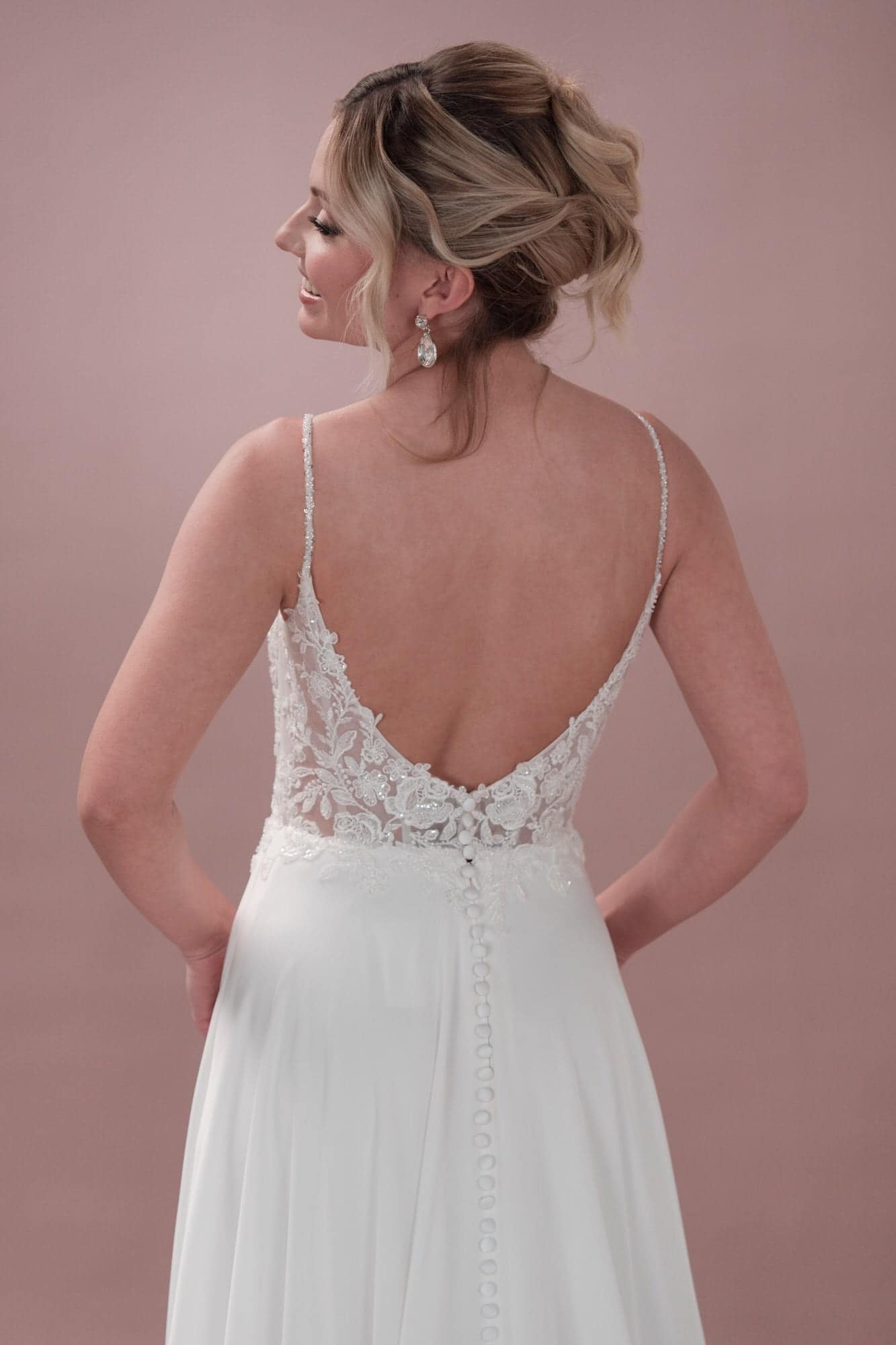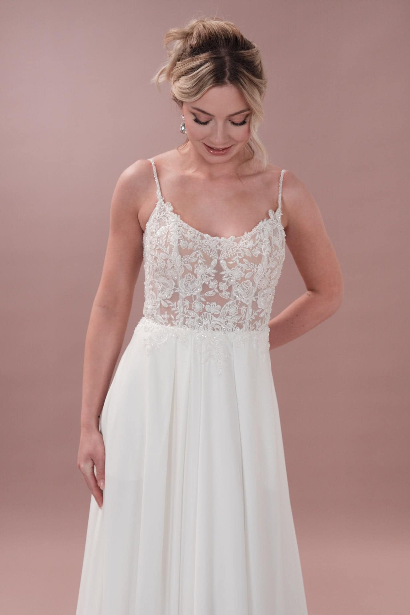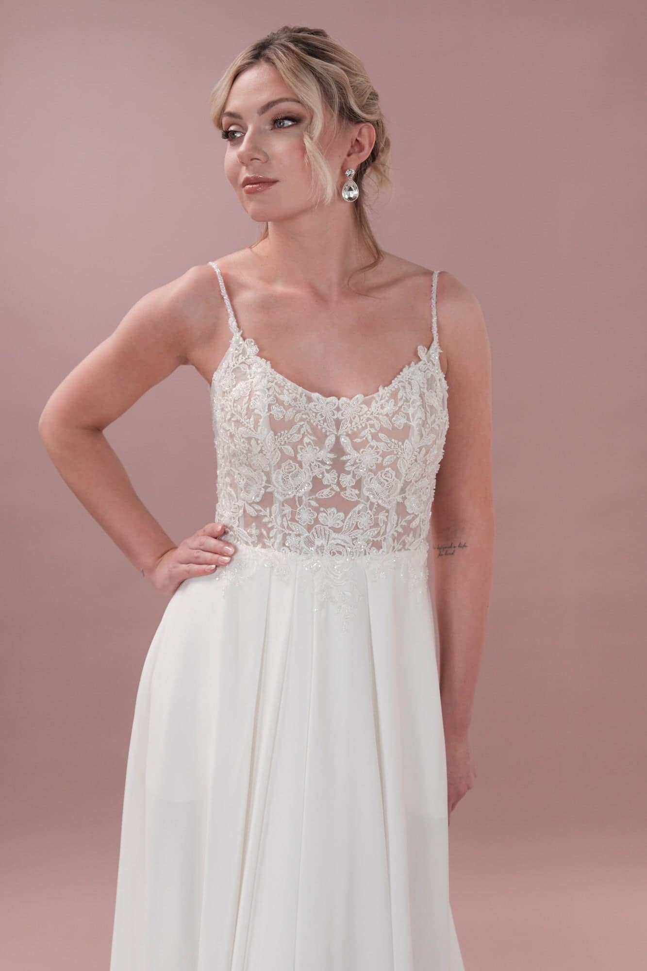 Sei die ultimative Bridonista in diesem verspielten Hochzeitskleid! Es besteht aus einer Corsage aus Spitze und einem Rock aus Satin, hat einen Ausschnitt und glitzernde Spaghettiträger mit Perlen. Die Spitze mit Pailletten und Perlen sorgt für einen Hauch von Skurrilität und die Haut-Push-up-Cups präsentieren Halt. Das Kleid mit 12 Stäbchen und Knopfleiste hat eine kurze Schleppe mit Beinschlitz, die für ein bisschen Flair sorgt. Und die Taschen sind praktisch. Mit diesem umwerfenden Hochzeitskleid ziehst du an deinem besonderen Tag alle Blicke auf dich! Mit seiner Kombination aus eleganter Spitze und Satin sorgt es dafür, dass du dich wie die ultimative Bridonista fühlst. Der geschwungene Ausschnitt und die perlenbesetzten Spaghettiträger sorgen für einen Hauch von Verspieltheit und Laune, während die rosa Spitze mit Pailletten und Perlen ein lustiges und einzigartiges Detail ist. Mit Push-up-Cups und 12 Stäbchen präsentiert dieses Kleid sowohl Halt als auch Struktur. Die Knopfleiste und die kurze Schleppe mit Beinschlitz sorgen für einen Hauch von Flair und die Taschen für eine praktische Note. Lass dir dieses einmalige Kleid für deinen großen Tag nicht entgehen!