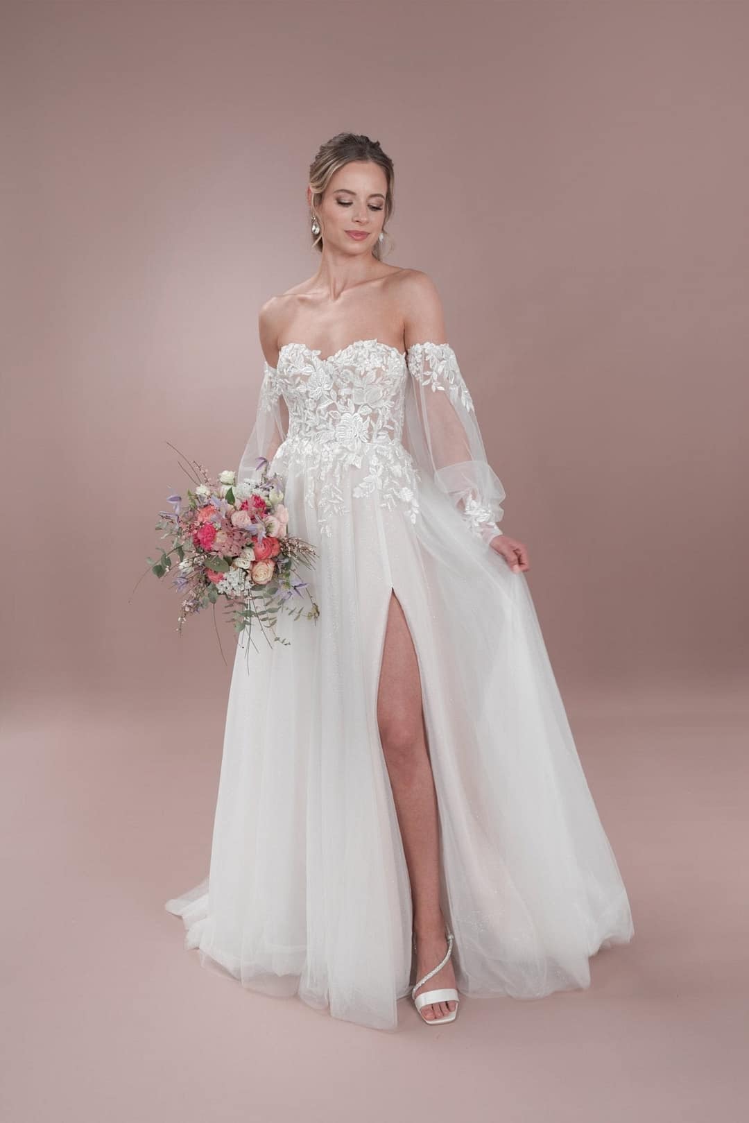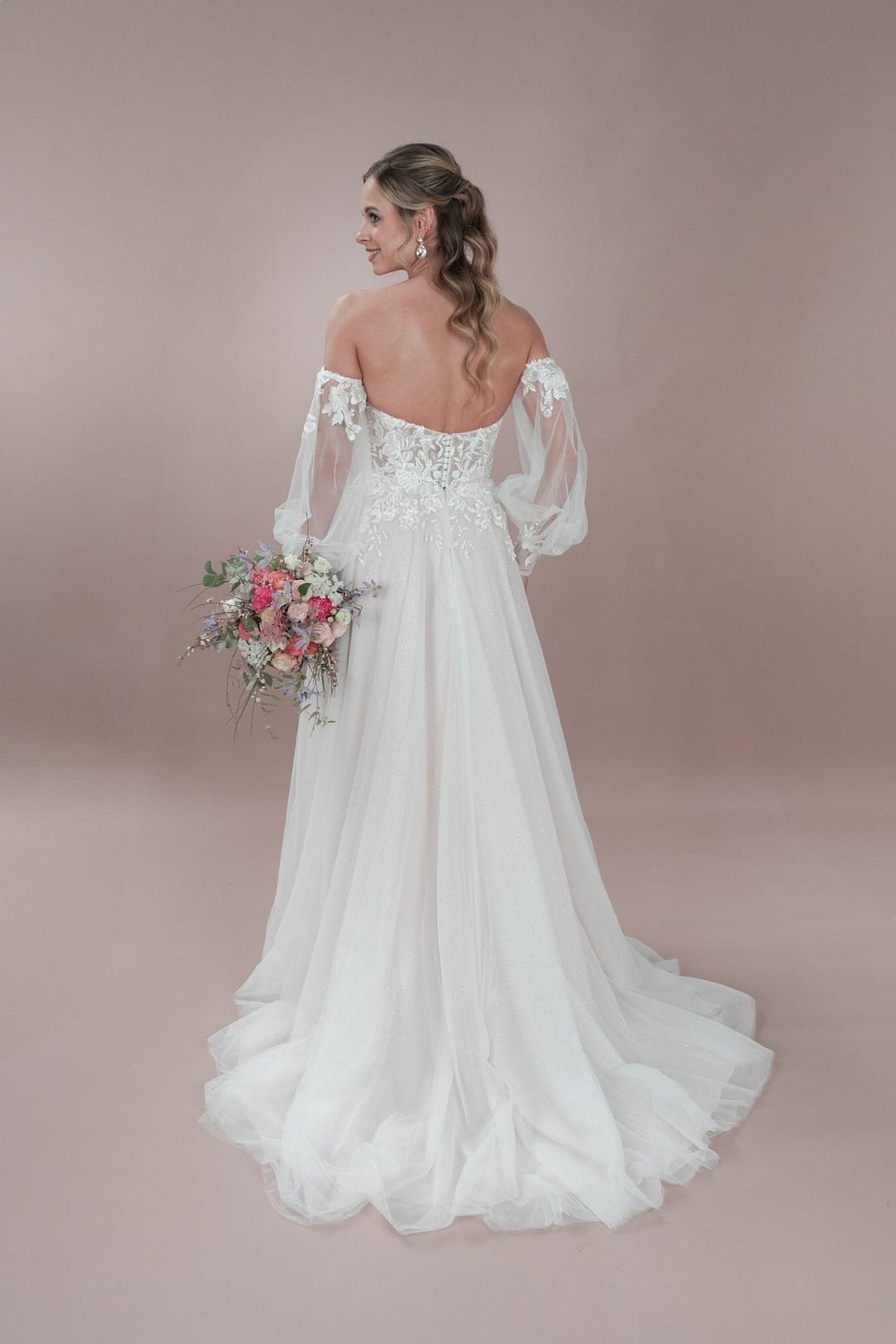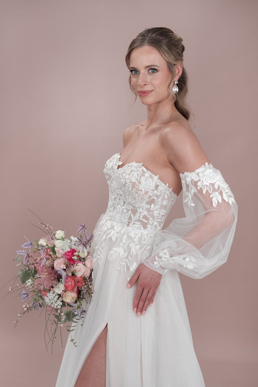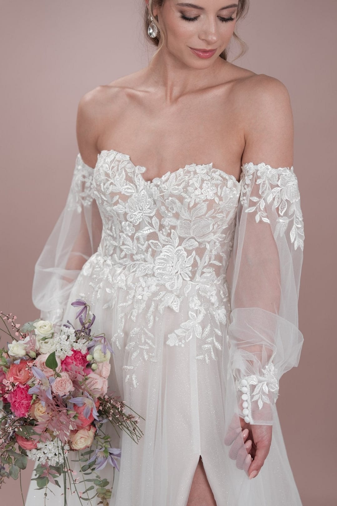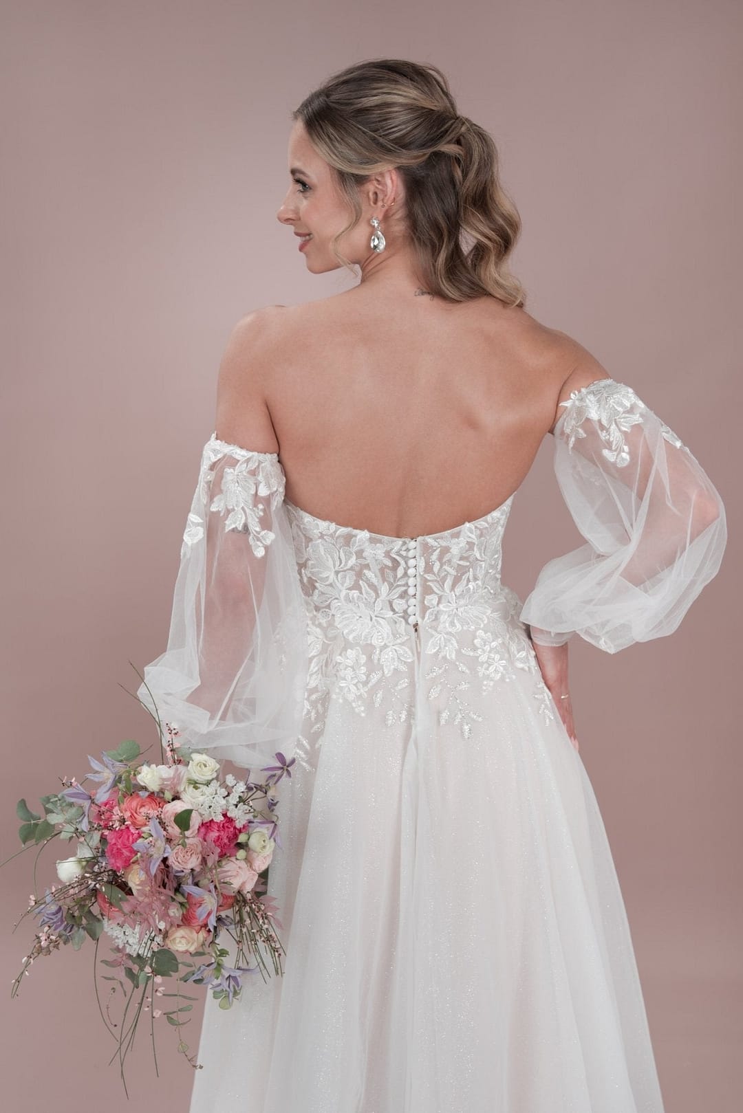 Mit dem Brautkleid C24-09 von Bridonista ziehst du alle Blicke auf dich und glänzt. Dieses Brautkleid in A-Linie hat einen Herzchen-Ausschnitt, verspielte Blattspitze und Glitzer-Tüll für einen Hauch von Romantik. Die abnehmbaren Ärmel und der tiefe Rücken sorgen für einen modernen Twist, während die Puffärmel einen Boho-Vintage-Look versprühen. Perfekt für die freigeistige Braut, die ihrem besonderen Tag einen Hauch von Laune verleihen möchte. Egal, ob du auf der Suche nach moderner Eleganz oder einem Vintage-Look bist, das Bridonista C24-09 Brautkleid ist genau das Richtige für dich. Das verspielte Design aus Blattspitze und Glitzertüll zieht alle Blicke auf sich, während du dich mit den abnehmbaren Ärmeln und dem tiefen Rücken bequem fühlst. Dieses Brautkleid in A-Linie ist perfekt für die freigeistige, skurrile Braut, die ihrem besonderen Tag einen Hauch von Romantik verleihen möchte.