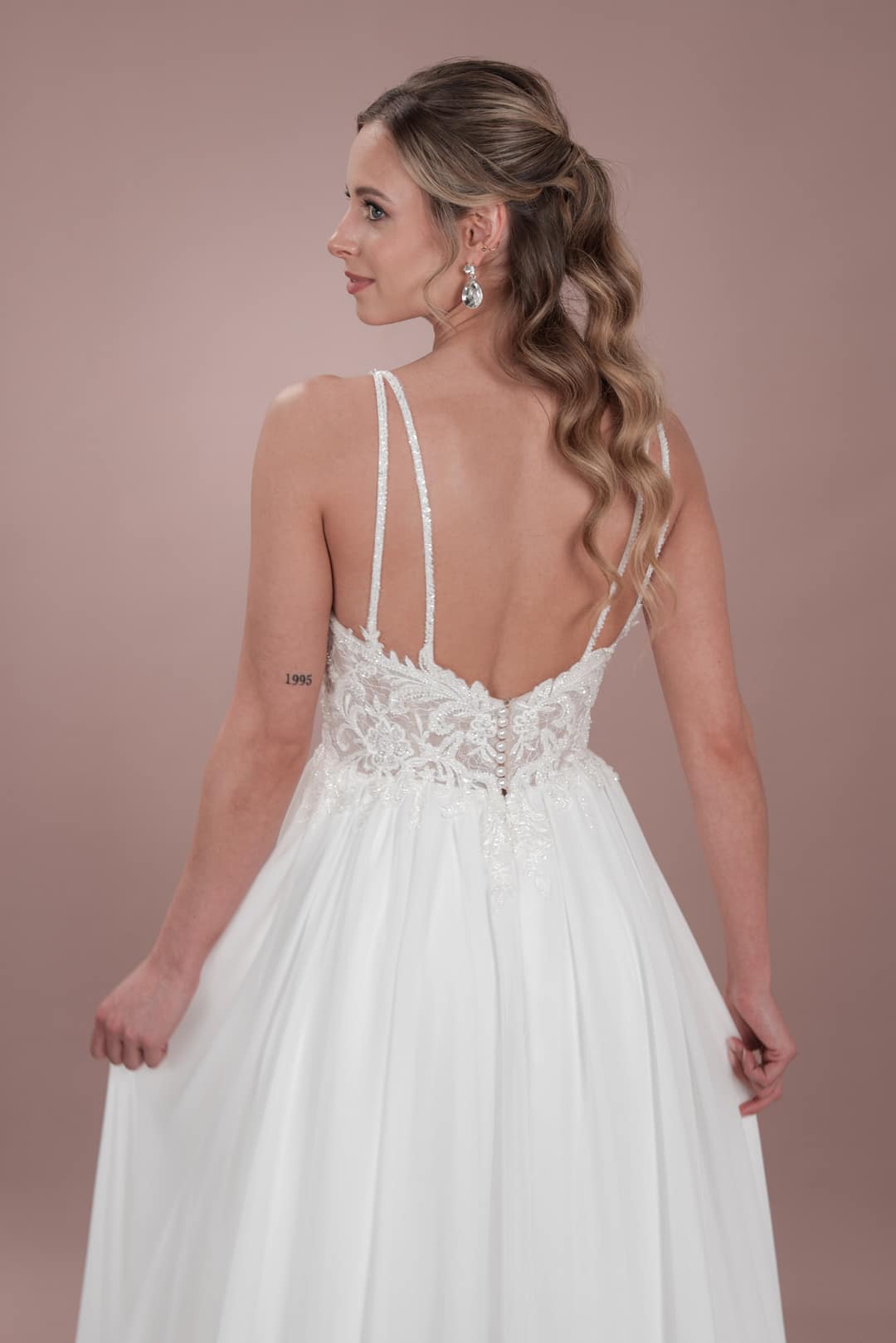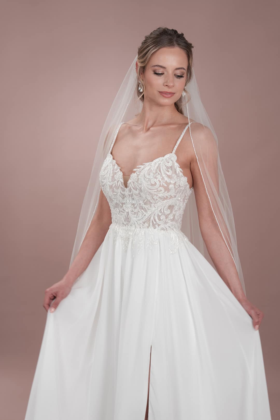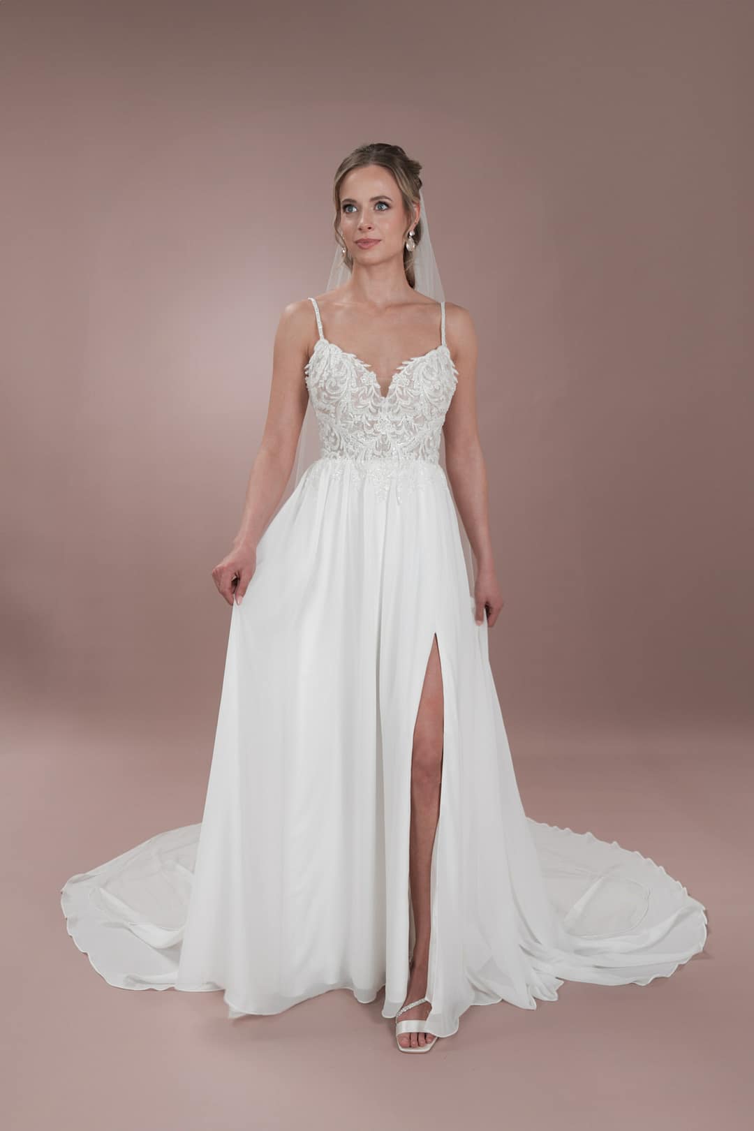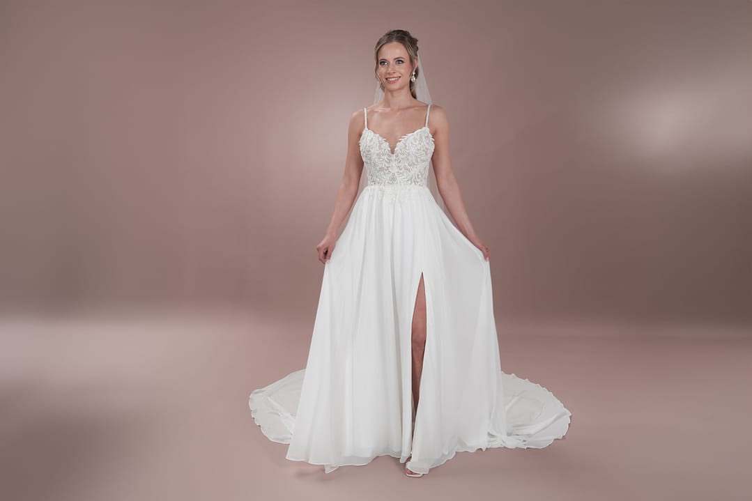 Sorge für einen unvergesslichen Tag mit dem Bridonista Hochzeitskleid C24-17! Dieses zeitlos klassische, moderne und elegante A-Linienkleid verfügt über Spaghettiträger, einen V-Ausschnitt und eine Spitzenstickerei, die deine Gäste dazu bringen wird, dass sie am liebsten bis zum Morgengrauen bleiben würden! Mit den doppelten Trägern am Rücken, der kurzen Knopfleiste, dem Chiffonrock mit Beinschlitz und der mittellangen Schleppe wirst du dich wie eine Königin fühlen! Mach schon, verblüffe dein Publikum mit etwas Transparenz! Mit diesem luxuriösen Kleidungsstück bist du die Königin des Balls. Die elegante Silhouette, die unübertroffene Handwerkskunst und der zeitlose Charme sorgen dafür, dass du dich wie die beste Version deiner selbst fühlst. Glänze an deinem besonderen Tag – du hast es verdient!