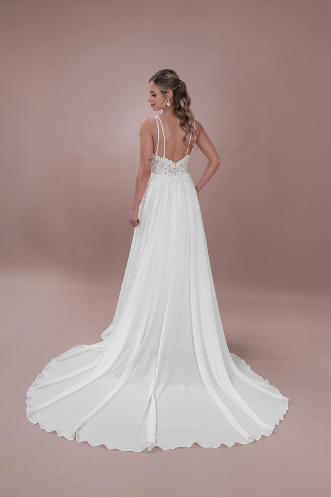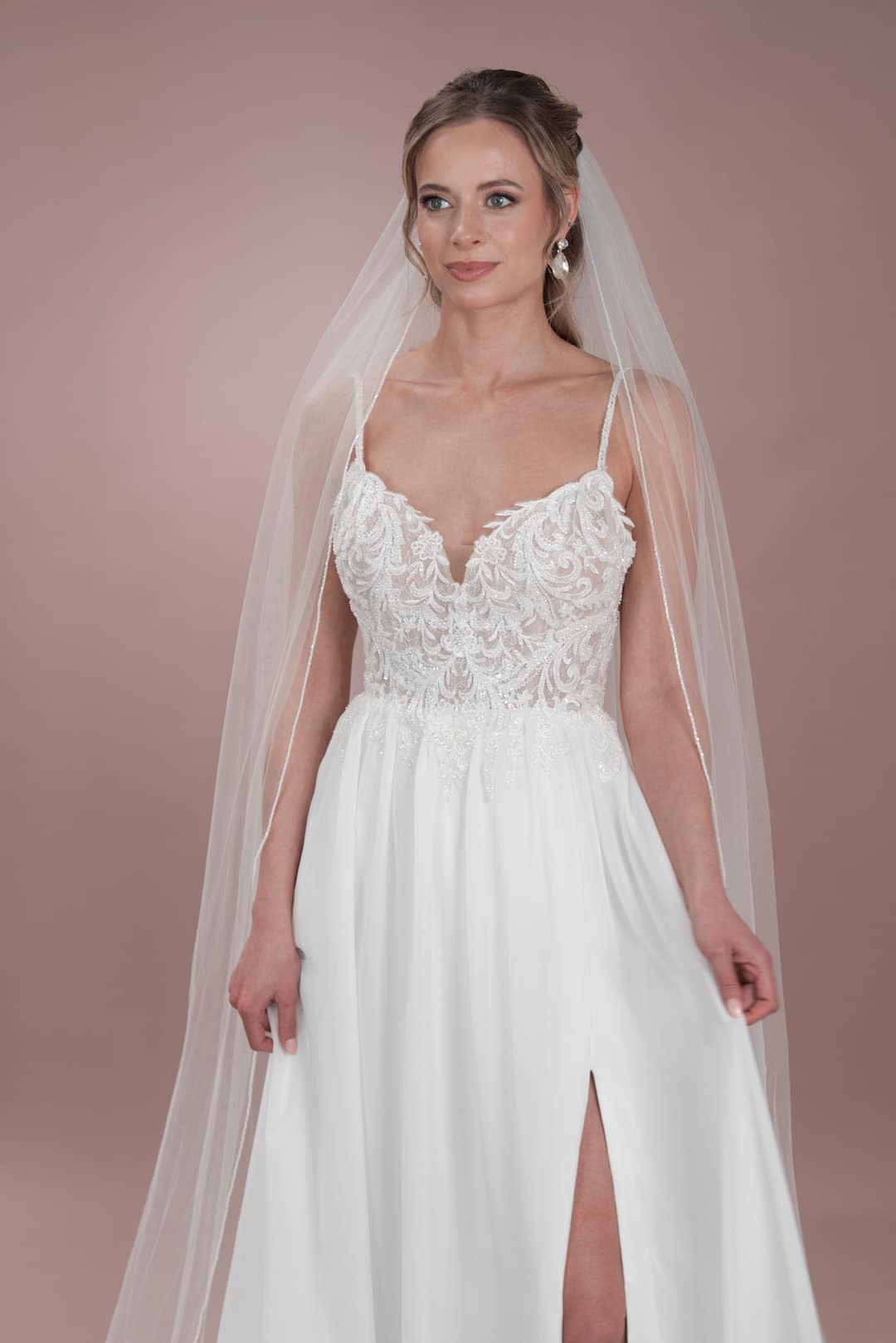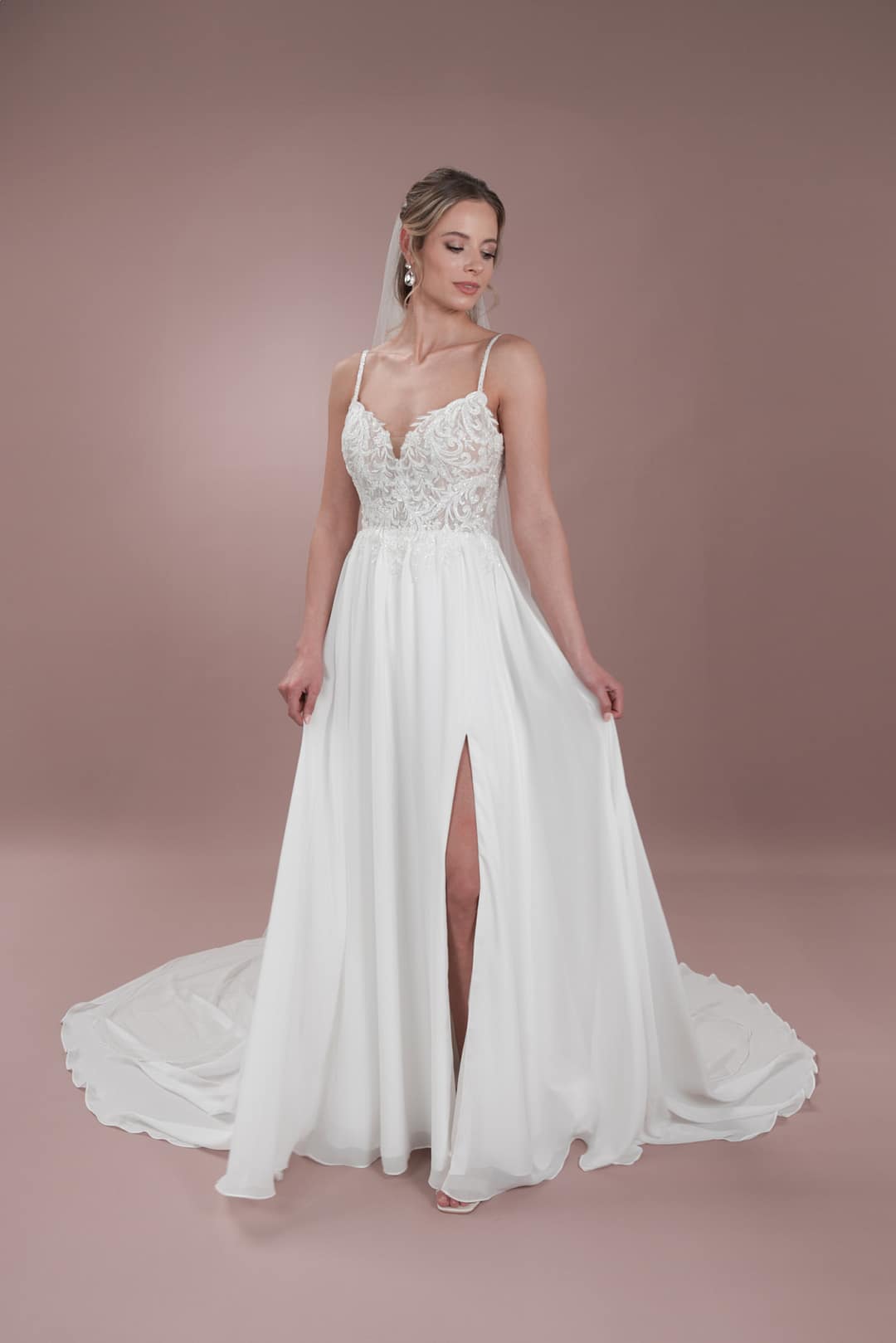 Sorge für einen unvergesslichen Tag mit dem Bridonista Hochzeitskleid C24-17! Dieses zeitlos klassische, moderne und elegante A-Linienkleid verfügt über Spaghettiträger, einen V-Ausschnitt und eine Spitzenstickerei, die deine Gäste dazu bringen wird, dass sie am liebsten bis zum Morgengrauen bleiben würden! Mit den doppelten Trägern am Rücken, der kurzen Knopfleiste, dem Chiffonrock mit Beinschlitz und der mittellangen Schleppe wirst du dich wie eine Königin fühlen! Mach schon, verblüffe dein Publikum mit etwas Transparenz! Mit diesem luxuriösen Kleidungsstück bist du die Königin des Balls. Die elegante Silhouette, die unübertroffene Handwerkskunst und der zeitlose Charme sorgen dafür, dass du dich wie die beste Version deiner selbst fühlst. Glänze an deinem besonderen Tag – du hast es verdient!