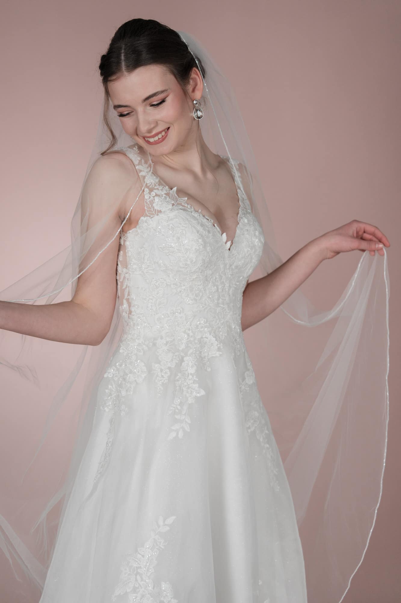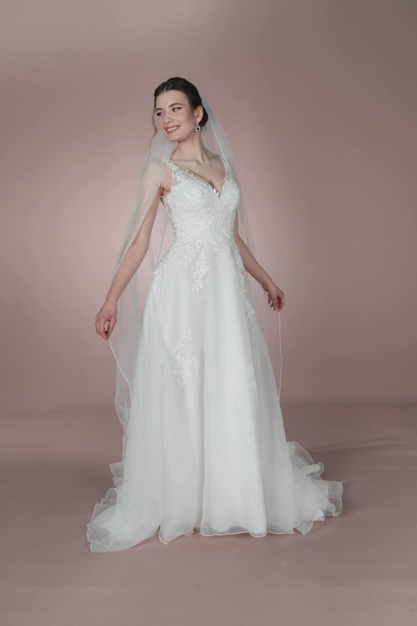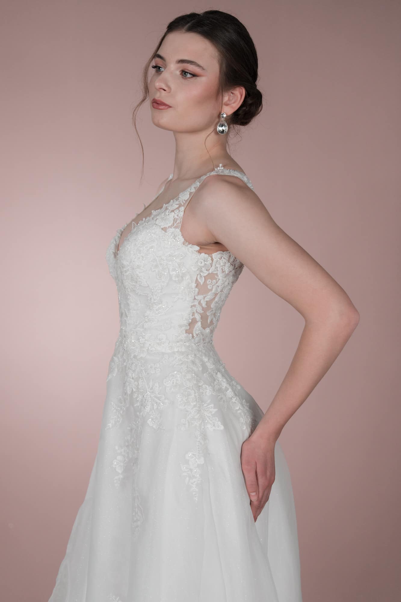 Die Spitze des Kleides ist mit Pailetten verziert, die bei jedem Schritt subtil glitzern. Der Organza-Rock fällt sanft und verleiht dem Kleid ein romantisches Flair. Zusätzlich sind Perlen entlang des Ausschnitts angebracht, um dem Kleid einen klassischen Touch zu verleihen.