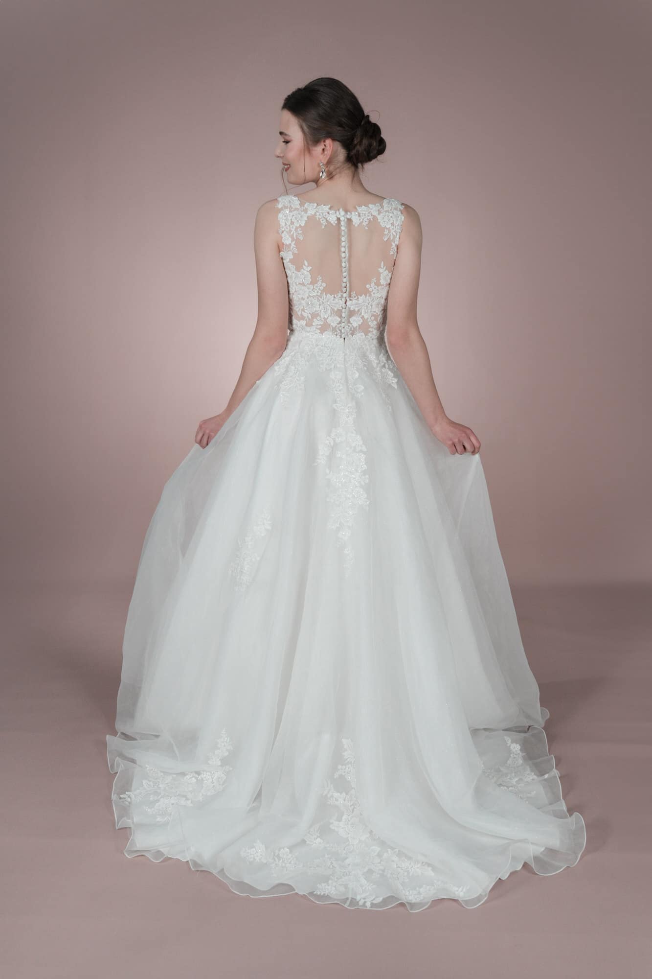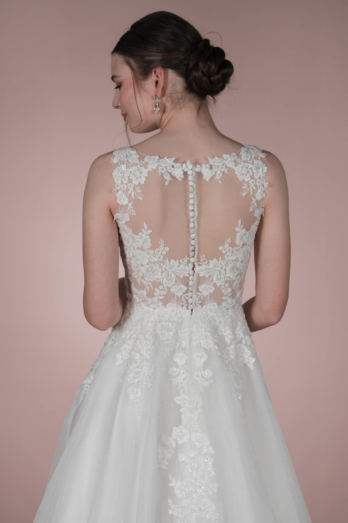 Du wirst diesen Bridonista C24-22 einfach lieben! Mit seinem V-Ausschnitt und dem geschlossenen Rücken verleiht er dir einen eleganten Look, während die Knopfleiste auf der Rückseite einen Hauch von verspielter Raffinesse hinzufügt. Die Kombination aus Tattoospitze und A-Linie sorgt für eine schmeichelhafte Passform, die deine Figur betont.