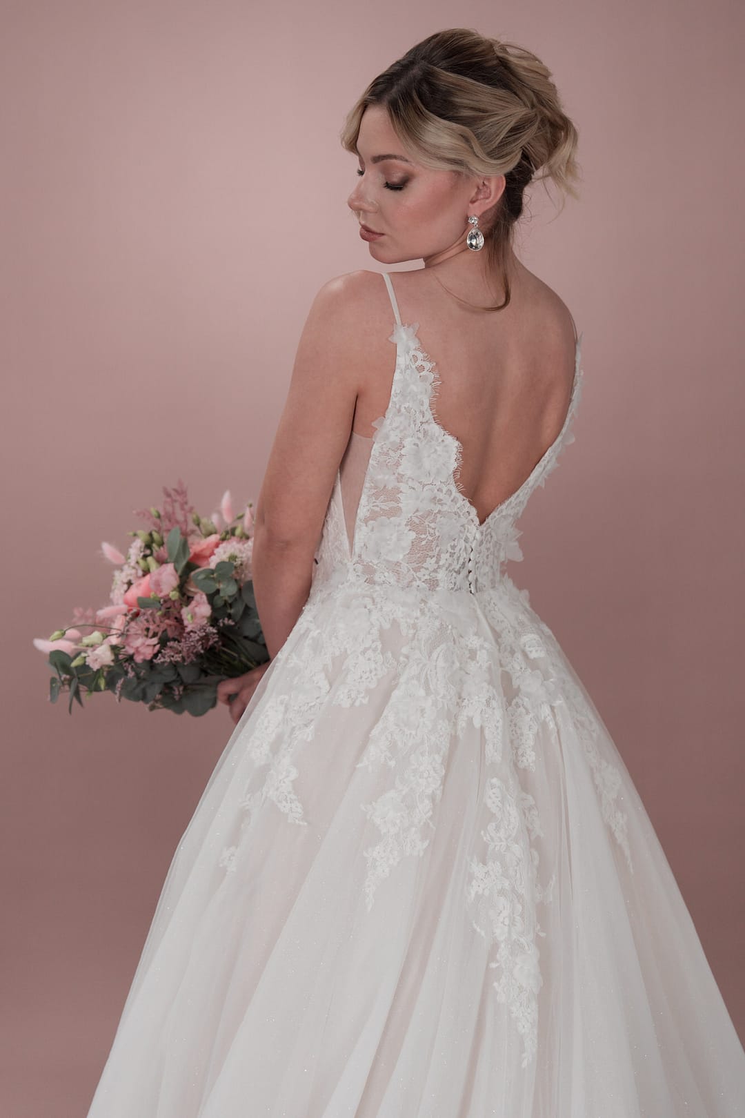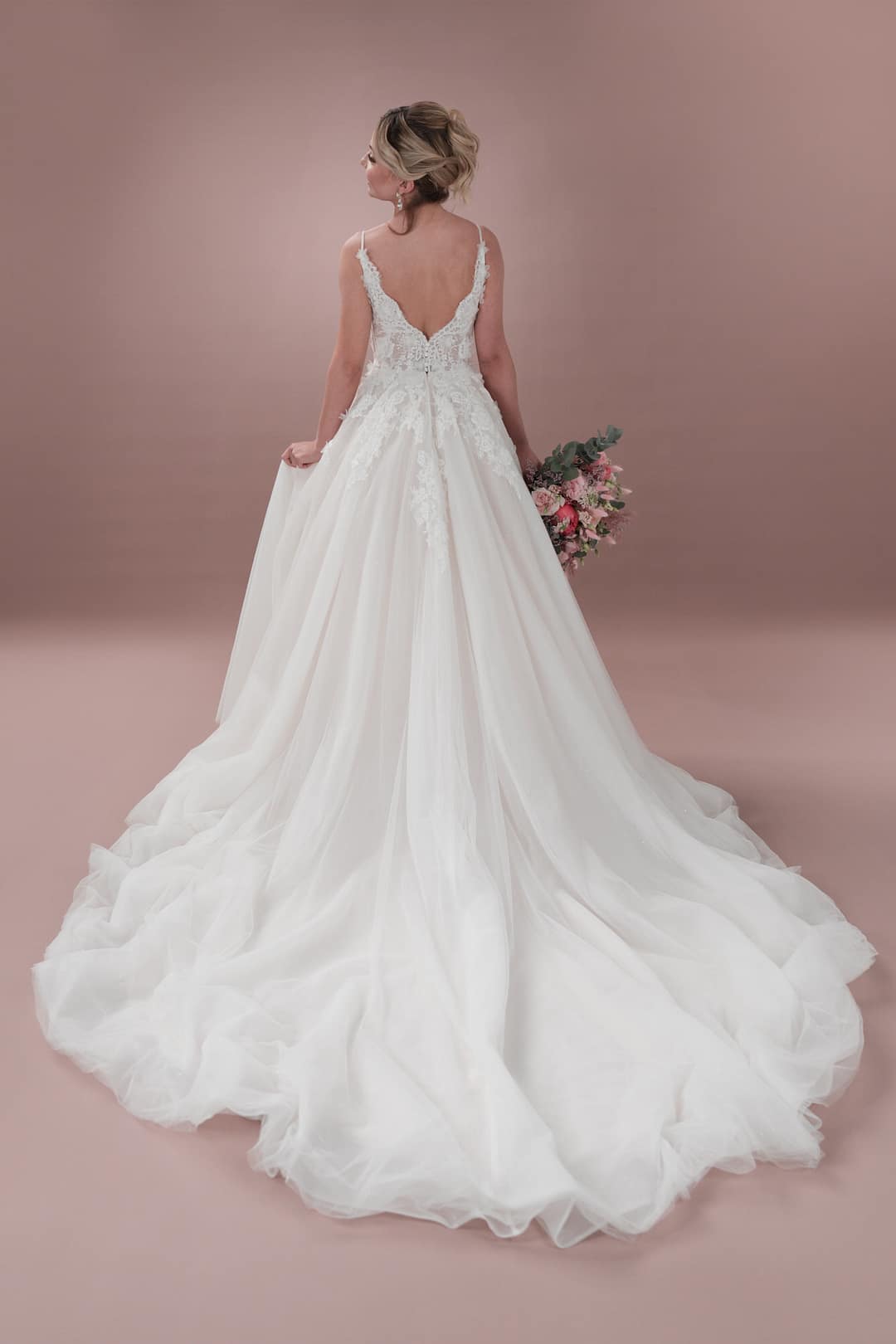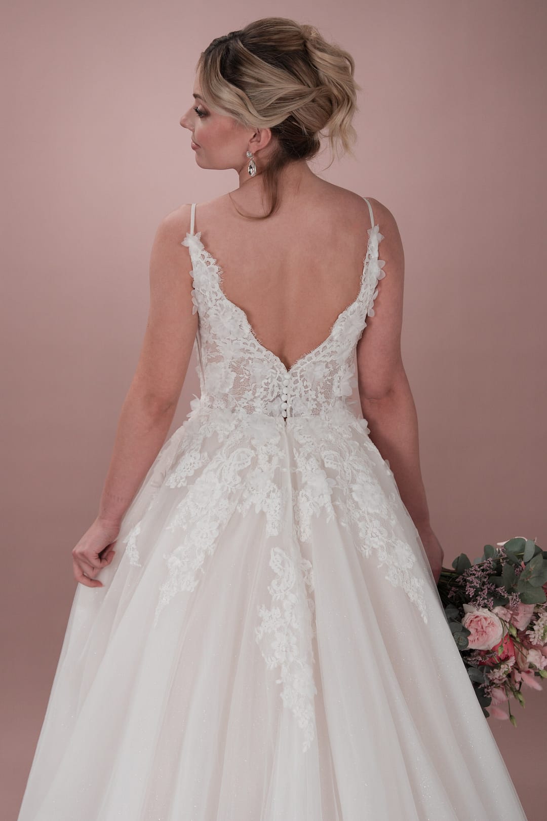 Das Hochzeitskleid C24-26 von Bridonista sorgt dafür, dass all deine romantischen Träume wahr werden! Sein klassisches Design mit V-Ausschnitt, V-Rücken, V-Cutouts und langer Schleppe, die A-Linie und die zierliche Prinzessinnen-Taille sorgen dafür, dass es allen Körpertypen schmeichelt. Das Material aus glitzerndem Tüll und der Reißverschluss oder die Spitze geben dem Kleid den letzten Schliff! Ein wunderschönes, maßgeschneidertes Kleid für die Boho-Braut – übernehme deinen besonderen Tag von gewöhnlich zu außergewöhnlich!