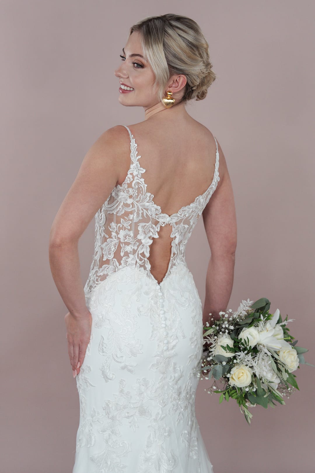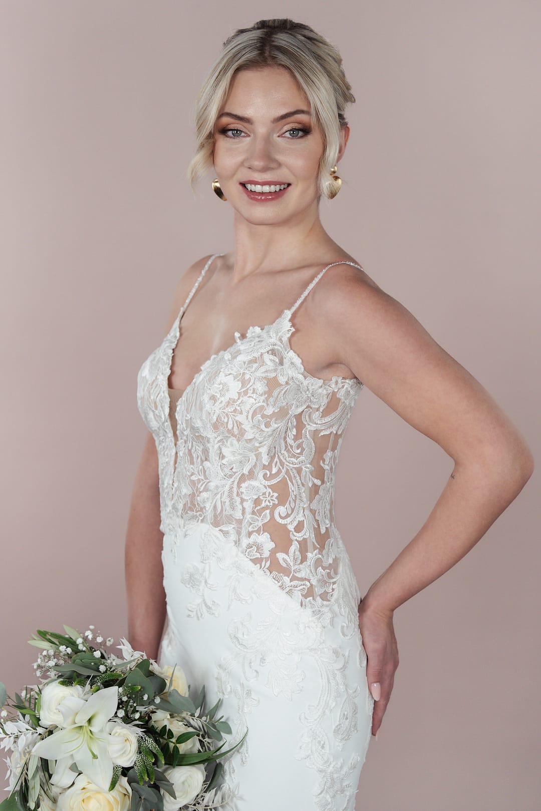 Das Chantilly, das edel in verschiedenen Design-Elementen eingearbeitet ist, ergänzt das Kleid auf elegante Weise und bringt eine romantische Tiefe in den Look.