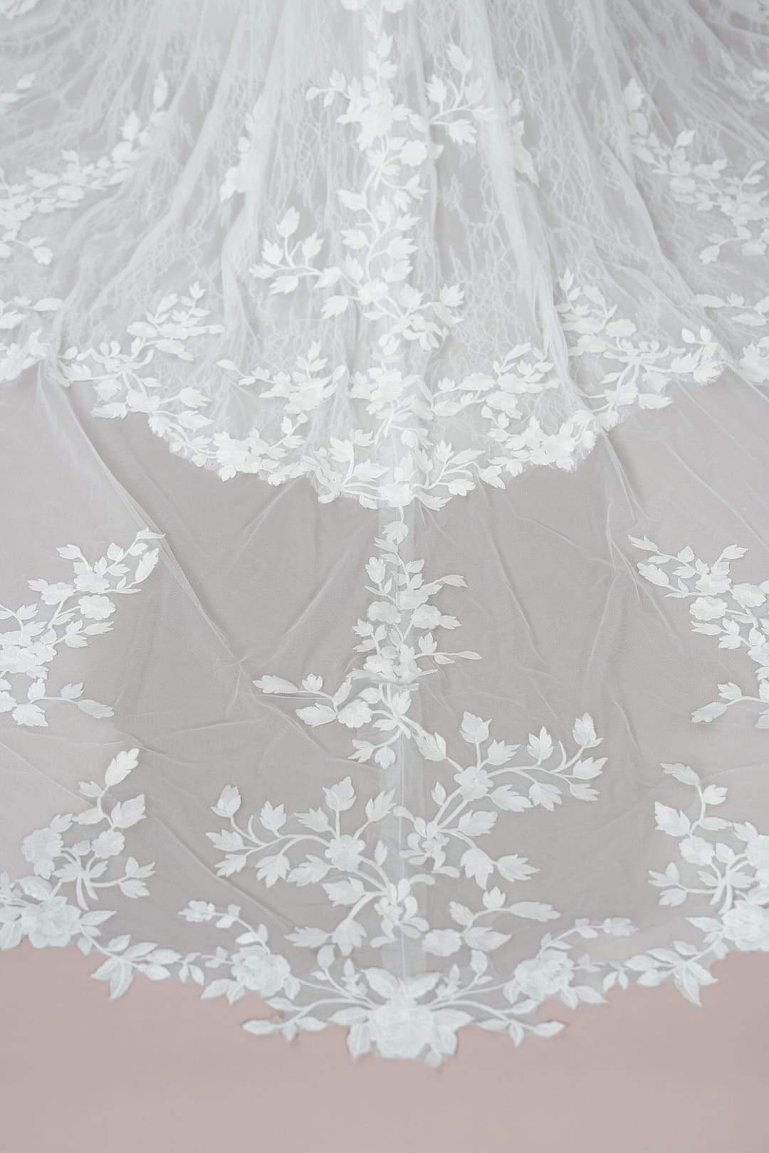 Das Kleid ist außerdem mit zarter Blätterspitze verziert, die für eine romantische Ausstrahlung sorgt und dem Design eine liebevolle Detailverliebtheit verleiht. Der Illusion-Tüll verstärkt den gefühlvollen Charakter des Kleides und bringt eine subtile Transparenz ins Spiel, die den Lingerie-Look betont.