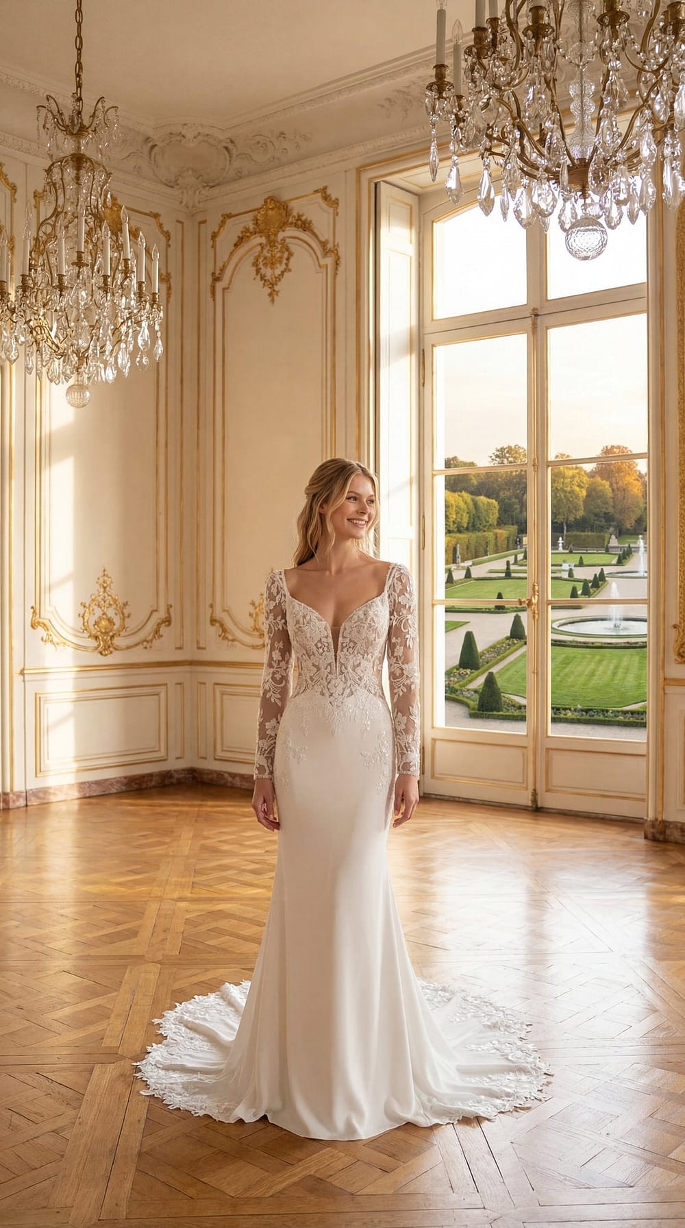 Die Corsage ist ein wahres Meisterwerk, verziert mit filigraner floraler Spitze, die wie zarte Blüten über deine Brust und Taille tanzt und deine feminine Schönheit auf eine Weise hervorhebt, die subtil und doch unwiderstehlich sexy wirkt. Seitliche Cutouts verleihen diesem Design einen Hauch von Abenteuer, indem sie deine Haut sanft enthüllen und dir ein aufregendes, selbstbewusstes Gefühl geben, das deine natürlichen Linien feiert, ohne je zu viel preiszugeben. Der V-Ausschnitt vorn rahmt dein Dekolleté mit einer eleganten Tiefe, die deinen Blick lenkt und eine Prise von Verführung hinzufügt, perfekt für eine Braut, die ihre Sinnlichkeit ausleben möchte.