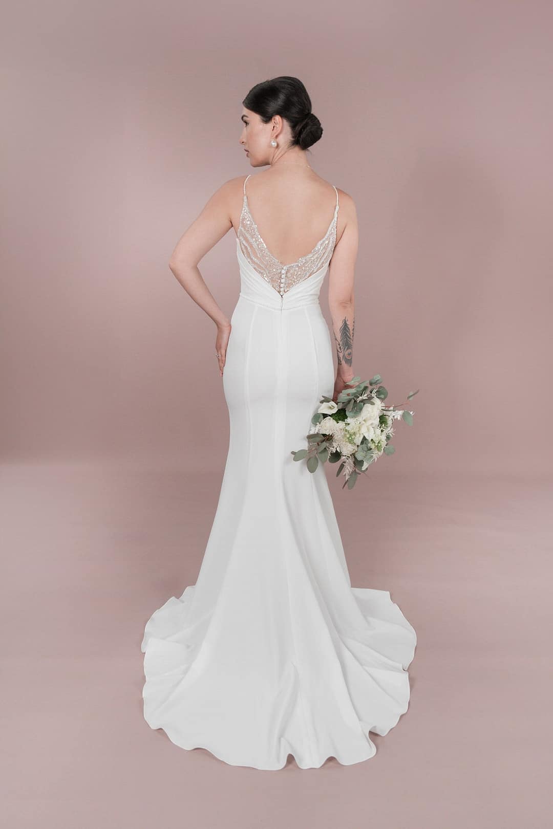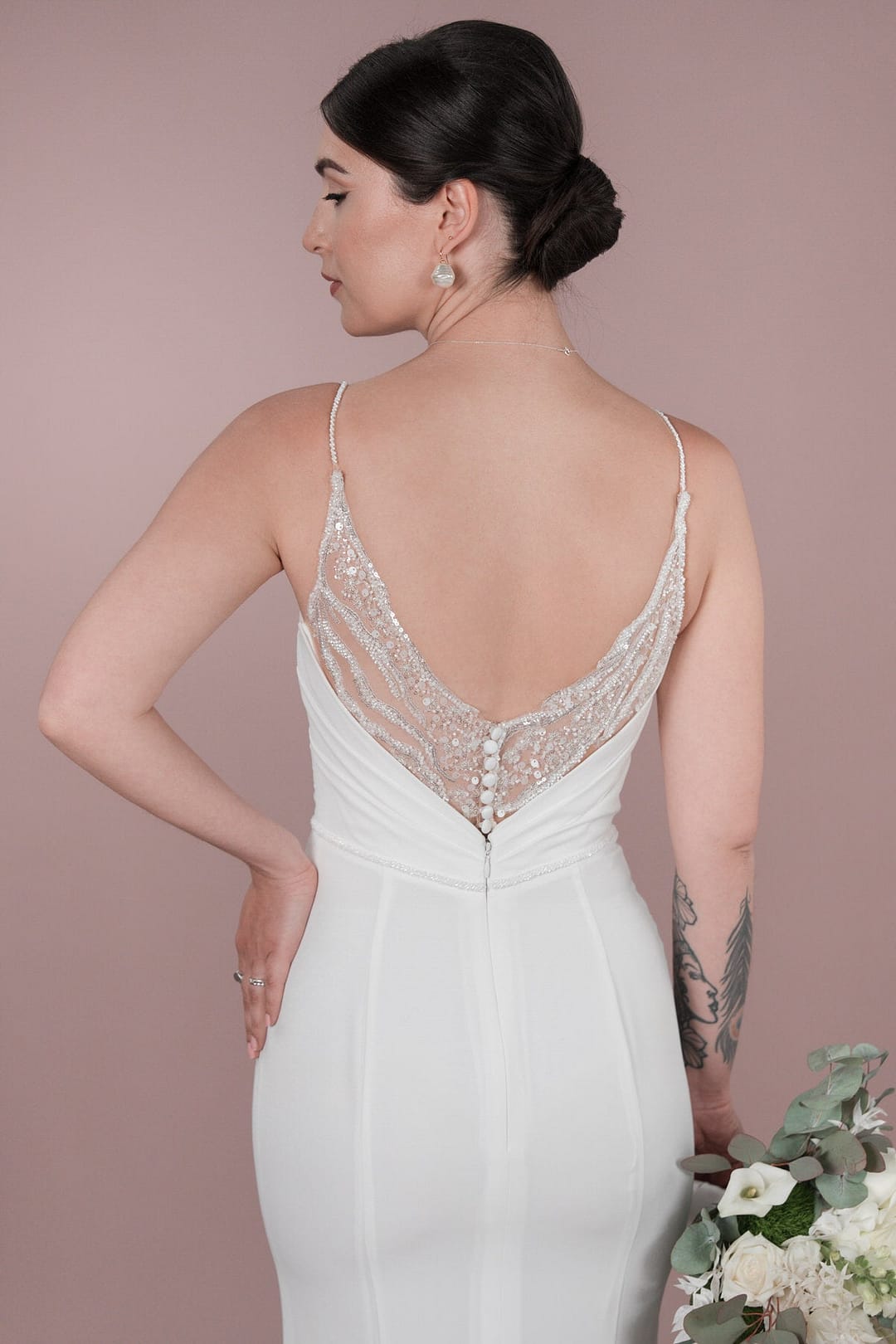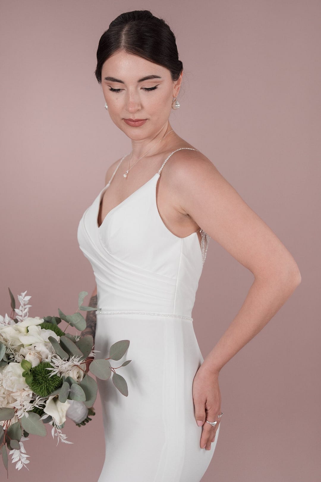 Fühle dich wie eine Bridonista Braut mit diesem schlichten, aber glitzernden Brautkleid. Die Schleppe ist kurz und der Rückenausschnitt in V-Form verleiht einen königlichen Touch. Die Illusion-Tüllverzierung und die geraffte Corsage betonen deine Figur perfekt. Teil der R2L Capsule Kollektion für einen klassischen Look. Jetzt im Standesamt Stil. Es ist ein schlichter und doch funkelnder Stil für die Bridonista Braut. Mit einer kurzen Schleppe und einem V-förmigen Rückenausschnitt fühlt man sich wie eine Königin. Diese schillernde Illusion-Tüllverzierung und die geraffte Corsage werden deine Figur hervorheben. Es ist ein Teil der R2L Capsule Kollektion – einer klassichen Wahl für das Standesamt!