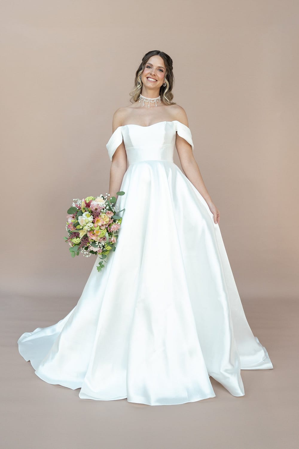 Der herzförmige Carmen-Ausschnitt des Kleides rahmt dein Dekolleté mit einer zarten, femininen Linie ein, die eine subtile Verführung ausstrahlt und deinen Look mit romantischem Charme bereichert. Die abnehmbaren Ärmel bieten dir die Flexibilität, deinen Stil im Handumdrehen zu verändern – von einem verspielten, schulterfreien Look zu einer cleanen, ärmellosen Silhouette, die deine natürliche Ausstrahlung unterstreicht. Der glatte Mikado-Stoff des Rocks fließt in weichen, eleganten Wellen und mündet in eine lange Schleppe, die deinem Auftritt eine majestätische Dramatik verleiht, ohne dich einzuschränken.