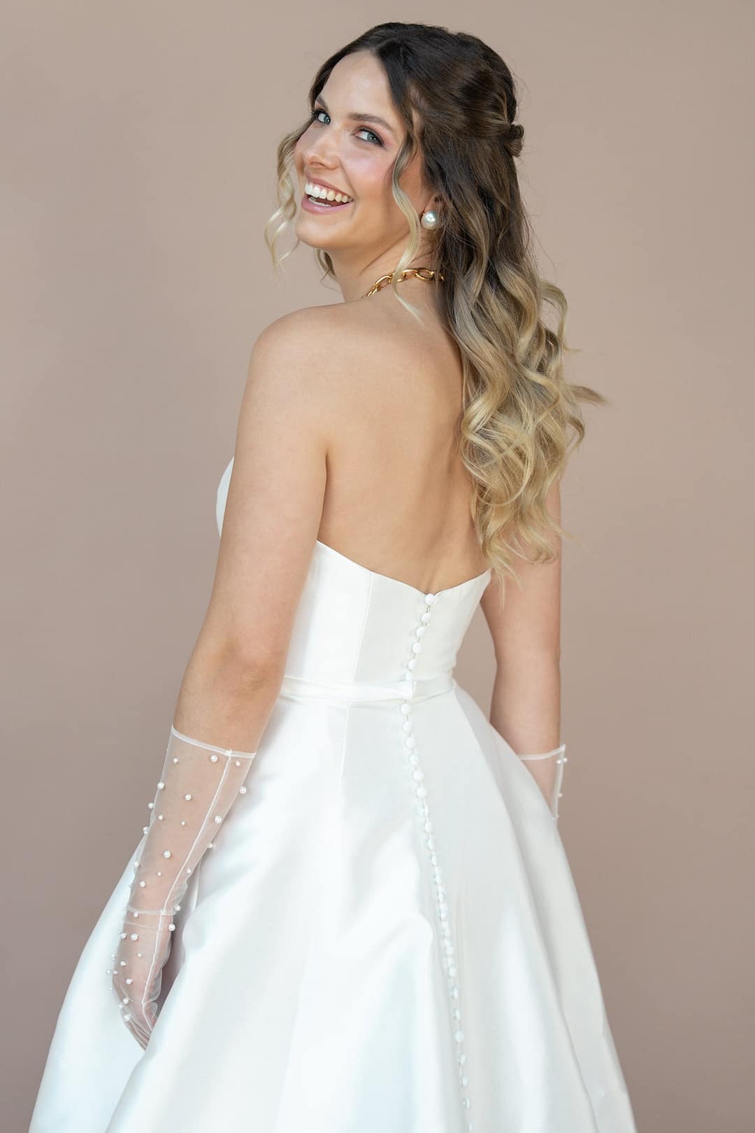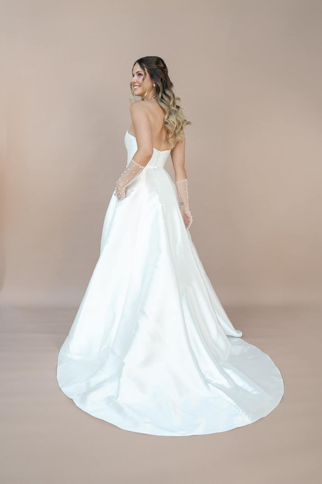 Der Rücken, ebenfalls gerade geschnitten, unterstreicht die minimalistische Ästhetik des Kleides und schafft eine harmonische Balance zwischen Schlichtheit und Eleganz. Jedes Detail des Bridonista R2L26-C-A07 ist darauf ausgelegt, deine Persönlichkeit zu betonen, ohne dich zu überladen. Der glatte Mikado-Stoff verleiht dem Kleid eine cleane, moderne Ausstrahlung, die dennoch tief romantisch wirkt – ein Design, das die Essenz von zeitloser Liebe einfängt.