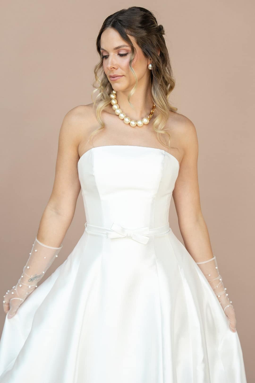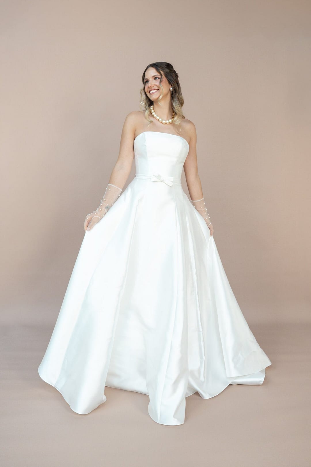 Spüre die luxuriöse Glätte des Mikado-Stoffs, der deine Silhouette wie ein zarter Fluss umspielt, und lass dich von der schlichten Schönheit dieses Kleides tragen. Mit dem Bridonista R2L26-C-A07 wirst du nicht nur eine Braut sein – du wirst eine Vision, die die Herzen aller berührt und deinen Hochzeitstag zu einem zeitlosen Meisterwerk macht.