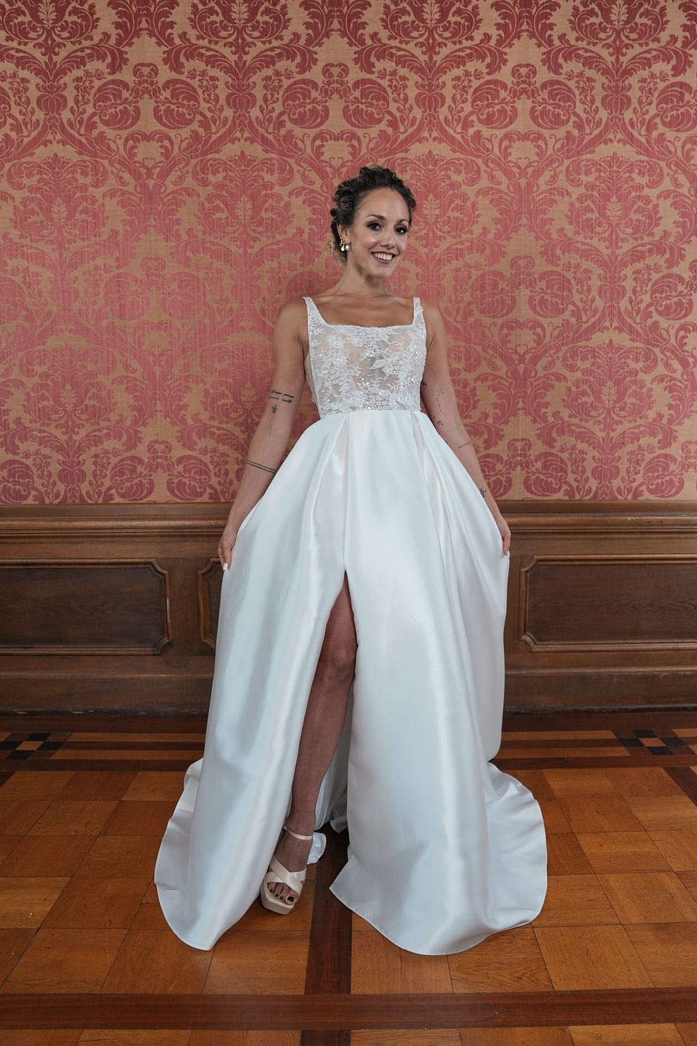 Der gerade Ausschnitt des Kleides rahmt dein Dekolleté mit einer klaren, cleanen Linie ein, die zeitlose Raffinesse ausstrahlt und dein Strahlen in den Mittelpunkt rückt. Die ärmellose Gestaltung unterstreicht die minimalistische Ästhetik, während die Lingerie-Look-Corsage aus zarter Chantilly-Spitze eine subtile Sinnlichkeit hinzufügt. Diese Corsage, mit filigranen Details und dezenten Cutouts an den Seiten, schmiegt sich wie ein Kunstwerk an deine Silhouette und verleiht dem Kleid eine moderne, doch romantische Note.