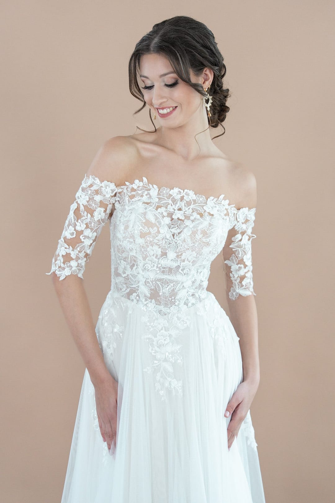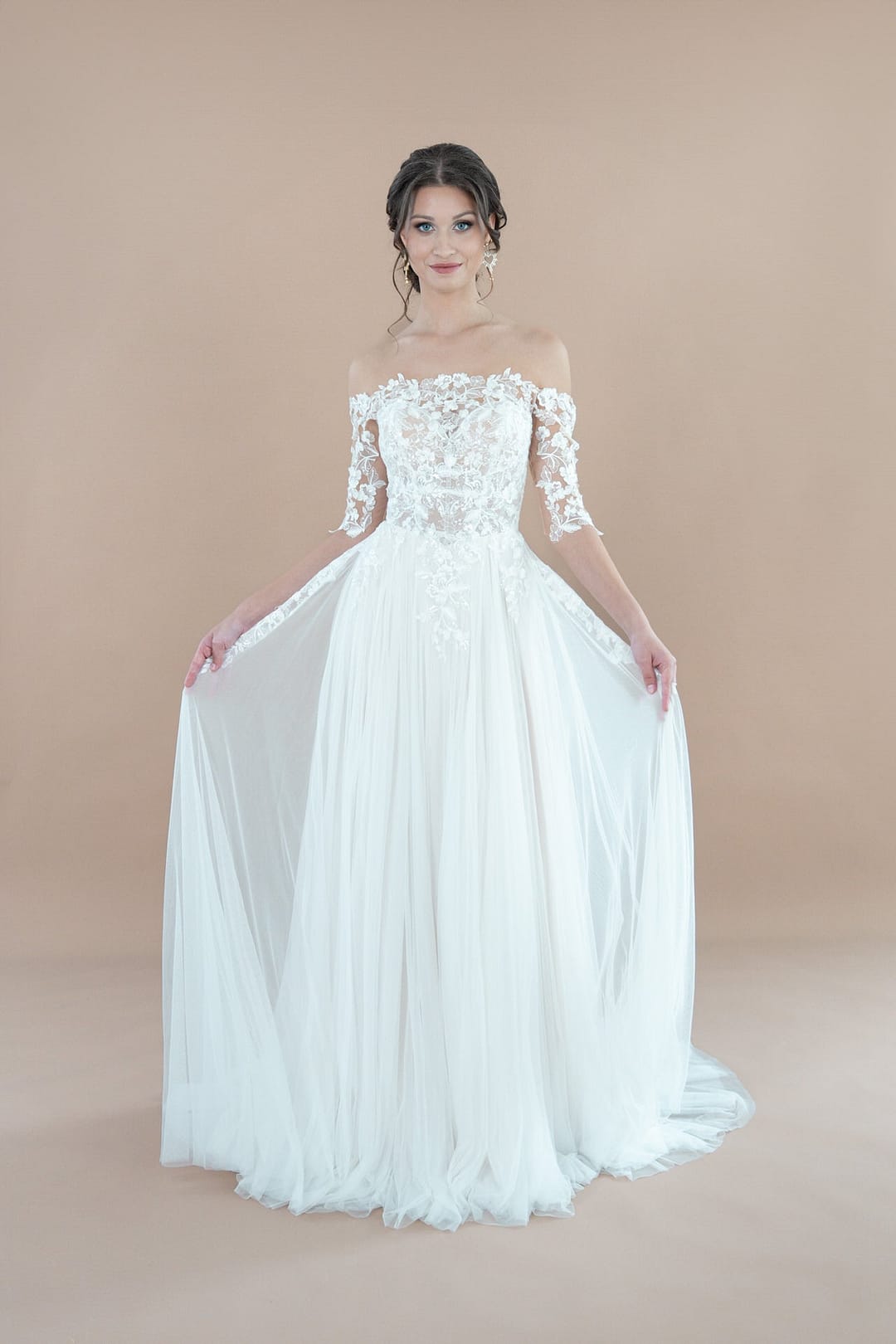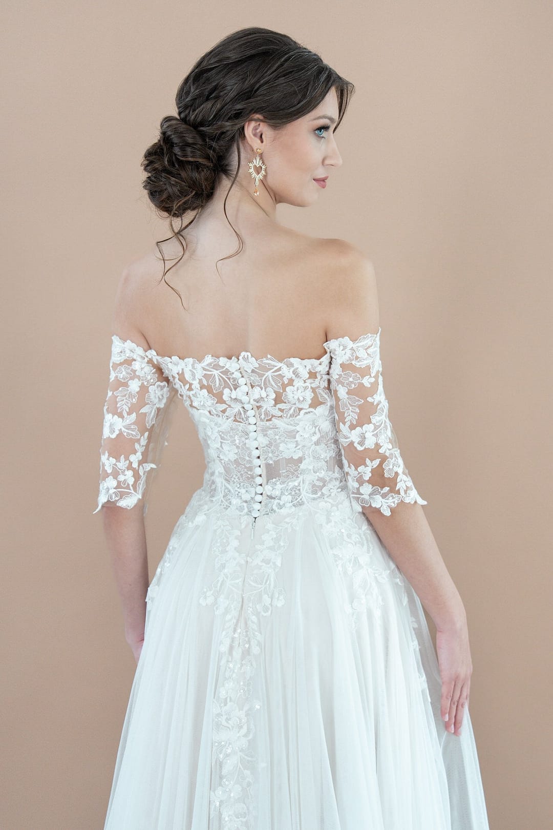 Das Bridonista R2L26-C-A20 begeistert mit seinem A-Linien-Schnitt, der deine Silhouette sanft umfängt und in einen fließenden Rock mit mittellanger Schleppe übergeht – ideal für einen mühelosen, aber anmutigen Auftritt. Der gerade Ausschnitt betont dein Dekolleté auf klassische und romantische Weise, während das Off-the-Shoulder-Design deine Schultern stilvoll freilegt und eine feminine, leichte Ausstrahlung schafft. Kleine Ärmelchen fügen eine verspielte, zarte Note hinzu, die den Look abrundet. Der gerade Rücken, verziert mit einer filigranen Knopfleiste, sorgt für eine cleane, zeitlose Silhouette, die die hochwertige Verarbeitung des Kleides unterstreicht.