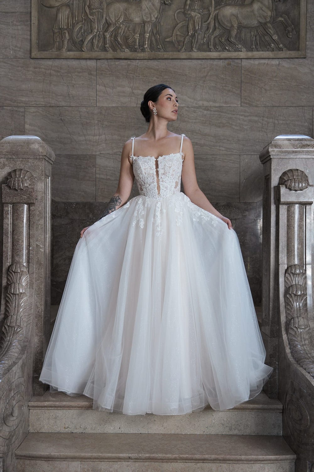 Träumst du von einem Hochzeitskleid, das romantische Eleganz mit floralem Charme und einem Hauch von Sinnlichkeit vereint? Das Bridonista R2L26-C-B03 ist wie für dich geschaffen! Dieses bezaubernde Kleid kombiniert einen klassischen Prinzessinnen-Schnitt mit zarten Spitzen, luftigem Tüll und einem verführerischen Lingerie-Look. Mit seiner langen Schleppe und kunstvollen Verzierungen wirst du in diesem Kleid deinen großen Tag unvergesslich machen.