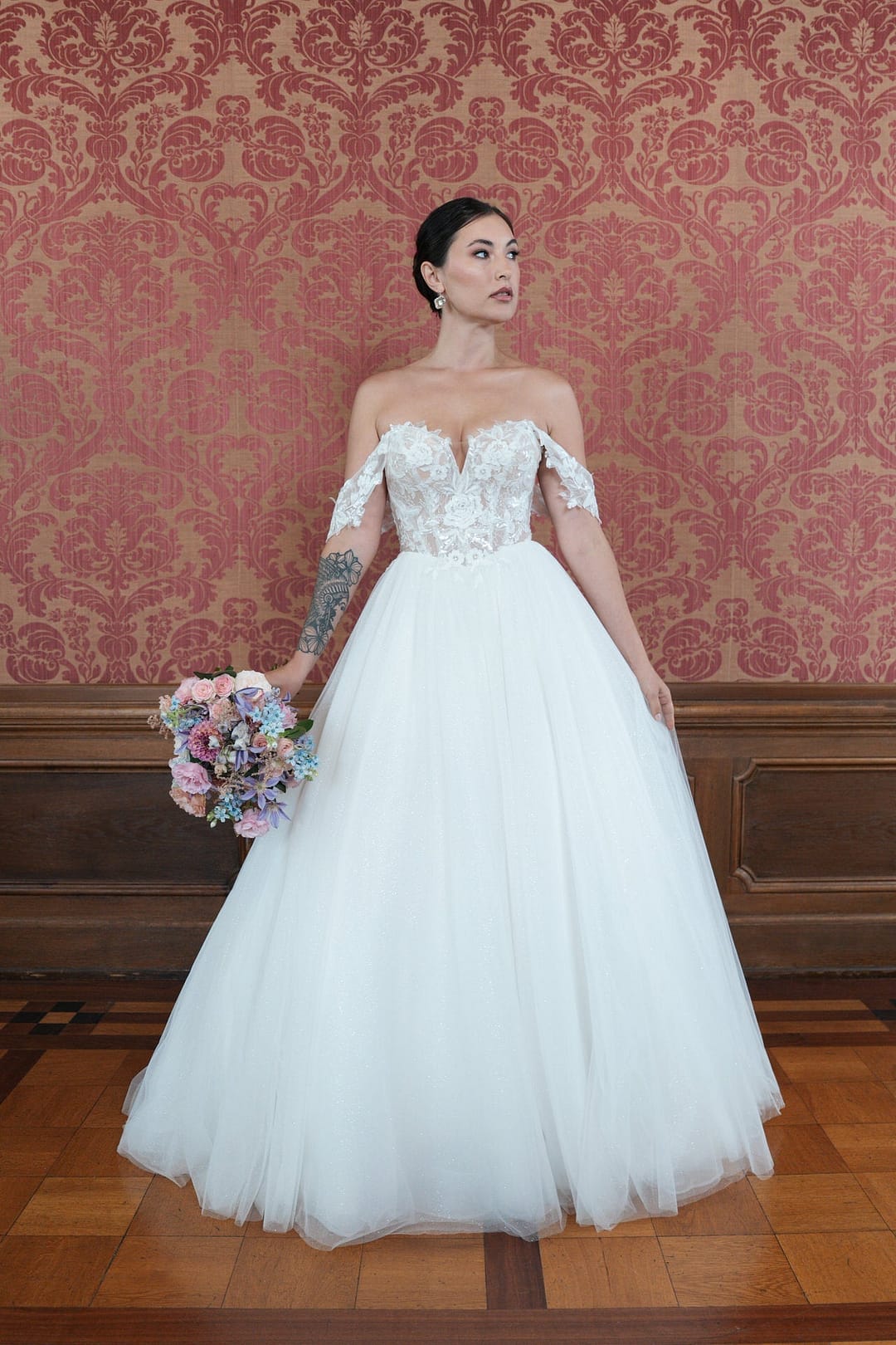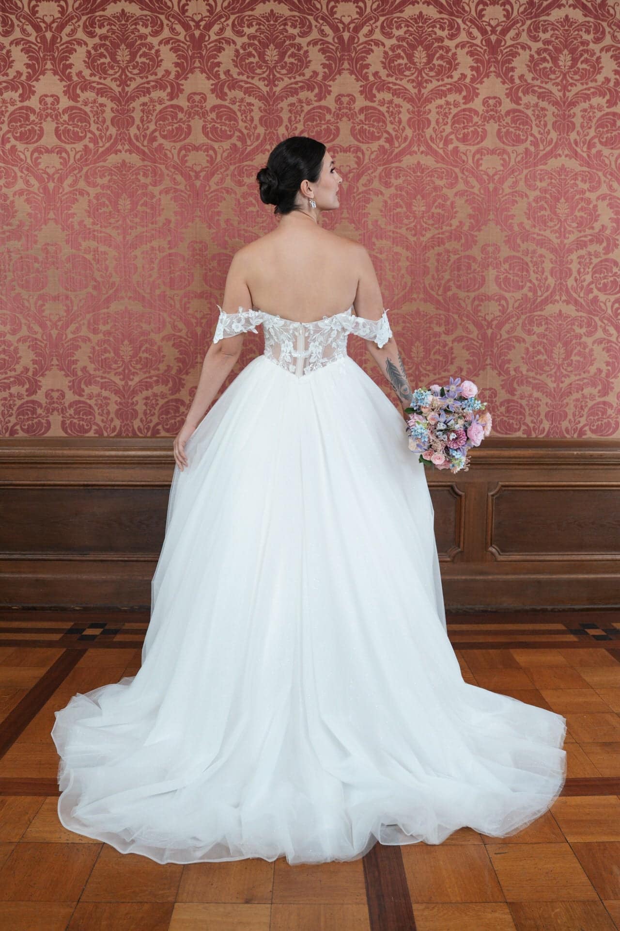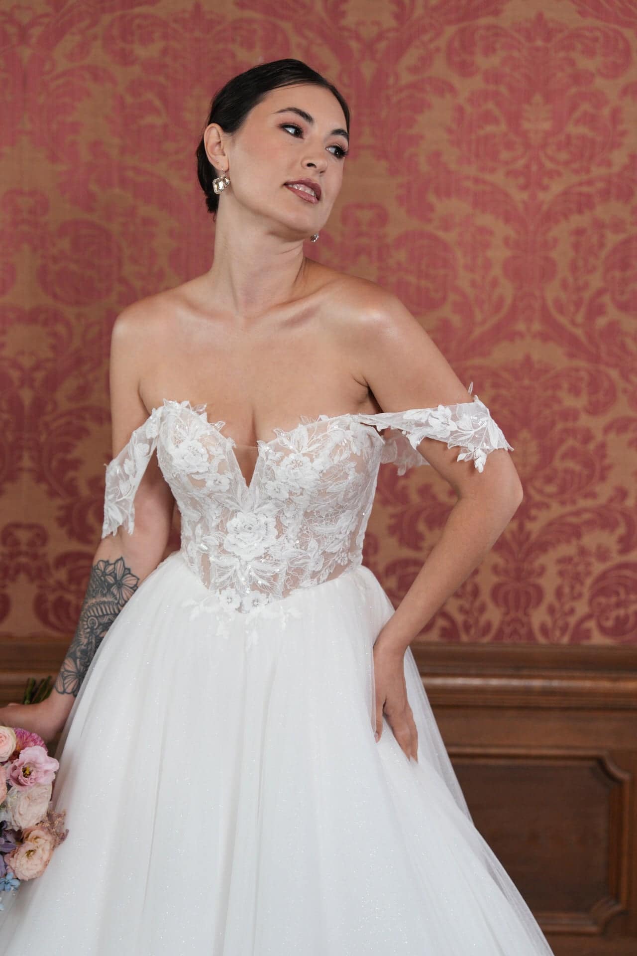 Das Bridonista R2L26-C-B05 begeistert mit seinem romantischen Princess-Schnitt, der deinen Oberkörper sanft umschmeichelt und in einen voluminösen Rock mit mittellanger Schleppe übergeht – perfekt für einen eleganten, aber praktischen Auftritt. Der Carmen-Ausschnitt, kombiniert mit einem zarten Herzausschnitt und einem dezenten V-Ausschnitt, betont dein Dekolleté auf romantische und sinnliche Weise. Das Off-the-Shoulder-Design setzt deine Schultern stilvoll in Szene und verleiht dir eine feminine, elegante Ausstrahlung. Der gerade Rücken sorgt für eine cleane, klassische Silhouette, die die hochwertige Verarbeitung des Kleides unterstreicht.