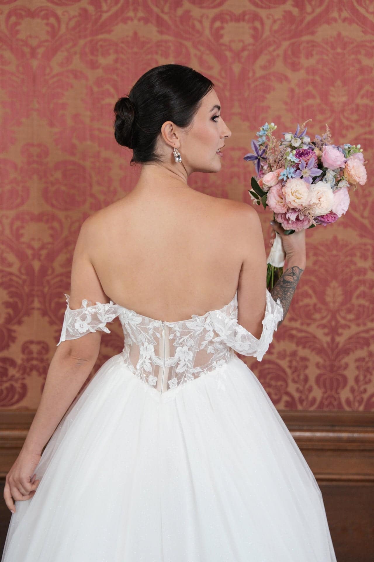 - Off-the-Shoulder-Design: Die freiliegenden Schultern verleihen dir eine romantische und zugleich moderne Ausstrahlung, perfekt für dezenten Schmuck.