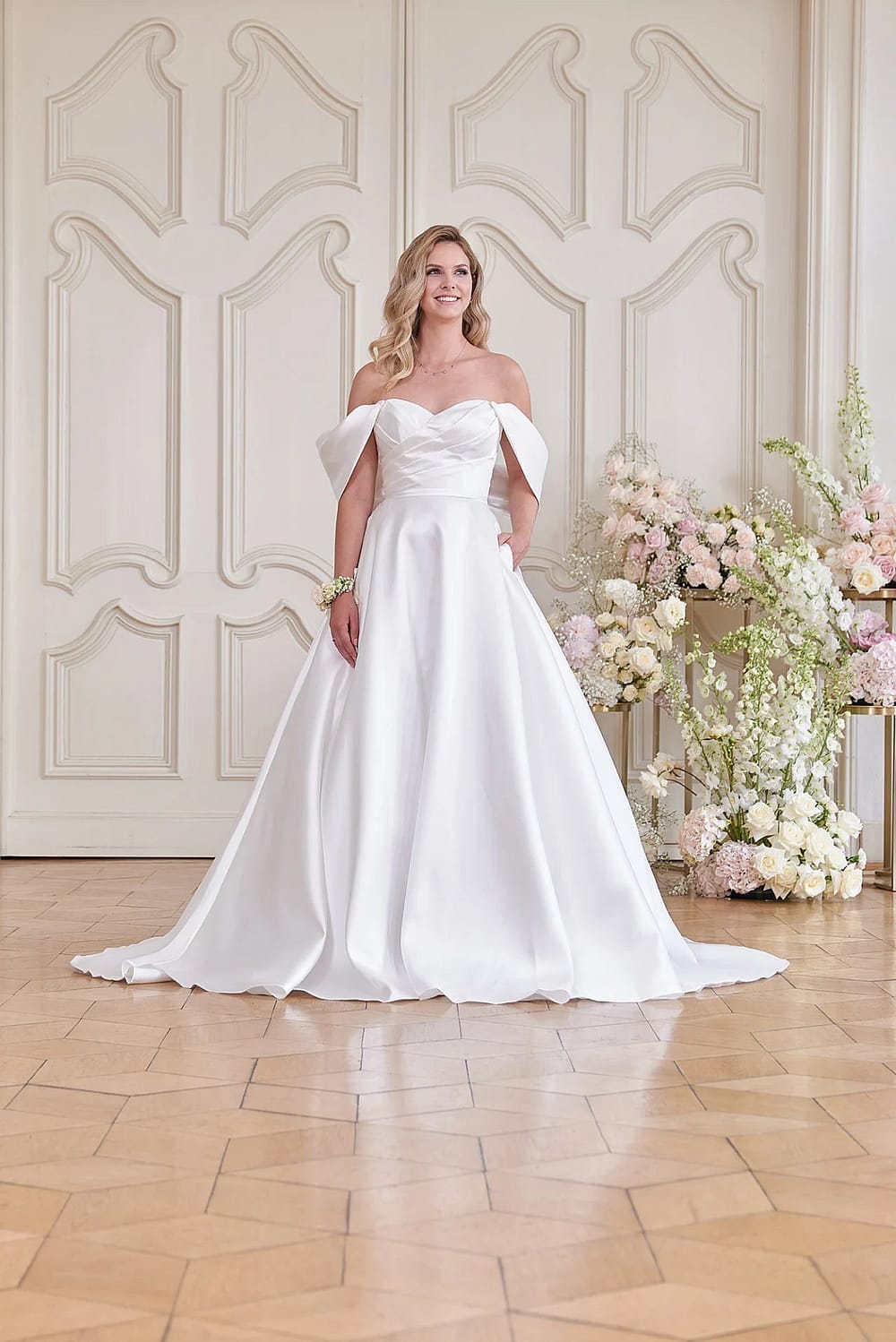 Korsage: Ivory Skiny Mikado, Ivory Lining; – Rock: Elfenbeinfarbener Glanzmikado, elfenbeinfarbenes Innenfutter. Für dieses Modell wurden nur Materialien in Elfenbein verwendet. Dieses Modell ist nur in einer Farbe erhältlich.