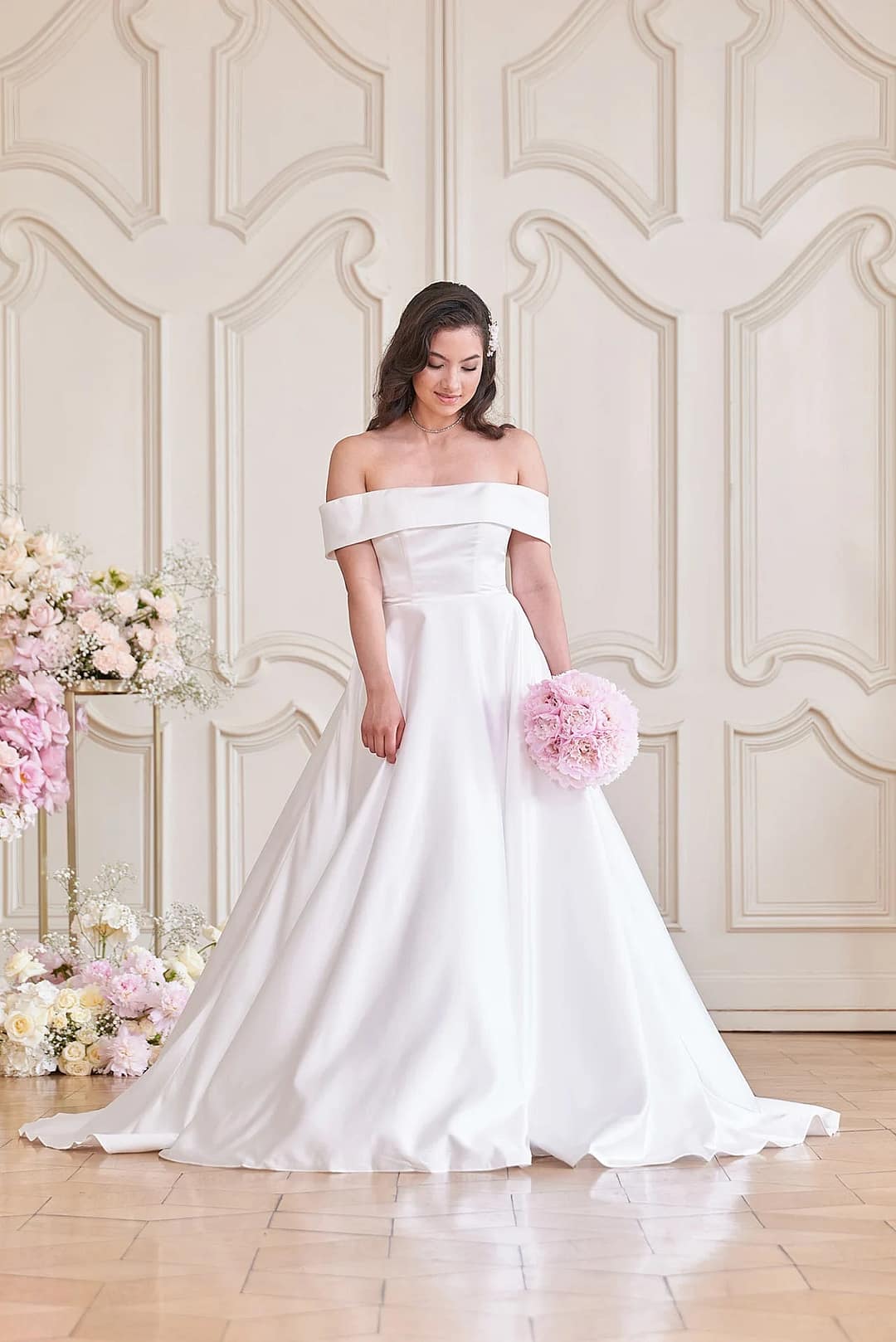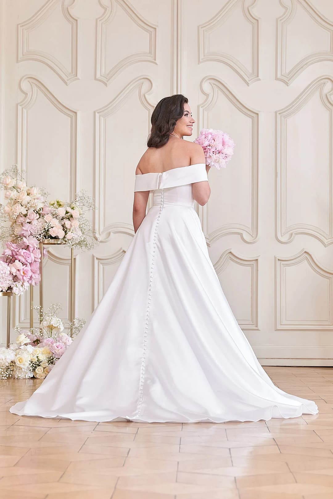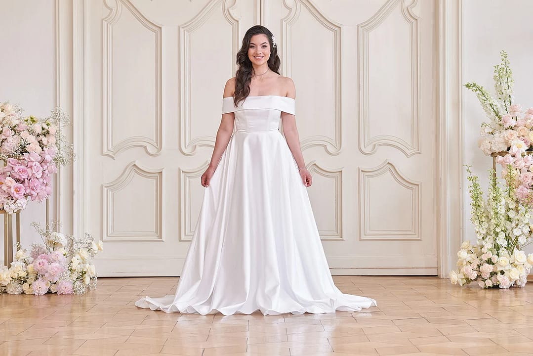 Suche nicht weiter nach deinem Traum Hochzeitskleid! Dieses moderne S24-08 besticht durch sein schlichtes und elegantes Design mit einer schlichten A-Linien-Silhouette und luxuriösem Satin Material. Der schulterfreie Ausschnitt und der gerade geschwungene Halsausschnitt verleihen dem Kleid einen Hauch von modernem Charme, während die Taschen und die Knopfleiste einen Hauch von Praktikabilität und Stil verleihen. Und nicht zu vergessen: die auffällige kurze Schleppe! Mach dich bereit, JA! zu diesem Stunner zu sagen!
