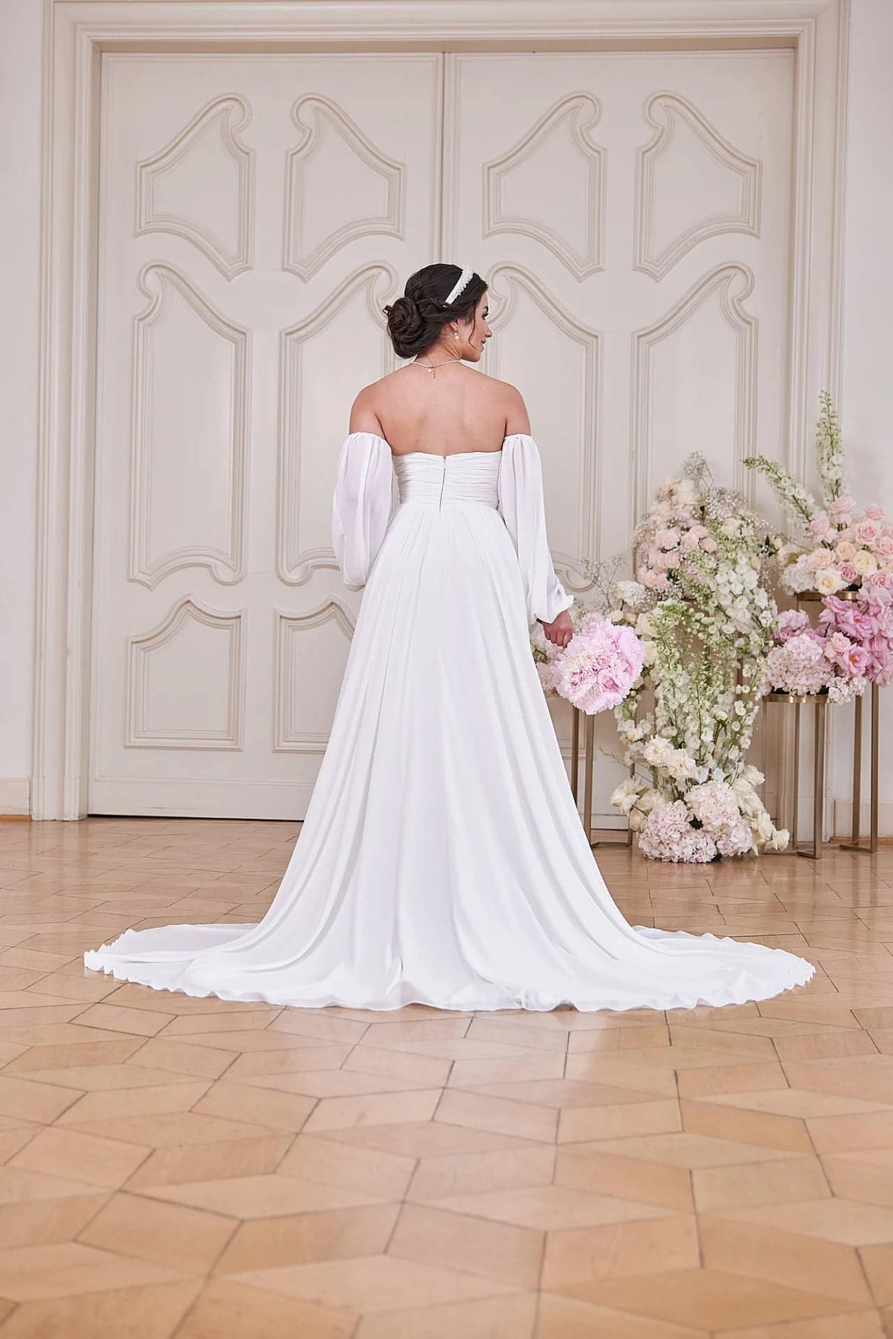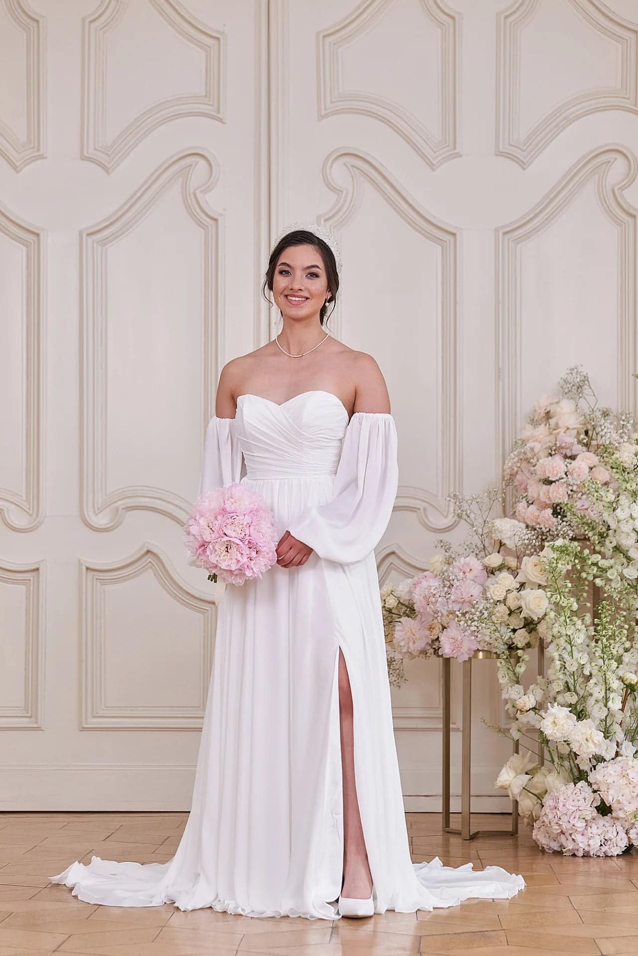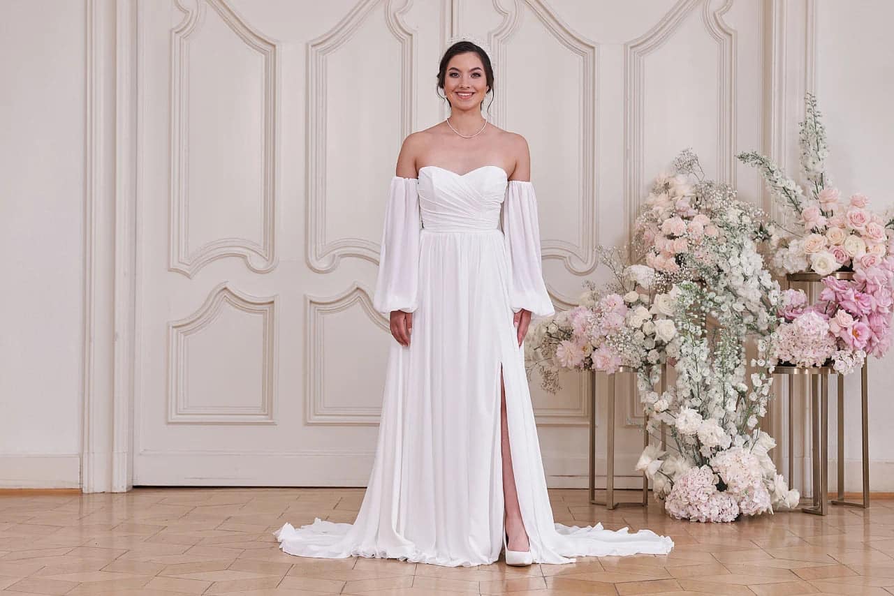 Sorge mit unserem Hochzeitskleid S24-10 für Aufsehen! Mit seinem modernen, schlichten Look und dem Herzchen-Ausschnitt ist dieses elegante Kleid in A-Linie ein echter Hingucker an deinem großen Tag. Mit dem schulterfreien, geraden Rückenausschnitt und den Blousonärmeln wirst du deine Gäste begeistern. Außerdem kannst du zwischen einer Version aus Chiffon oder Seide wählen. Ein Beinschlitz und eine kurze Schleppe verleihen dem Kleid einen zusätzlichen Hauch von Drama!