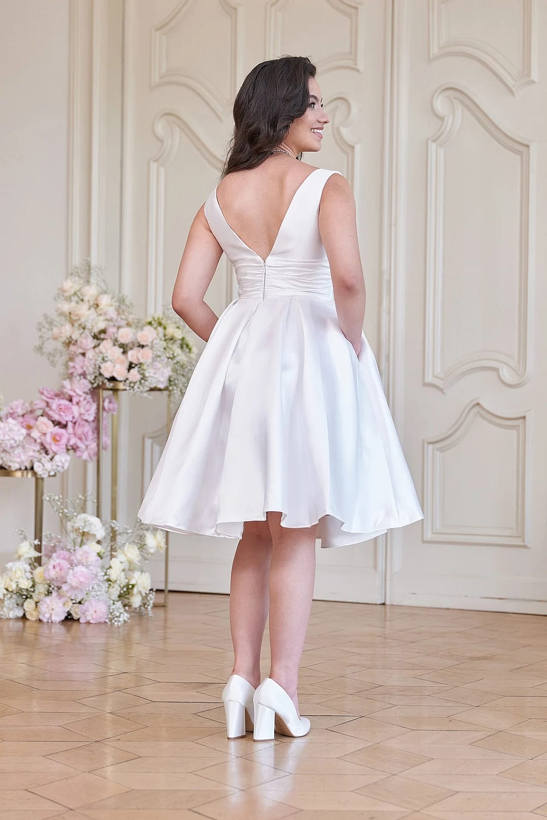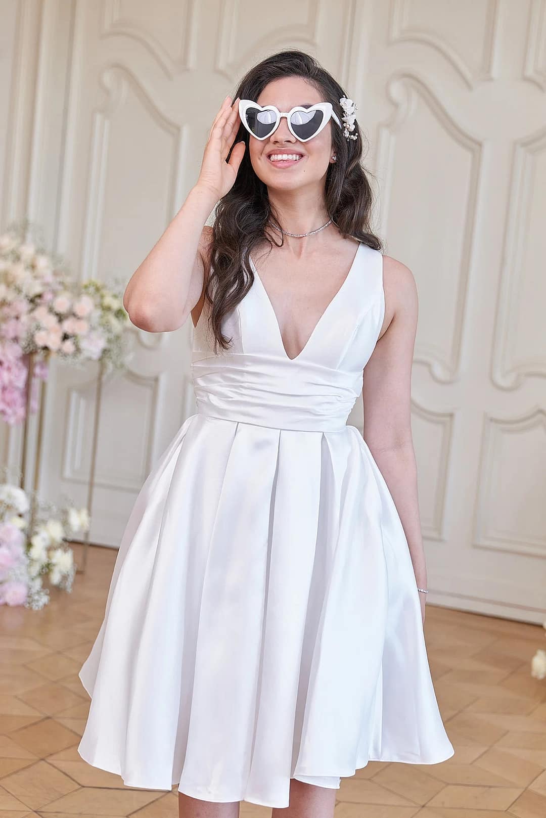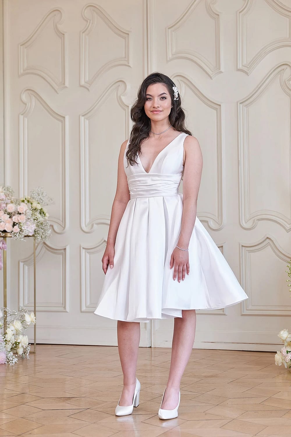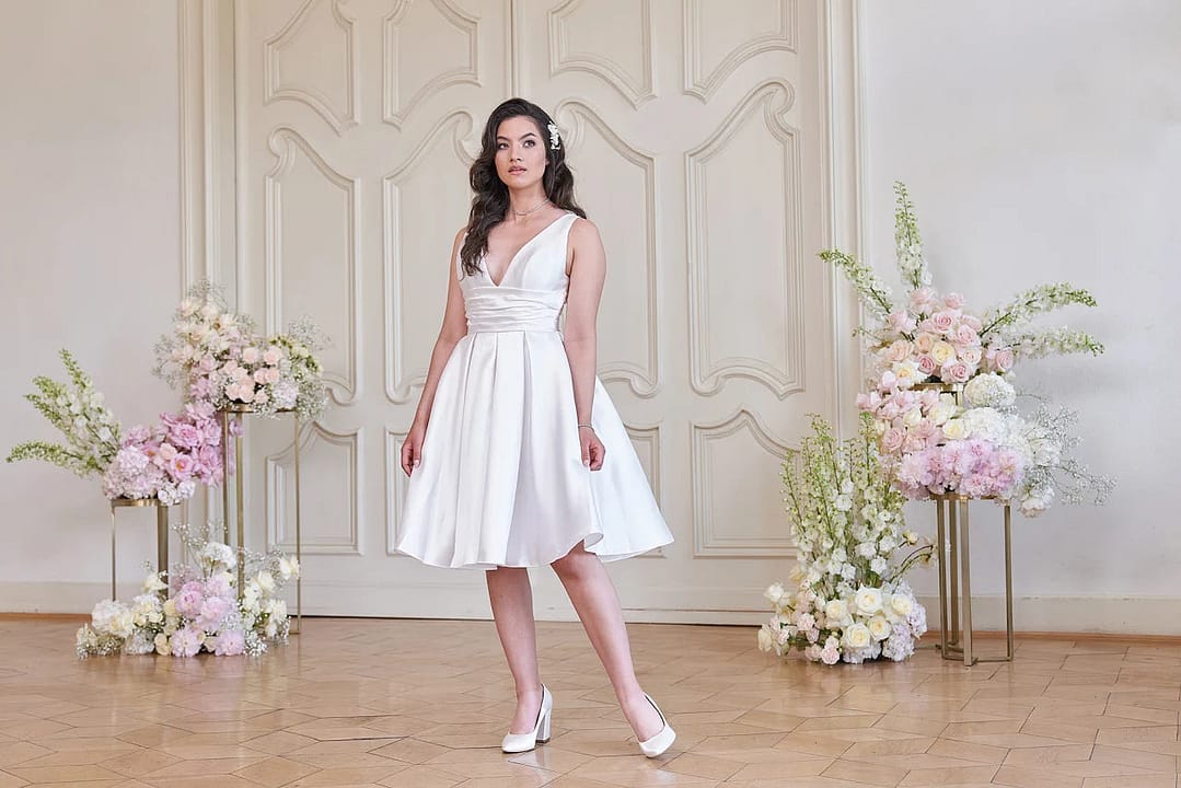 Klassische Eleganz auf moderne Art und Weise! Dieses bezaubernde S24-19 Hochzeitskleid zieht mit seinen schlichten und schlichten Linien, der verspielten A-Linie und den praktischen Taschen alle Blicke auf sich. Mit seinem V-Ausschnitt, den breiten Trägern und der Raffung in der Taille ist diese Miniversion eines zeitlosen Kleides perfekt für jeden Standesamtstermin – egal ob du dich für die knielange oder die teelange Variante entscheidest. #Say Yes!