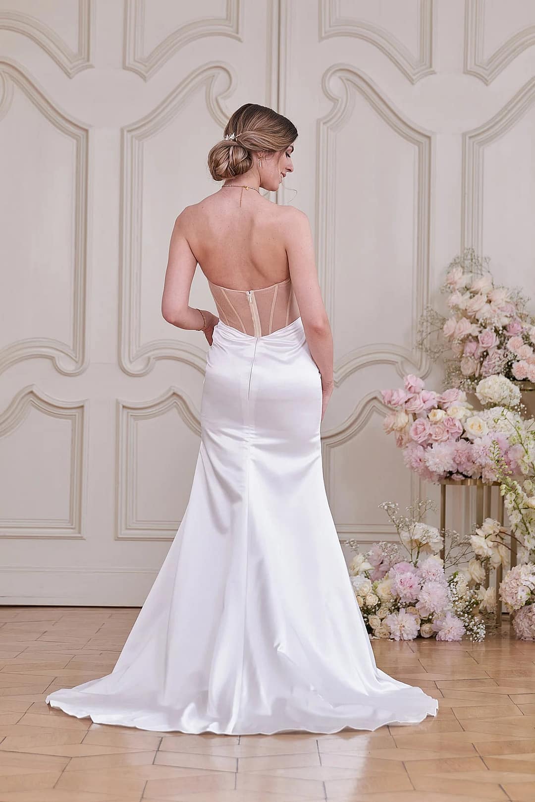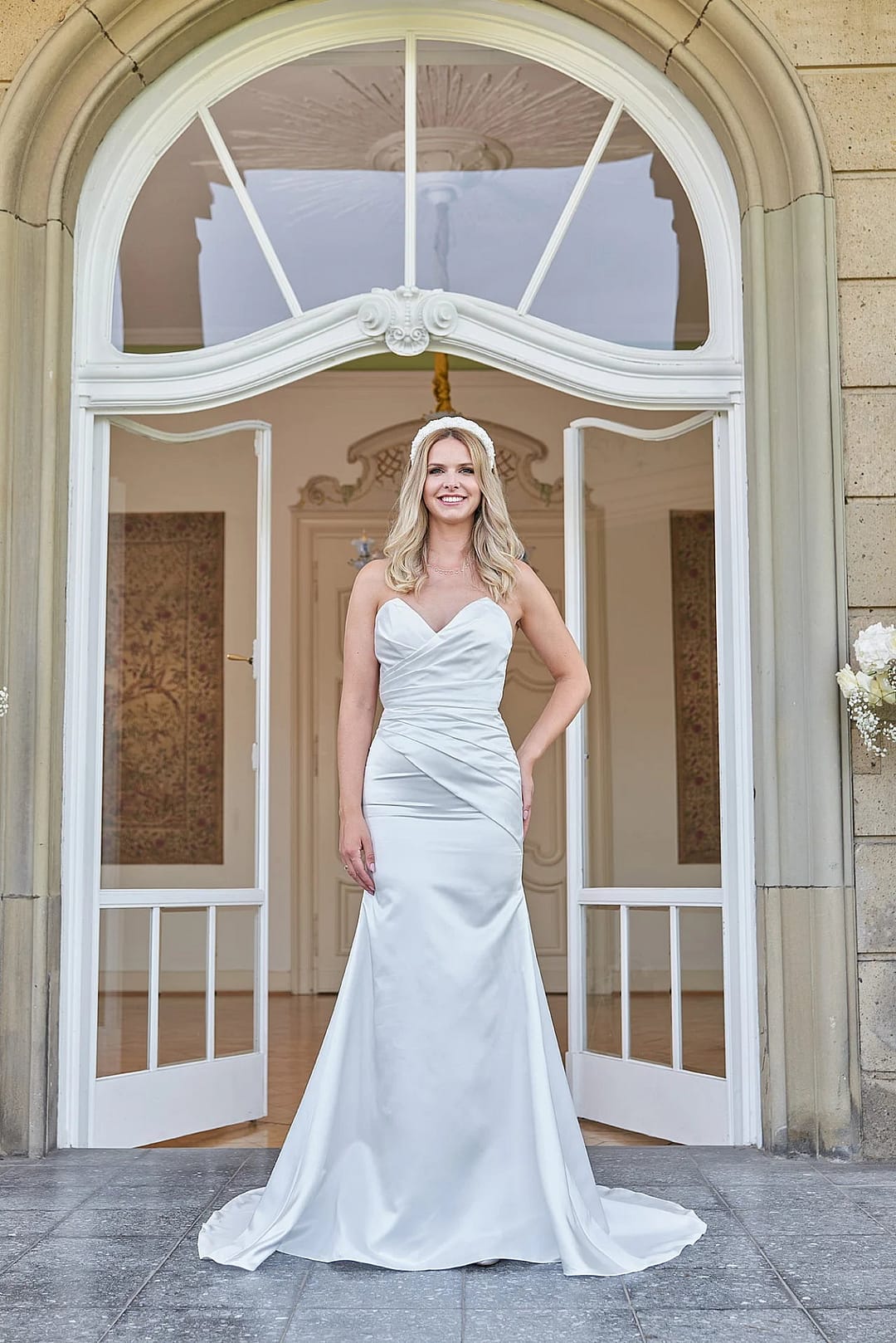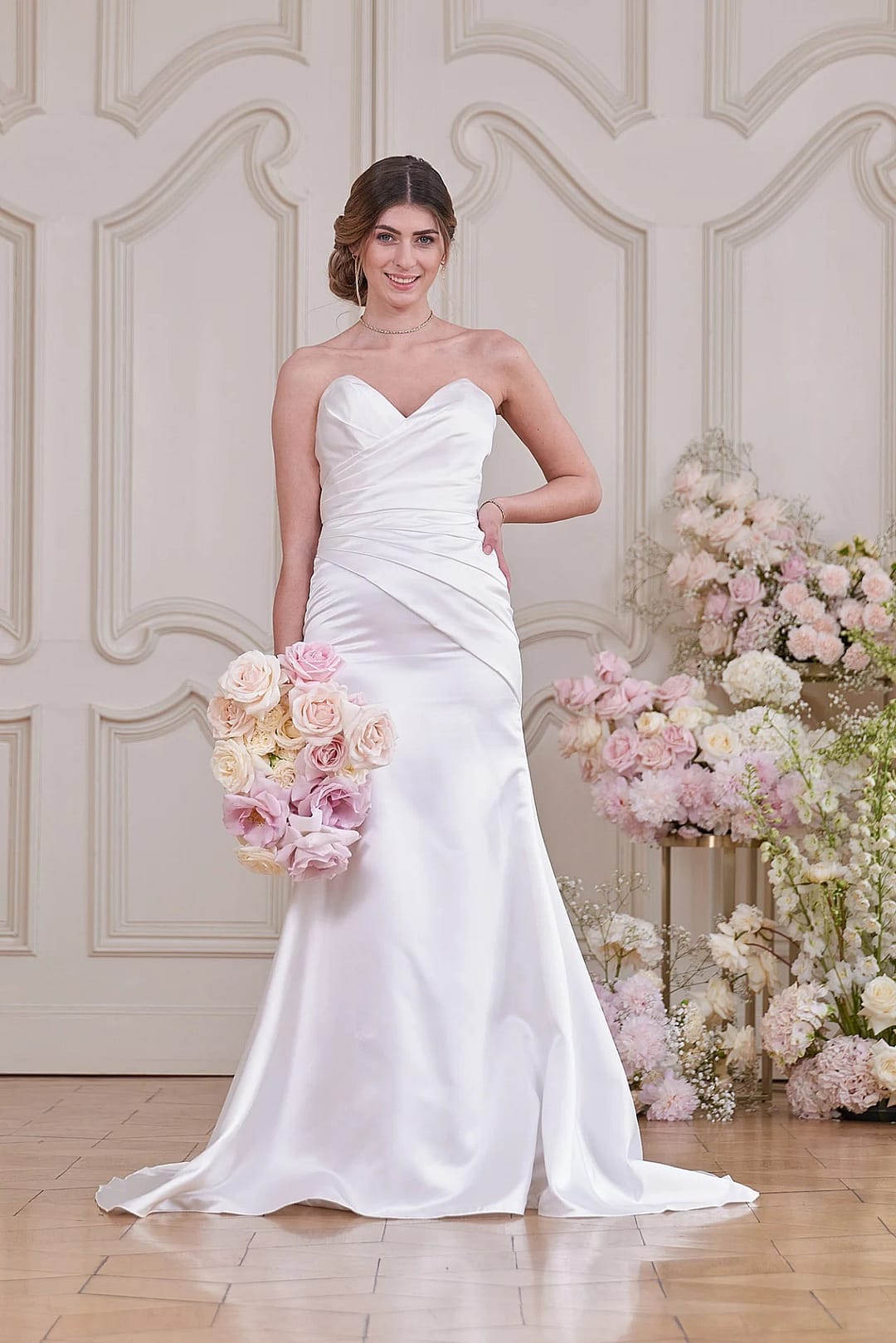 Tritt ins Rampenlicht mit diesem S24-21 Hochzeitskleid! Das aus luxuriösem Satin gefertigte Brautkleid in moderner und eleganter Fit-and-Flare-Silhouette hat einen Herzchen-Ausschnitt, schulterfreie Ärmel, Raffungen an der Korsage, einen transparenten Rücken und Raffungen am Rock sowie eine kurze Schleppe, die für die perfekte Dramatik sorgt. Bist du bereit für dein Ja-Wort? Mit diesem Kleid bist du startklar!