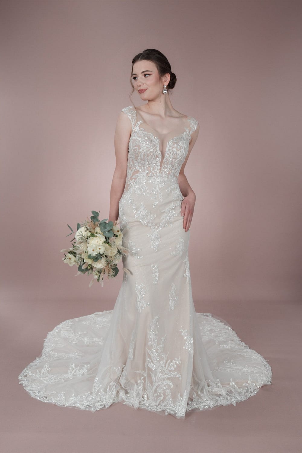 Mit unserem Bridonista Hochzeitskleid aus Tüll in Fit & Flare-Form mit Spitzenträgern und Illusionstüll wirst du alle Blicke auf dich ziehen. Die Carmen-Ausschnitte vorne und hinten sorgen für einen Hauch von Eleganz, während die florale Spitze mit Pailletten und Perlen für einen atemberaubenden und einzigartigen Look sorgt. Erhältlich mit oder ohne Glitzer-Tüll für zusätzlichen Glanz. Mit 12 Stäbchen und seitlichen Ausschnitten bietet dieses Kleid die perfekte Passform. Außerdem hat es Knöpfe und Schlaufen an der Corsage und einen Reißverschluss am Rock für ein einfaches An- und Ausziehen. Mittlere Schleppe (80 cm). Mit unserem Bridonista Hochzeitskleid kannst du deinen besonderen Tag aufwerten! Dieses elegante Brautkleid hat eine Fit & Flare-Form aus Tüll mit Trägern aus Spitze und Illusionstüll für einen atemberaubenden und einzigartigen Look. Die Carmen-Ausschnitte vorne und hinten verleihen dem Kleid einen Hauch von Eleganz! Mit seinen 12 Stäbchen und den seitlichen Ausschnitten bietet dieses Kleid den perfekten Sitz und Komfort. Und für zusätzlichen Glanz wählst du die Option mit Glitzer-Tüll. Mit Knöpfen und Schlaufen an der Corsage und einem Reißverschluss am Rock, der das An- und Ausziehen erleichtert, ist dieses Kleid perfekt, um die ganze Nacht durchzutanzen!
